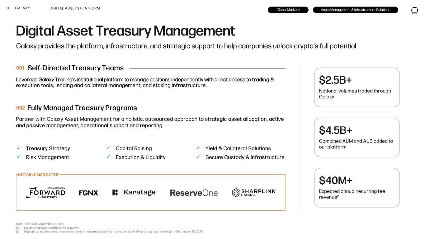 10 GALAXY Asset Management & Infrastructure Solutions Infrastructure Solutions Asset Management DIGITAL ASSETS PLATFORM High-conviction investing across public and private markets in digital assets, blockchain technology, and emerging technology Institutional-grade staking and custody solutions, built for customization and security Staked Assets $6.6B ETFs / ETPs $3.9B Alternatives $4.9B $15B Global Markets Asset Management & Infrastructure Solutions Self -Custody Technology Integrated Tokenization Platform Unlimited Multi-Party Computation Staking Operating System Staking Consulting Staked Assets as Collateral Staking Services 001 Alternatives Venture capital, hedge fund, and liquid token strategies, offering broad exposure to high -growth opportunities across the ecosystem 002 Global ETFs / ETPs Passive and active investment solutions via partnerships with leading institutions 003 Crypto Services Index Construction SPVs/Co -Invests Treasury Mandates Opportunistic Investments 001 Staking Solutions 002 GK8 Secure, institutional -grade self -custody and operational infrastructure solutions KEY PARTNERSHIPS 1 PLATFORM INTEGRATIONS COMBINED AUM & AUS 2 Note: Data as of September 30, 2025, unless otherwise noted. All third-party company product and service names in this presentation are for identification purposes only. The product names, logos, and brands are the property of their respective owners. Use of these names, logos, and brands does not imply endorsement. (1) Inclusive of global partner ETFs/ETPs offered in North America, South America, and Europe and includes private, passive funds which are a different wrapper for similar products Galaxy Asset Management also offers in an ETF structure. (2) Represents combined Assets Under Stake and Assets Under Management. As of September 30, 2025, $2.5 billion of assets are captured within both Assets Under Stake and Alternatives.