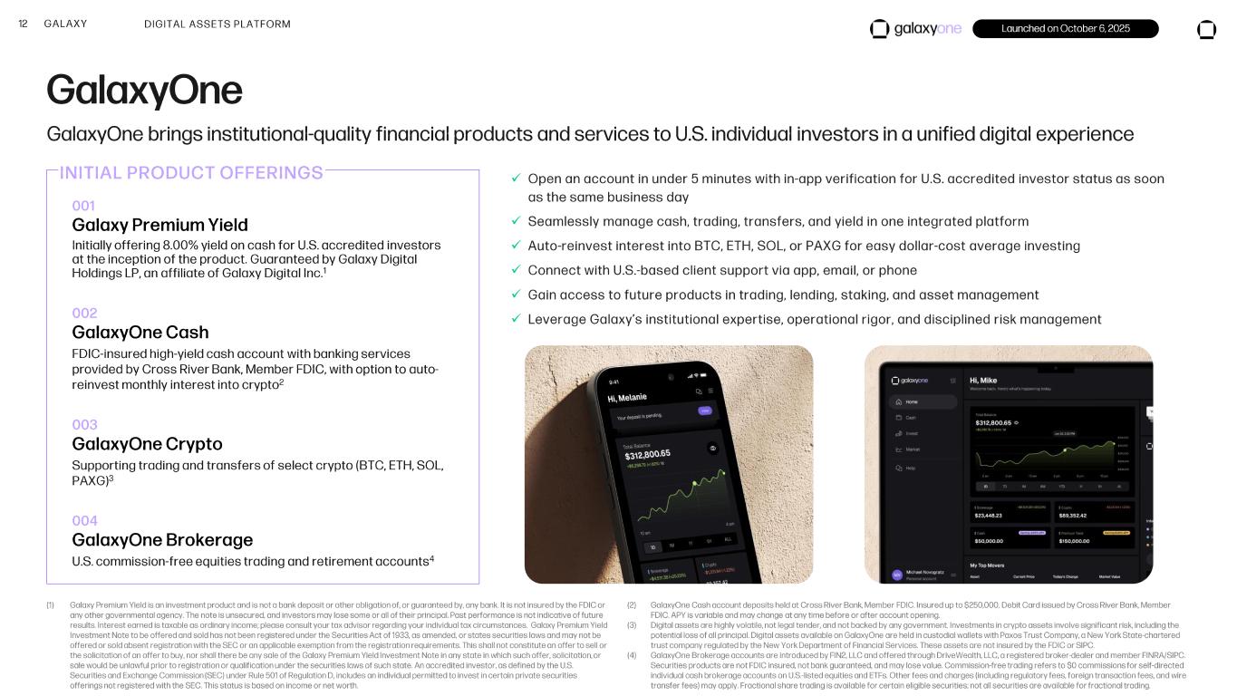 12 GALAXY GalaxyOne GalaxyOne brings institutional -quality financial products and services to U.S. individual investors in a unified digital experie nce Launched on October 6, 2025 001 Galaxy Premium Yield Initially offering 8.00% yield on cash for U.S. accredited investors at the inception of the product. Guaranteed by Galaxy Digital Holdings LP, an affiliate of Galaxy Digital Inc. 1 002 GalaxyOne Cash FDIC -insured high -yield cash account with banking services provided by Cross River Bank , Member FDIC, with option to auto - reinvest monthly interest into crypto 2 003 GalaxyOne Crypto Supporting trading and transfers of select crypto (BTC, ETH, SOL, PAXG) 3 004 GalaxyOne Brokerage U.S. commission -free equities trading and retirement accounts 4 INITIAL PRODUCT OFFERINGS ✓ Open an account in under 5 minutes with in -app verification for U.S. accredited investor status as soon as the same business day ✓ Seamlessly manage cash, trading, transfers, and yield in one integrated platform ✓ Auto -reinvest interest into BTC, ETH, SOL, or PAXG for easy dollar -cost average investing ✓ Connect with U.S. -based client support via app, email, or phone ✓ Gain access to future products in trading, lending, staking, and asset management ✓ Leverage Galaxy’s institutional expertise, operational rigor, and disciplined risk management DIGITAL ASSETS PLATFORM (1) Galaxy Premium Yield is an investment product and is not a bank deposit or other obligation of, or guaranteed by, any bank. I t is not insured by the FDIC or any other governmental agency. The note is unsecured, and investors may lose some or all of their principal. Past performance is not indicative of future results. Interest earned is taxable as ordinary income; please consult your tax advisor regarding your individual tax circums tances. Galaxy Premium Yield Investment Note to be offered and sold has not been registered under the Securities Act of 1933, as amended, or states securi ties laws and may not be offered or sold absent registration with the SEC or an applicable exemption from the registration requirements. This shall no t constitute an offer to sell or the solicitation of an offer to buy, nor shall there be any sale of the Galaxy Premium Yield Investment Note in any state in which such offer, solicitation, or sale would be unlawful prior to registration or qualification under the securities laws of such state. An accredited investor , as defined by the U.S. Securities and Exchange Commission (SEC) under Rule 501 of Regulation D, includes an individual permitted to invest in certai n private securities offerings not registered with the SEC. This status is based on income or net worth. (2) GalaxyOne Cash account deposits held at Cross River Bank , Member FDIC. Insured up to $250,000. Debit Card issued by Cross River Bank , Member FDIC. APY is variable and may change at any time before or after account opening. (3) Digital assets are highly volatile, not legal tender, and not backed by any government. Investments in crypto assets involve sig nificant risk, including the potential loss of all principal. Digital assets available on GalaxyOne are held in custodial wallets with Paxos Trust Company , a New York State -chartered trust company regulated by the New York Department of Financial Services. These assets are not insured by the FDIC or SIPC. (4) GalaxyOne Brokerage accounts are introduced by FIN2, LLC and offered through DriveWealth , LLC, a registered broker -dealer and member FINRA/SIPC. Securities products are not FDIC insured, not bank guaranteed, and may lose value. Commission -free trading refers to $0 commissi ons for self -directed individual cash brokerage accounts on U.S. -listed equities and ETFs. Other fees and charges (including regulatory fees, foreign transaction fees, and wire transfer fees) may apply. Fractional share trading is available for certain eligible securities; not all securities are avail able for fractional trading.