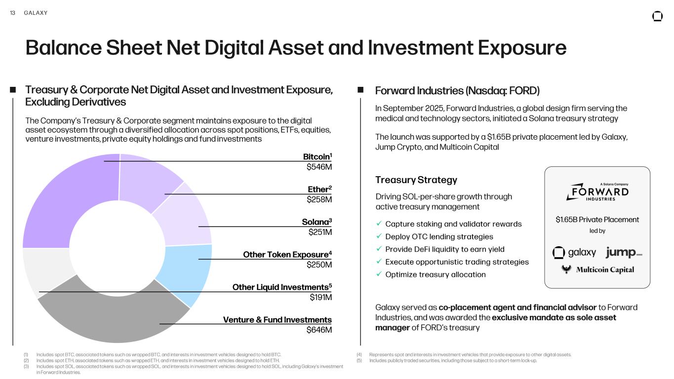 13 GALAXY Balance Sheet Net Digital Asset and Investment Exposure Forward Industries (Nasdaq: FORD) Treasury & Corporate Net Digital Asset and Investment Exposure, Excluding Derivatives The Company’s Treasury & Corporate segment maintains exposure to the digital asset ecosystem through a diversified allocation across spot positions, ETFs, equities, venture investments, private equity holdings and fund investments In September 2025, Forward Industries, a global design firm serving the medical and technology sectors, initiated a Solana treasury strategy The launch was supported by a $1.65B private placement led by Galaxy, Jump Crypto, and Multicoin Capital (1) Includes spot BTC, associated tokens such as wrapped BTC, and interests in investment vehicles designed to hold BTC. (2) Includes spot ETH, associated tokens such as wrapped ETH, and interests in investment vehicles designed to hold ETH. (3) Includes spot SOL, associated tokens such as wrapped SOL, and interests in investment vehicles designed to hold SOL, includin g Galaxy’s investment in Forward Industries. (4) Represents spot and interests in investment vehicles that provide exposure to other digital assets. (5) Includes publicly traded securities, including those subject to a short -term lock-up. Treasury Strategy Driving SOL -per-share growth through active treasury management ✓ Capture staking and validator rewards ✓ Deploy OTC lending strategies ✓ Provide DeFi liquidity to earn yield ✓ Execute opportunistic trading strategies ✓ Optimize treasury allocation $1.65B Private Placement led by Galaxy served as co -placement agent and financial advisor to Forward Industries, and was awarded the exclusive mandate as sole asset manager of FORD’s treasury Bitcoin 1 $546M Ether 2 $258M Solana 3 $251M Venture & Fund Investments $646M Other Token Exposure 4 $250M Other Liquid Investments 5 $191M
