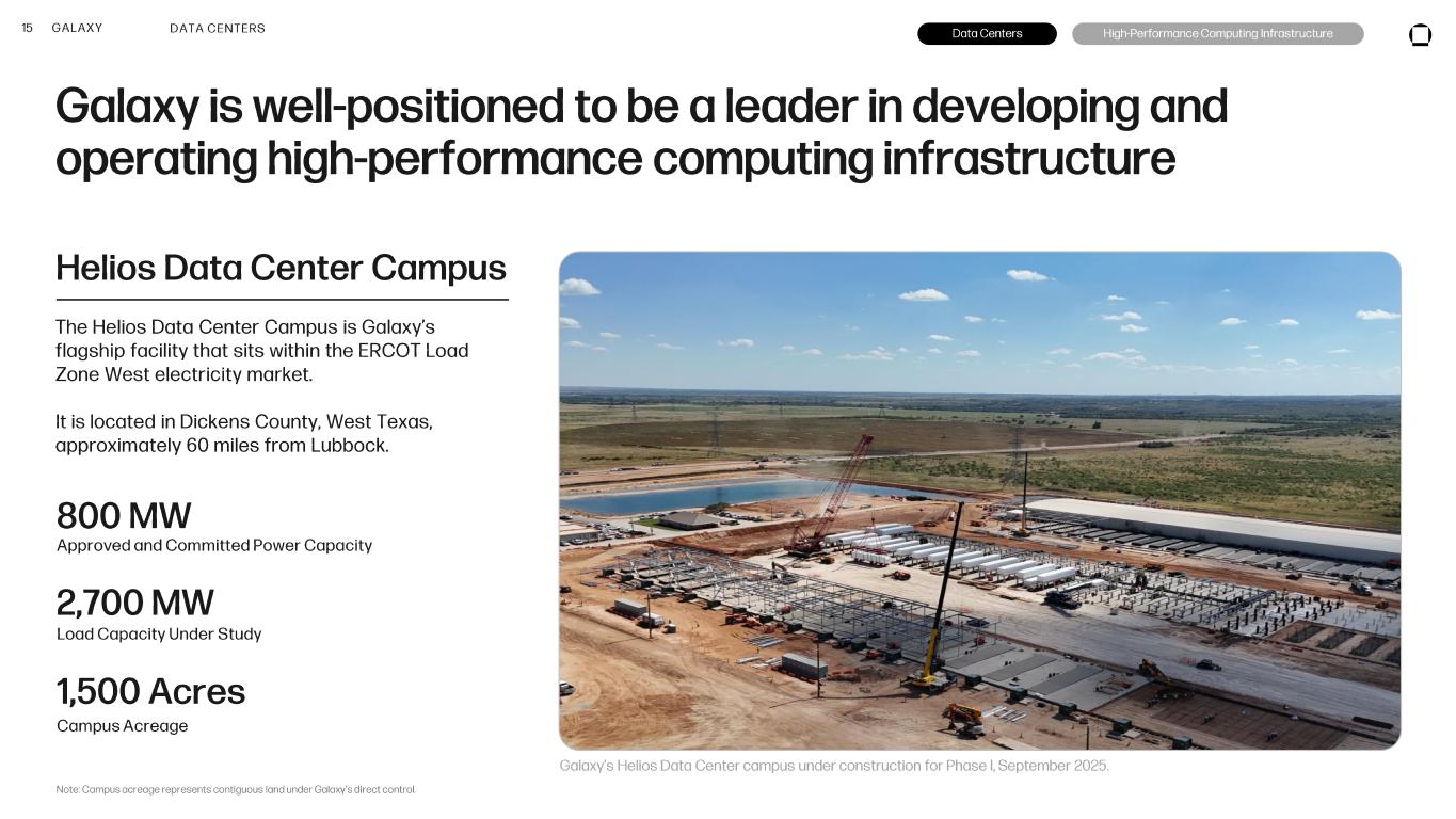 17 GALAXY Helios Construction Update As of September 2025 1 2 4 5 3 7 6 1. Galaxy’s 345 kV substation Our privately owned 345 kV grid connected substation at the Helios campus supporting up to 900 MW of transformer capacity across various phases of the project. 2. Chiller Yard Specialized chiller systems provide temperature -controlled water to direct -liquid - cooling systems in support of both AI workloads and air -cooled portions of the data center building for temperature/humidity control. 4. Electrical Yards The electrical yards supporting the chiller yard and data center building contain critical pre - fabricated electrical infrastructure and emergency backup generation equipment for powering the most advanced AI infrastructure and the systems that support them. 5. Water Facilities On -site groundwater facilities provide raw groundwater, water treatment facilities for campus water needs, and wastewater treatment from the treatment process. 3. Data Center Building Secure, purpose -built facility spanning over 125,000 sq ft in support of AI infrastructure (GPU servers, storage, network , etc.) and the mechanical/electrical galleries to support high - density AI infrastructure and workloads. 7. Cottonwood 345 kV substation Owned by Wind Energy Transmission of Texas (WETT), the Cottonwood 345 kV substation is an integral part of the Competitive Renewable Energy Zone (CREZ) initiative to carry wind power from West Texas to the load centers, like Helios. 4 4 6. Helios Campus Footprint The Helios campus consists of over 1,500 acres of contiguous land under Galaxy’s control for future expansion and construction of data center buildings.