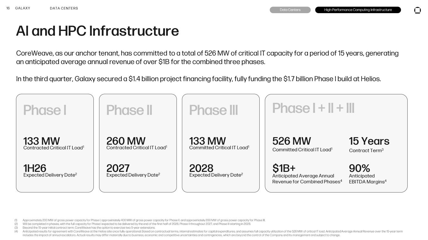 15 GALAXY DATA CENTERS Galaxy is well -positioned to be a leader in developing and operating high -performance computing infrastructure Data Centers High-Performance Computing Infrastructure Note: Campus acreage represents contiguous land under Galaxy’s direct control. Load Capacity Under Study 2,700 MW The Helios Data Center Campus is Galaxy’s flagship facility that sits within the ERCOT Load Zone West electricity market. It is located in Dickens County, West Texas, approximately 60 miles from Lubbock. Helios Data Center Campus 800 MW Approved and Committed Power Capacity 1,500 Acres Campus Acreage Galaxy’s Helios Data Center campus under construction for Phase I, September 2025.
