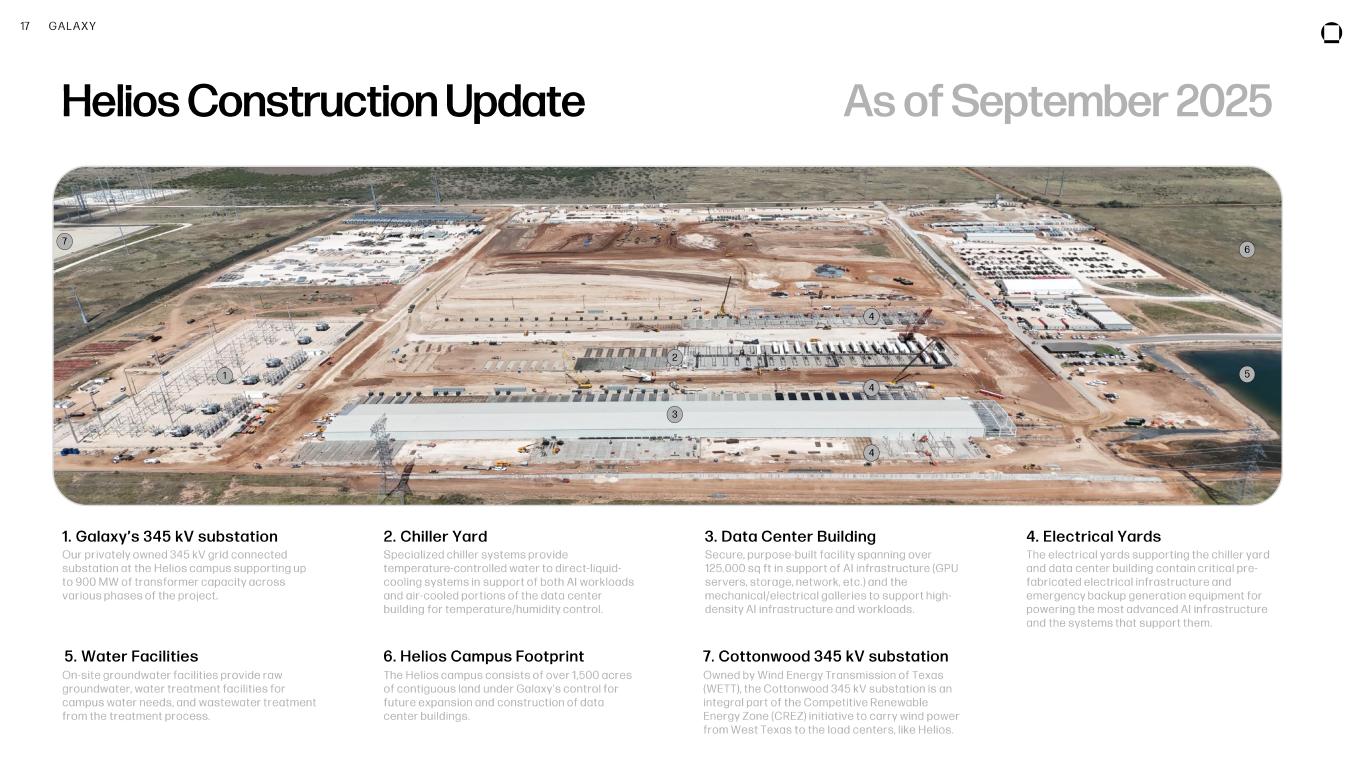 16 GALAXY DATA CENTERS Data Centers High-Performance Computing Infrastructure CoreWeave, as our anchor tenant, has committed to a total of 526 MW of critical IT capacity for a period of 15 years, generating an anticipated average annual revenue of over $1B for the combined three phases. In the third quarter, Galaxy secured a $1.4 billion project financing facility, fully funding the $1.7 billion Phase I build at Helios. AI and HPC Infrastructure Phase I Contracted Critical IT Load 1 133 MW Expected Delivery Date 2 1H26 Phase II Contracted Critical IT Load 1 260 MW Expected Delivery Date 2 2027 Phase I + II + III Anticipated Average Annual Revenue for Combined Phases 4 $1B+ Anticipated EBITDA Margins 4 90% (1) Approximately 200 MW of gross power capacity for Phase I, approximately 400 MW of gross power capacity for Phase II, and appr oximately 200 MW of gross power capacity for Phase III. (2) Will be completed in phases, with the full capacity for Phase I expected to be delivered by the end of the first half of 2026 , Phase II throughout 2027, and Phase III starting in 2028. (3) Beyond the 15-year initial contract term, CoreWeave has the option to exercise two 5 -year extensions. (4) Anticipated results for agreement with CoreWeave at the Helios site once fully operational. Based on contractual terms, internal estimates for ca pital expenditures, and assumes full capacity utilization of the 526 MW of critical IT load. Anticipated Average Annual Revenue over the 15-year term includes the impact of annual escalators. Actual results may differ materially due to business, economic and competitive unce rtainties and contingencies, which are beyond the control of the Company and its management and subject to change. 526 MW Committed Critical IT Load 1 15 Years Contract Term 3 Phase III Committed Critical IT Load 1 133 MW Expected Delivery Date 2 2028