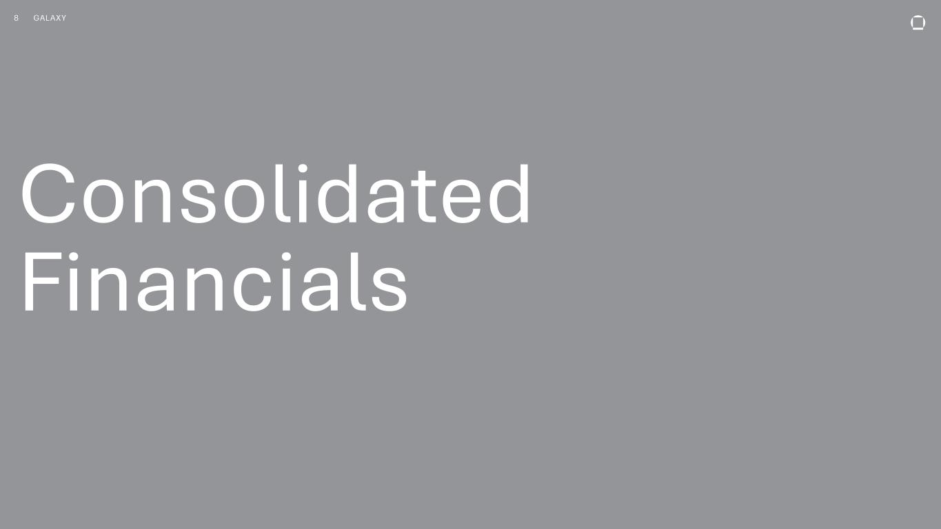 7 GALAXY In May 2025, Galaxy reorganized from a Cayman domiciled, TSX listed company to a U.S./Delaware incorporated firm dual-listed on the TSX and Nasdaq. Galaxy is organized as an Up-C structure, with a publicly traded holding company (Pubco) above an operating partnership, Galaxy Digital Holdings LP (GDH LP) • GDH LP is the operating partnership, which was originally formed in 2018 and redomiciled from the Cayman Islands to Delaware as part of the reorganization • Galaxy Digital Inc. (Pubco) serves as the general partner and consolidates GDH LP for financial reporting • The Pubco is a standard C-corporation listed on the TSX and Nasdaq • Galaxy (Pubco) has two classes of common stock: • Class A common stock – carries both economic and voting rights • Class B common stock – carries voting rights only • Class B shareholders hold their economic interest through LP Units in GDH LP • Class B shares and LP Units are paired one-for-one, and together are exchangeable one-for-one into shares Class A common stock (1) As of December 1, 2025. OPERATING BUSINESS Digital Assets Data Centers Treasury & Corporate GALAXY DIGITAL HOLDINGS LP (GDH LP) PUBLIC SHAREHOLDERS FOUNDERS & LPS 49% 51% GALAXY DIGITAL INC. (NASDAQ/TSX: GLXY) LP Units Class B StockClass A Stock General Partner 1 1 Corporate Structure
