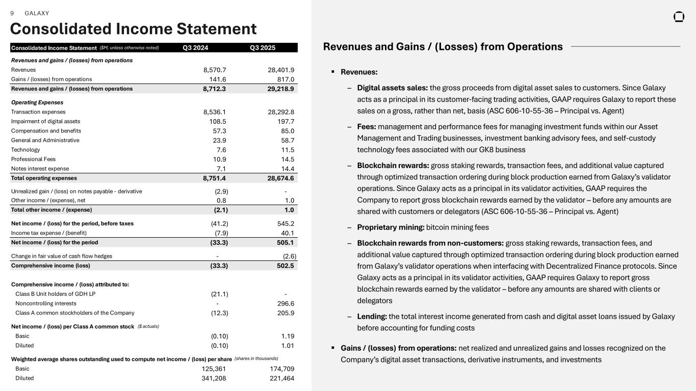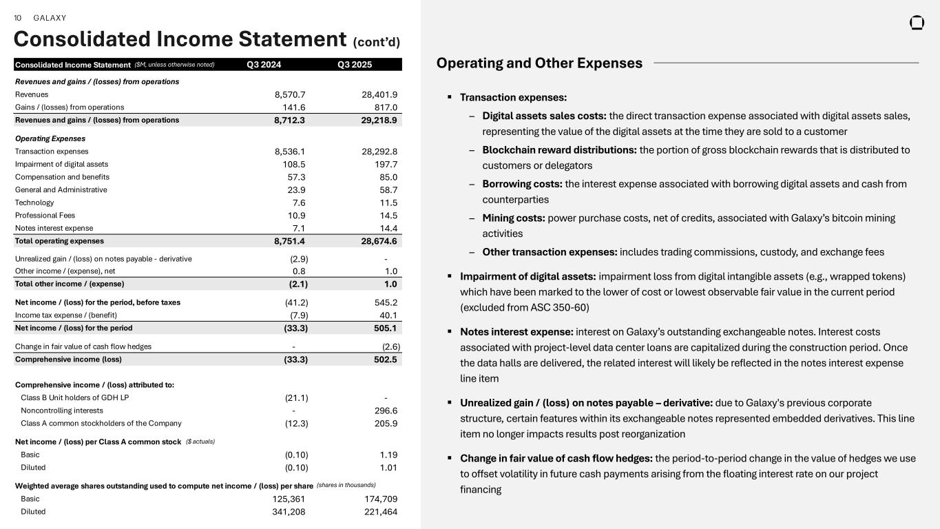 9 GALAXY Consolidated Income Statement ▪ Revenues: – Digital assets sales: the gross proceeds from digital asset sales to customers. Since Galaxy acts as a principal in its customer-facing trading activities, GAAP requires Galaxy to report these sales on a gross, rather than net, basis (ASC 606-10-55-36 – Principal vs. Agent) – Fees: management and performance fees for managing investment funds within our Asset Management and Trading businesses, investment banking advisory fees, and self-custody technology fees associated with our GK8 business – Blockchain rewards: gross staking rewards, transaction fees, and additional value captured through optimized transaction ordering during block production earned from Galaxy’s validator operations. Since Galaxy acts as a principal in its validator activities, GAAP requires the Company to report gross blockchain rewards earned by the validator – before any amounts are shared with customers or delegators (ASC 606-10-55-36 – Principal vs. Agent) – Proprietary mining: bitcoin mining fees – Blockchain rewards from non-customers: gross staking rewards, transaction fees, and additional value captured through optimized transaction ordering during block production earned from Galaxy’s validator operations when interfacing with Decentralized Finance protocols. Since Galaxy acts as a principal in its validator activities, GAAP requires Galaxy to report gross blockchain rewards earned by the validator – before any amounts are shared with clients or delegators – Lending: the total interest income generated from cash and digital asset loans issued by Galaxy before accounting for funding costs ▪ Gains / (losses) from operations: net realized and unrealized gains and losses recognized on the Company’s digital asset transactions, derivative instruments, and investments Consolidated Income Statement Q3 2024 Q3 2025 Revenues and gains / (losses) from operations Revenues 8,570.7 28,401.9 Gains / (losses) from operations 141.6 817.0 Revenues and gains / (losses) from operations 8,712.3 29,218.9 Operating Expenses Transaction expenses 8,536.1 28,292.8 Impairment of digital assets 108.5 197.7 Compensation and benefits 57.3 85.0 General and Administrative 23.9 58.7 Technology 7.6 11.5 Professional Fees 10.9 14.5 Notes interest expense 7.1 14.4 Total operating expenses 8,751.4 28,674.6 Unrealized gain / (loss) on notes payable - derivative (2.9) - Other income / (expense), net 0.8 1.0 Total other income / (expense) (2.1) 1.0 Net income / (loss) for the period, before taxes (41.2) 545.2 Income tax expense / (benefit) (7.9) 40.1 Net income / (loss) for the period (33.3) 505.1 Change in fair value of cash flow hedges - (2.6) Comprehensive income (loss) (33.3) 502.5 Comprehensive income / (loss) attributed to: Class B Unit holders of GDH LP (21.1) - Noncontrolling interests - 296.6 Class A common stockholders of the Company (12.3) 205.9 Net income / (loss) per Class A common stock Basic (0.10) 1.19 Diluted (0.10) 1.01 Weighted average shares outstanding used to compute net income / (loss) per share Basic 125,361 174,709 Diluted 341,208 221,464 Revenues and Gains / (Losses) from Operations ($M, unless otherwise noted) (shares in thousands) ($ actuals)