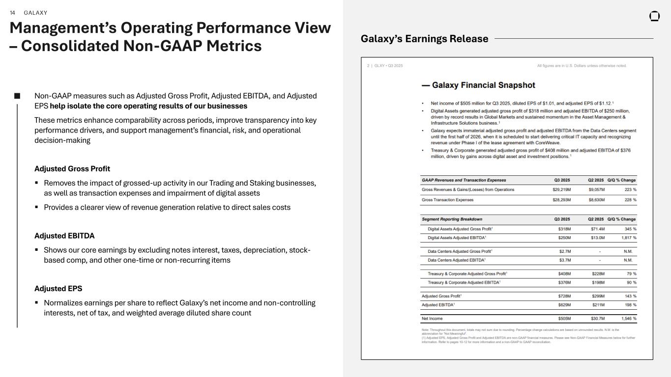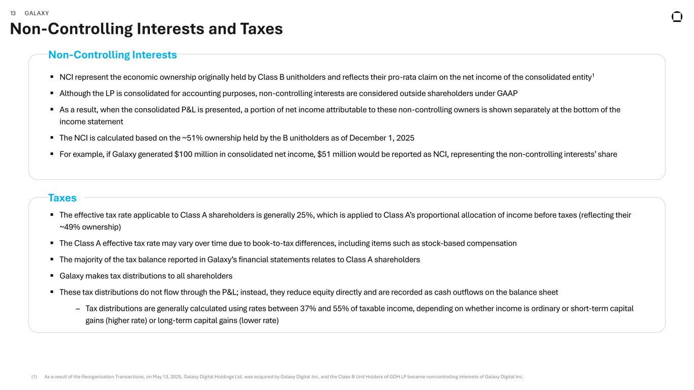 13 GALAXY Non-Controlling Interests and Taxes Non-Controlling Interests ▪ NCI represent the economic ownership originally held by Class B unitholders and reflects their pro-rata claim on the net income of the consolidated entity1 ▪ Although the LP is consolidated for accounting purposes, non-controlling interests are considered outside shareholders under GAAP ▪ As a result, when the consolidated P&L is presented, a portion of net income attributable to these non-controlling owners is shown separately at the bottom of the income statement ▪ The NCI is calculated based on the ~51% ownership held by the B unitholders as of December 1, 2025 ▪ For example, if Galaxy generated $100 million in consolidated net income, $51 million would be reported as NCI, representing the non-controlling interests’ share Taxes ▪ The effective tax rate applicable to Class A shareholders is generally 25%, which is applied to Class A’s proportional allocation of income before taxes (reflecting their ~49% ownership) ▪ The Class A effective tax rate may vary over time due to book-to-tax differences, including items such as stock-based compensation ▪ The majority of the tax balance reported in Galaxy’s financial statements relates to Class A shareholders ▪ Galaxy makes tax distributions to all shareholders ▪ These tax distributions do not flow through the P&L; instead, they reduce equity directly and are recorded as cash outflows on the balance sheet – Tax distributions are generally calculated using rates between 37% and 55% of taxable income, depending on whether income is ordinary or short-term capital gains (higher rate) or long-term capital gains (lower rate) (1) As a result of the Reorganization Transactions, on May 13, 2025, Galaxy Digital Holdings Ltd. was acquired by Galaxy Digital Inc. and the Class B Unit Holders of GDH LP became noncontrolling interests of Galaxy Digital Inc.