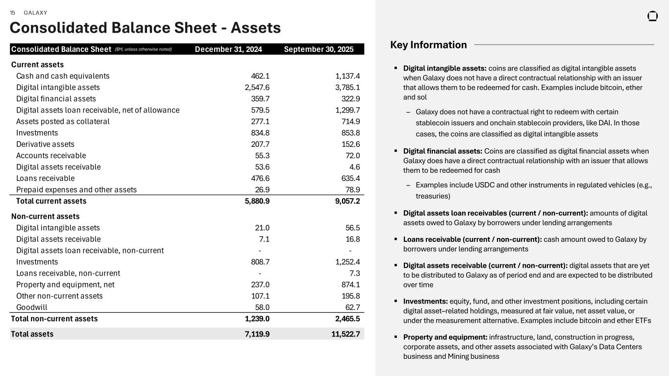 15 GALAXY Consolidated Balance Sheet December 31, 2024 September 30, 2025 Current assets Cash and cash equivalents 462.1 1,137.4 Digital intangible assets 2,547.6 3,785.1 Digital financial assets 359.7 322.9 Digital assets loan receivable, net of allowance 579.5 1,299.7 Assets posted as collateral 277.1 714.9 Investments 834.8 853.8 Derivative assets 207.7 152.6 Accounts receivable 55.3 72.0 Digital assets receivable 53.6 4.6 Loans receivable 476.6 635.4 Prepaid expenses and other assets 26.9 78.9 Total current assets 5,880.9 9,057.2 Non-current assets Digital intangible assets 21.0 56.5 Digital assets receivable 7.1 16.8 Digital assets loan receivable, non-current - - Investments 808.7 1,252.4 Loans receivable, non-current - 7.3 Property and equipment, net 237.0 874.1 Other non-current assets 107.1 195.8 Goodwill 58.0 62.7 Total non-current assets 1,239.0 2,465.5 Total assets 7,119.9 11,522.7 Consolidated Balance Sheet - Assets ▪ Digital intangible assets: coins are classified as digital intangible assets when Galaxy does not have a direct contractual relationship with an issuer that allows them to be redeemed for cash. Examples include bitcoin, ether and sol – Galaxy does not have a contractual right to redeem with certain stablecoin issuers and onchain stablecoin providers, like DAI. In those cases, the coins are classified as digital intangible assets ▪ Digital financial assets: Coins are classified as digital financial assets when Galaxy does have a direct contractual relationship with an issuer that allows them to be redeemed for cash – Examples include USDC and other instruments in regulated vehicles (e.g., treasuries) ▪ Digital assets loan receivables (current / non-current): amounts of digital assets owed to Galaxy by borrowers under lending arrangements ▪ Loans receivable (current / non-current): cash amount owed to Galaxy by borrowers under lending arrangements ▪ Digital assets receivable (current / non-current): digital assets that are yet to be distributed to Galaxy as of period end and are expected to be distributed over time ▪ Investments: equity, fund, and other investment positions, including certain digital asset–related holdings, measured at fair value, net asset value, or under the measurement alternative. Examples include bitcoin and ether ETFs ▪ Property and equipment: infrastructure, land, construction in progress, corporate assets, and other assets associated with Galaxy’s Data Centers business and Mining business Key Information($M, unless otherwise noted)