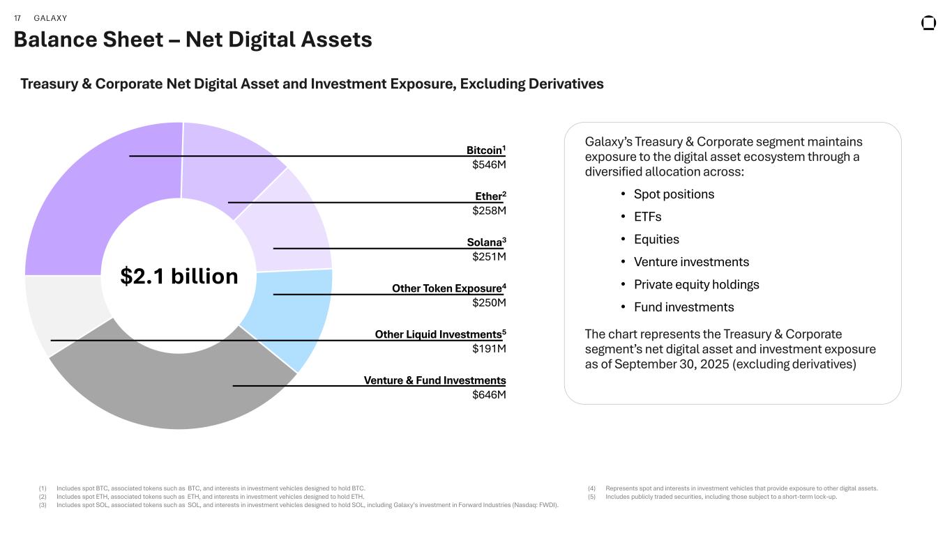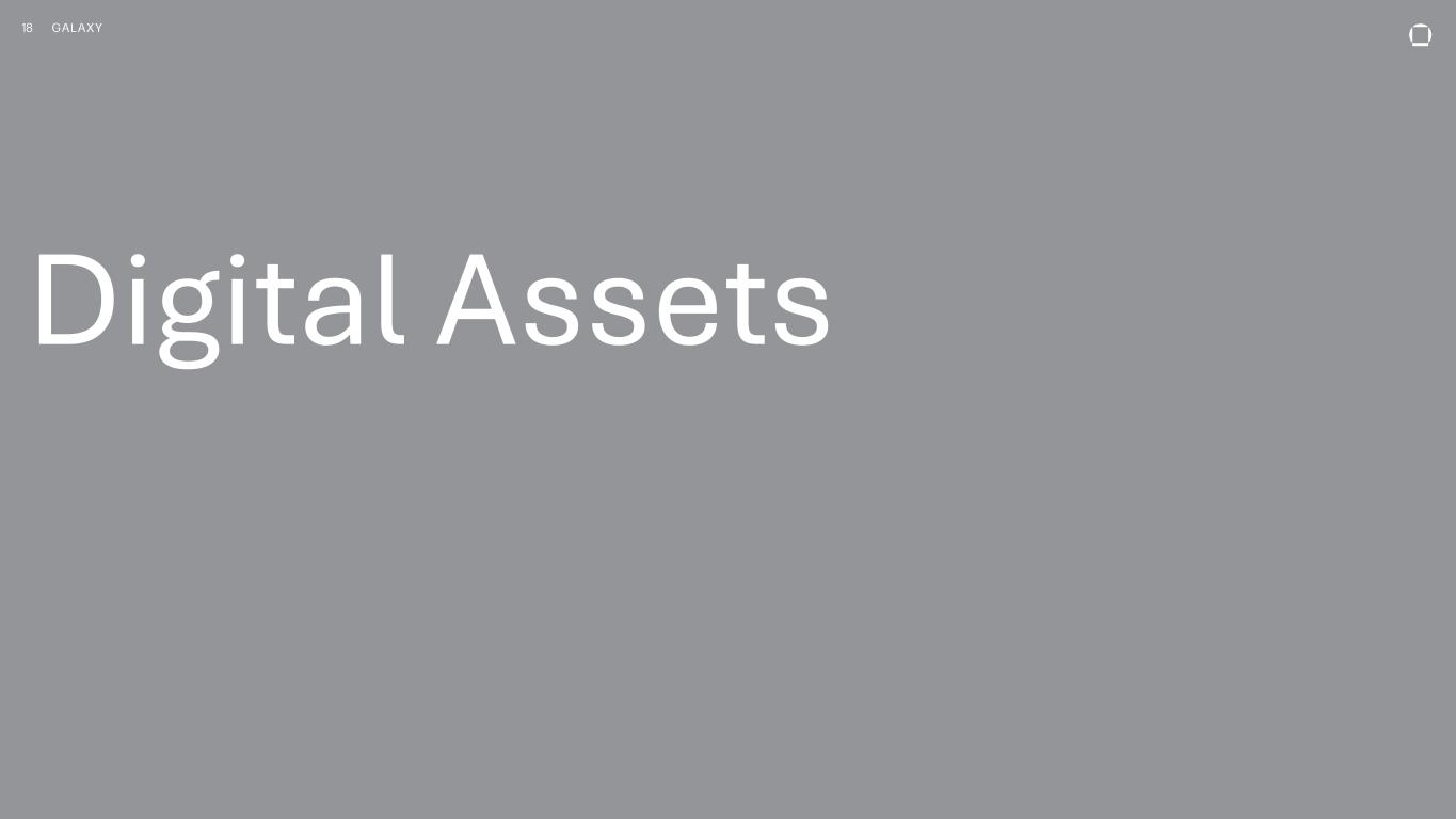 17 GALAXY Balance Sheet – Net Digital Assets Bitcoin1 $546M Ether2 $258M Solana3 $251M Venture & Fund Investments $646M Other Token Exposure4 $250M Other Liquid Investments5 $191M (1) Includes spot BTC, associated tokens such as BTC, and interests in investment vehicles designed to hold BTC. (2) Includes spot ETH, associated tokens such as ETH, and interests in investment vehicles designed to hold ETH. (3) Includes spot SOL, associated tokens such as SOL, and interests in investment vehicles designed to hold SOL, including Galaxy’s investment in Forward Industries (Nasdaq: FWDI). (4) Represents spot and interests in investment vehicles that provide exposure to other digital assets. (5) Includes publicly traded securities, including those subject to a short-term lock-up. Treasury & Corporate Net Digital Asset and Investment Exposure, Excluding Derivatives Galaxy’s Treasury & Corporate segment maintains exposure to the digital asset ecosystem through a diversified allocation across: • Spot positions • ETFs • Equities • Venture investments • Private equity holdings • Fund investments The chart represents the Treasury & Corporate segment’s net digital asset and investment exposure as of September 30, 2025 (excluding derivatives) $2.1 billion