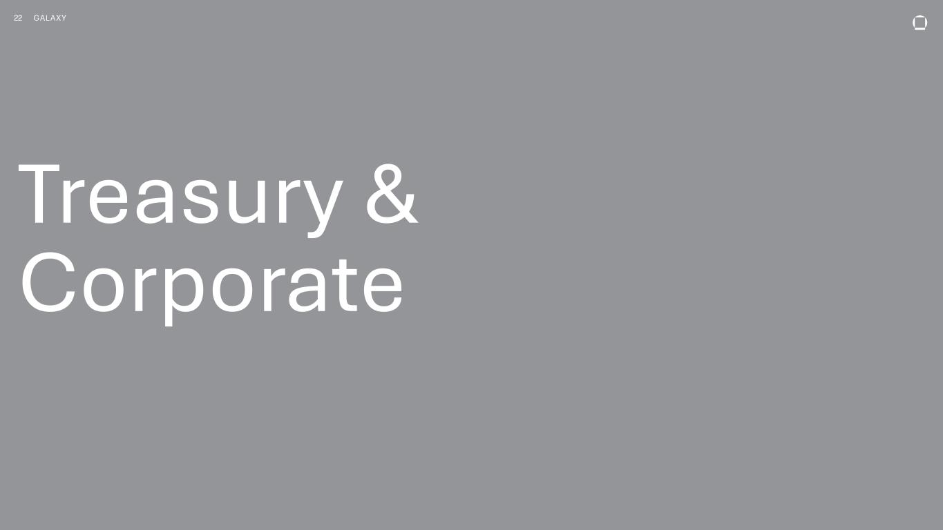 23 GALAXY 001 Principal Investments Realized and unrealized gains and losses on digital asset and investment holdings held in Treasury & Corporate, and associated trading activity 003 Residual Proprietary Mining Bitcoin rewards from proprietary bitcoin mining 001 Asset Management Fees Galaxy’s Asset Management business manages a portion of the firm’s balance sheet digital assets and investments. In these cases, the Treasury & Corporate segment is charged a management fee equivalent to that of a comparable external fund managed by Asset Management. This fee is recorded under digital assets fees and offset within the Treasury & Corporate fees line item 003 Corporate Costs Expenses or one-time costs not attributable to a specific segment 002 Blockchain Rewards & Blockchain Rewards Distributions Galaxy’s Infrastructure Solutions business stakes a portion of the firm’s balance sheet digital assets to its validators. Similar to our treatment of third-party assets staked on Galaxy validators, in order to show the Treasury & Corporate and Digital Assets segments as separate entities, we gross up the revenue and costs associated with these Treasury & Corporate tokens staked on Galaxy validators 002 Intercompany Transfer Pricing Interest income earned from cash and from Treasury & Corporate lending of cash and digital assets to the Digital Assets business to support trading and liquidity needs Performance Drivers Intercompany Elimination & Corporate Costs Treasury & Corporate Overview