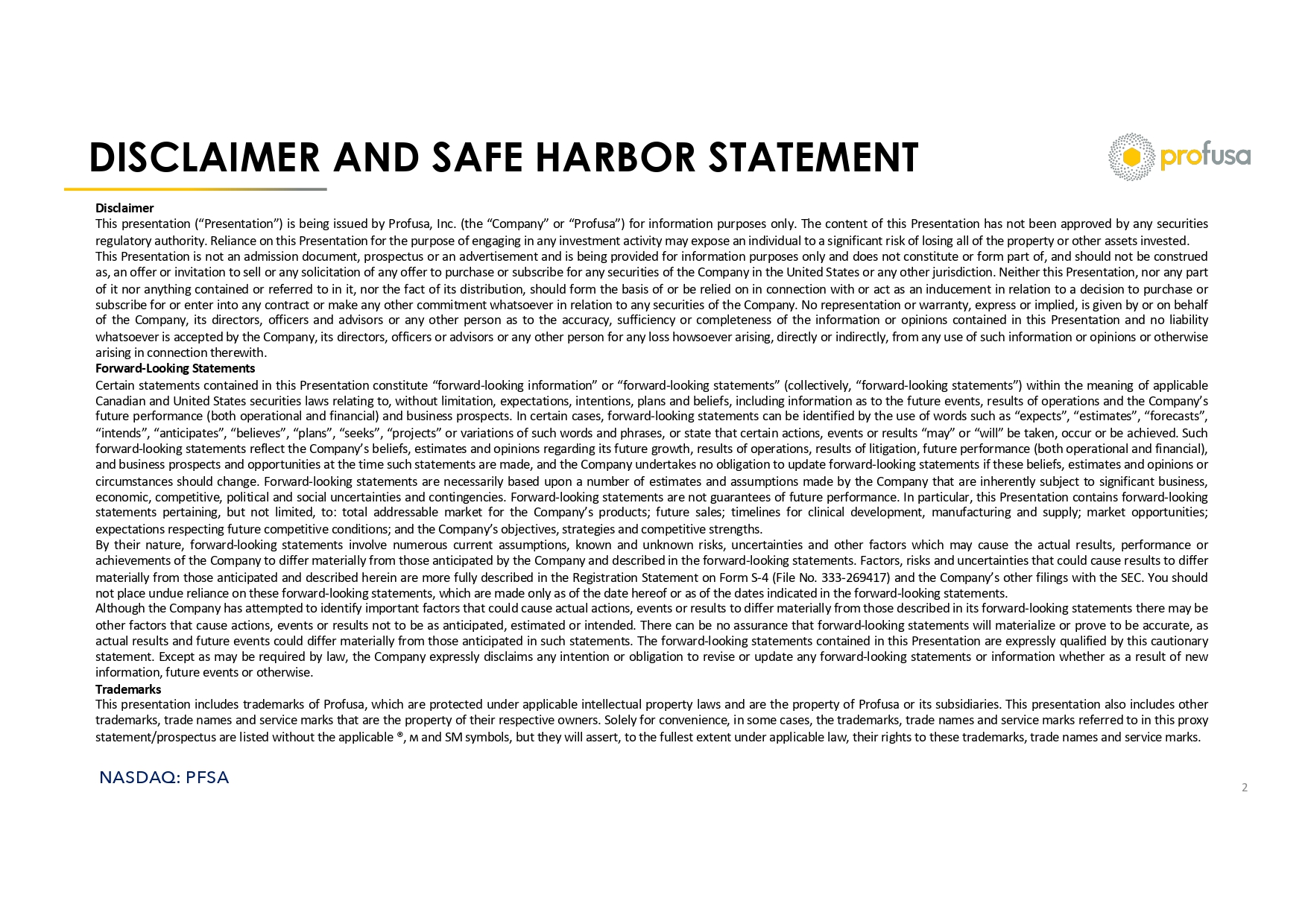 NASDAQ: PFSA DISCLAIMER AND SAFE HARBOR STATEMENT 2 Disclaimer This presentation (“Presentation”) is being issued by Profusa, Inc. (the “Company” or “Profusa”) for information purposes onl y. The content of this Presentation has not been approved by any securities regulatory authority. Reliance on this Presentation for the purpose of engaging in any investment activity may expose an individ ual to a significant risk of losing all of the property or other assets invested. This Presentation is not an admission document, prospectus or an advertisement and is being provided for information purposes on ly and does not constitute or form part of, and should not be construed as, an offer or invitation to sell or any solicitation of any offer to purchase or subscribe for any securities of the Compan y i n the United States or any other jurisdiction. Neither this Presentation, nor any part of it nor anything contained or referred to in it, nor the fact of its distribution, should form the basis of or be relied on in connection with or act as an inducement in relation to a decision to purchase or subscribe for or enter into any contract or make any other commitment whatsoever in relation to any securities of the Company . N o representation or warranty, express or implied, is given by or on behalf of the Company, its directors, officers and advisors or any other person as to the accuracy, sufficiency or completeness of t he information or opinions contained in this Presentation and no liability whatsoever is accepted by the Company, its directors, officers or advisors or any other person for any loss howsoever arising , d irectly or indirectly, from any use of such information or opinions or otherwise arising in connection therewith. Forward - Looking Statements Certain statements contained in this Presentation constitute “forward - looking information” or “forward - looking statements” (coll ectively, “forward - looking statements”) within the meaning of applicable Canadian and United States securities laws relating to, without limitation, expectations, intentions, plans and beliefs, incl udi ng information as to the future events, results of operations and the Company’s future performance (both operational and financial) and business prospects. In certain cases, forward - looking statements can be identified by the use of words such as “expects”, “estimates”, “forecasts”, “intends”, “anticipates”, “believes”, “plans”, “seeks”, “projects” or variations of such words and phrases, or state that cer tai n actions, events or results “may” or “will” be taken, occur or be achieved. Such forward - looking statements reflect the Company’s beliefs, estimates and opinions regarding its future growth, results of operati ons, results of litigation, future performance (both operational and financial), and business prospects and opportunities at the time such statements are made, and the Company undertakes no obligation to up dat e forward - looking statements if these beliefs, estimates and opinions or circumstances should change. Forward - looking statements are necessarily based upon a number of estimates and assumptions made by the Company that are inherently subject to significant business, economic, competitive, political and social uncertainties and contingencies. Forward - looking statements are not guarantees of fu ture performance. In particular, this Presentation contains forward - looking statements pertaining, but not limited, to: total addressable market for the Company’s products; future sales; timelines for cli nical development, manufacturing and supply; market opportunities; expectations respecting future competitive conditions; and the Company’s objectives, strategies and competitive strengths. By their nature, forward - looking statements involve numerous current assumptions, known and unknown risks, uncertainties and oth er factors which may cause the actual results, performance or achievements of the Company to differ materially from those anticipated by the Company and described in the forward - looking stat ements. Factors, risks and uncertainties that could cause results to differ materially from those anticipated and described herein are more fully described in the Registration Statement on Form S - 4 (File No. 333 - 269417) and the Company’s other filings with the SEC. You should not place undue reliance on these forward - looking statements, which are made only as of the date hereof or as of the dates indic ated in the forward - looking statements. Although the Company has attempted to identify important factors that could cause actual actions, events or results to differ ma terially from those described in its forward - looking statements there may be other factors that cause actions, events or results not to be as anticipated, estimated or intended. There can be no assurance t hat forward - looking statements will materialize or prove to be accurate, as actual results and future events could differ materially from those anticipated in such statements. The forward - looking statemen ts contained in this Presentation are expressly qualified by this cautionary statement. Except as may be required by law, the Company expressly disclaims any intention or obligation to revise or update any forward - looking statements or information whether as a result of new information, future events or otherwise. Trademarks This presentation includes trademarks of Profusa, which are protected under applicable intellectual property laws and are the pr operty of Profusa or its subsidiaries. This presentation also includes other trademarks, trade names and service marks that are the property of their respective owners. Solely for convenience, in some case s, the trademarks, trade names and service marks referred to in this proxy statement/prospectus are listed without the applicable ®, м and SM symbols, but they will assert,