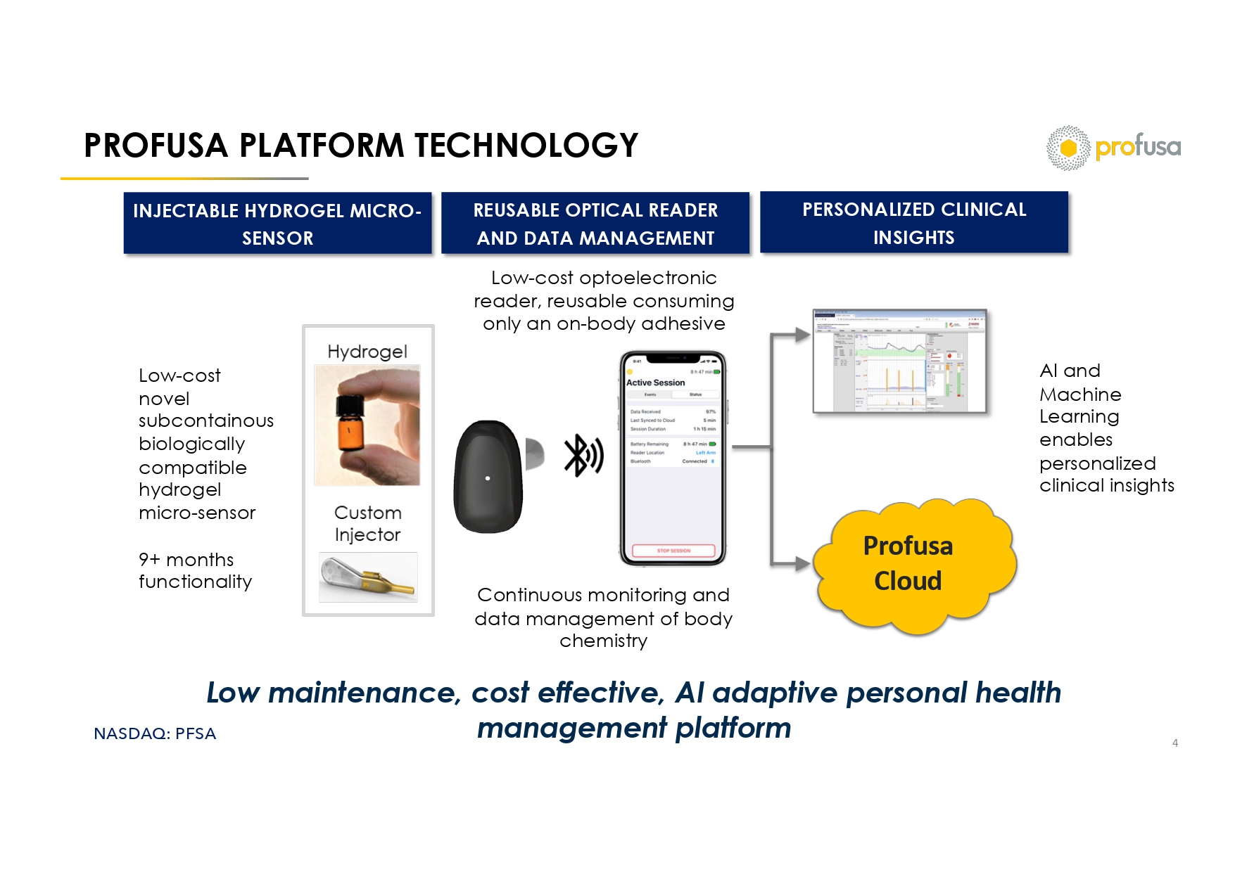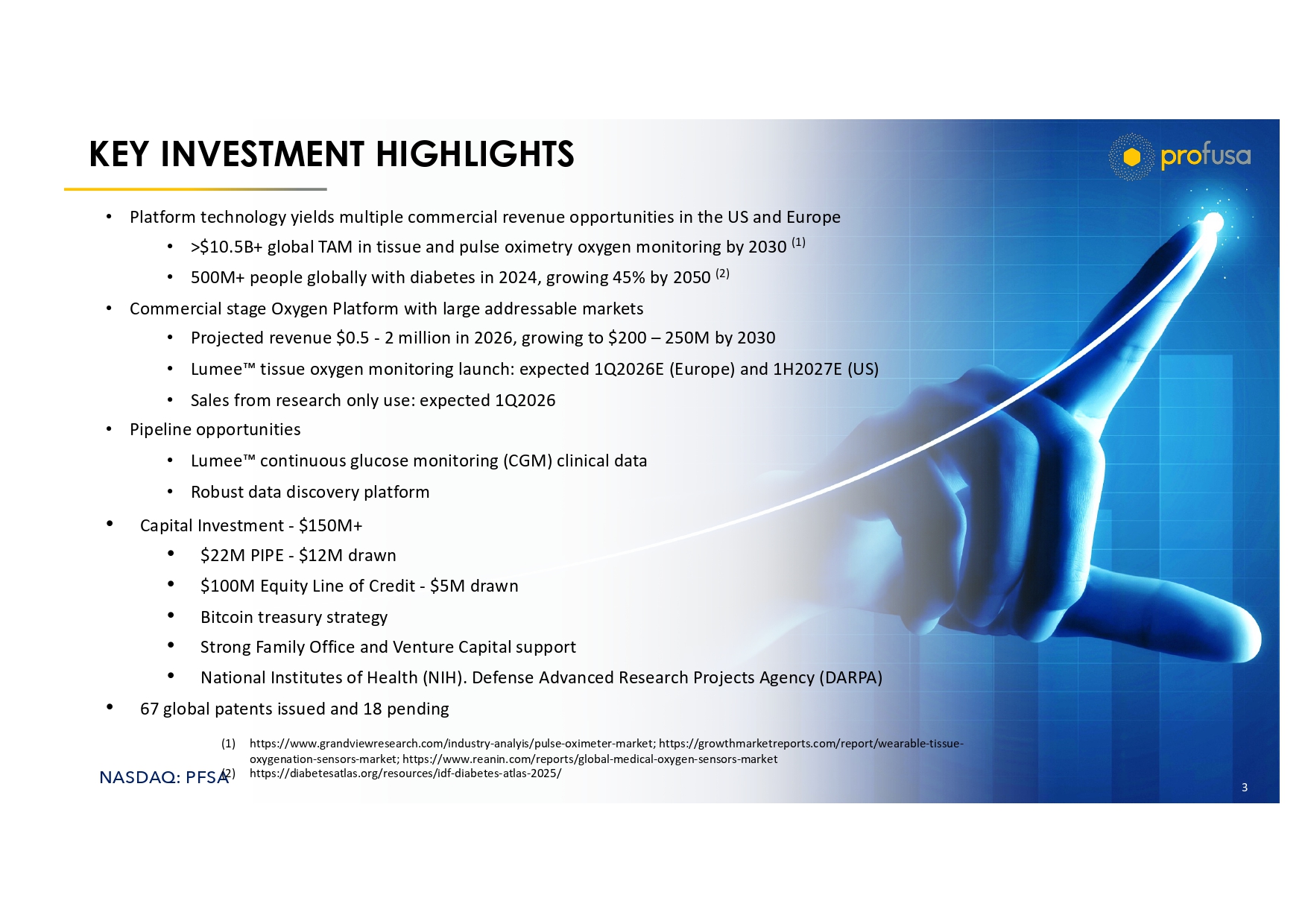 NASDAQ: PFSA 3 KEY INVESTMENT HIGHLIGHTS • Platform technology yields multiple commercial revenue opportunities in the US and Europe • >$10.5B+ global TAM in tissue and pulse oximetry oxygen monitoring by 2030 (1) • 500M+ people globally with diabetes in 2024, growing 45% by 2050 (2) • Commercial stage Oxygen Platform with large addressable markets • Projected revenue $0.5 - 2 million in 2026, growing to $200 – 250M by 2030 • Lumee tissue oxygen monitoring launch: expected 1Q2026E (Europe) and 1H2027E (US) • Sales from research only use: expected 1Q2026 • Pipeline opportunities • Lumee continuous glucose monitoring (CGM) clinical data • Robust data discovery platform • Capital Investment - $150M+ • $22M PIPE - $12M drawn • $100M Equity Line of Credit - $5M drawn • Bitcoin treasury strategy • Strong Family Office and Venture Capital support • National Institutes of Health (NIH). Defense Advanced Research Projects Agency (DARPA) • 67 global patents issued and 18 pending (1) https://www.grandviewresearch.com/industry - analyis/pulse - oximeter - market; https://growthmarketreports.com/report/wearable - ti ssue - oxygenation - sensors - market; https://www.reanin.com/reports/global - medical - oxygen - sensors - market (2) https://diabetesatlas.org/resources/idf - diabetes - atlas - 2025/