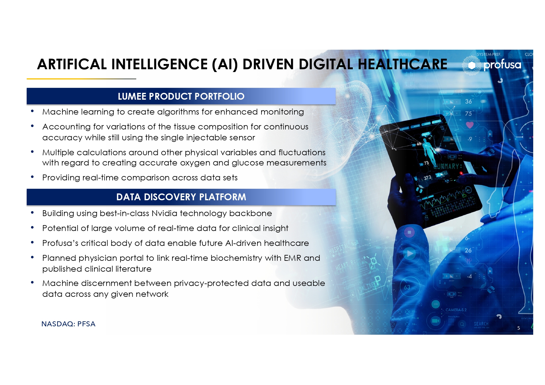 NASDAQ: PFSA PROFUSA PLATFORM TECHNOLOGY 4 Profusa Cloud Low maintenance, cost effective, AI adaptive personal health management platform Low - cost novel subcontainous biologically compatible hydrogel micro - sensor 9+ months functionality INJECTABLE HYDROGEL MICRO - SENSOR REUSABLE OPTICAL READER AND DATA MANAGEMENT Continuous monitoring and data management of body chemistry PERSONALIZED CLINICAL INSIGHTS Low - cost optoelectronic reader, reusable consuming only an on - body adhesive AI and Machine Learning enables personalized clinical insights
