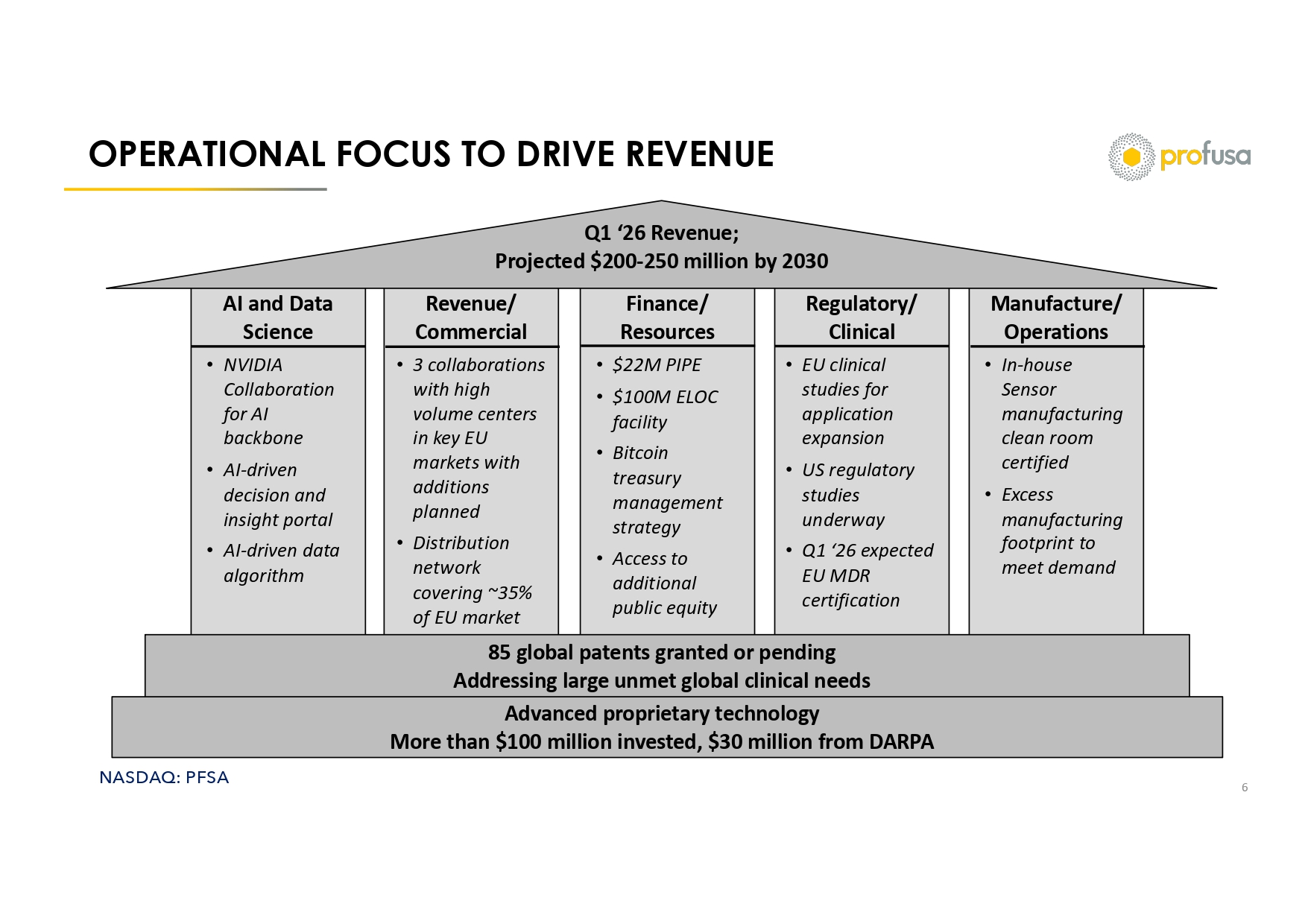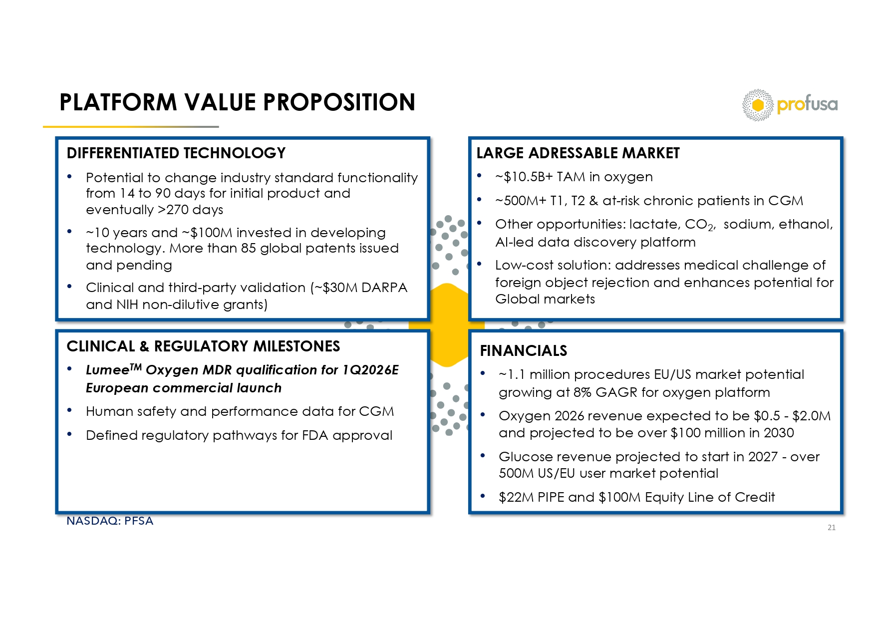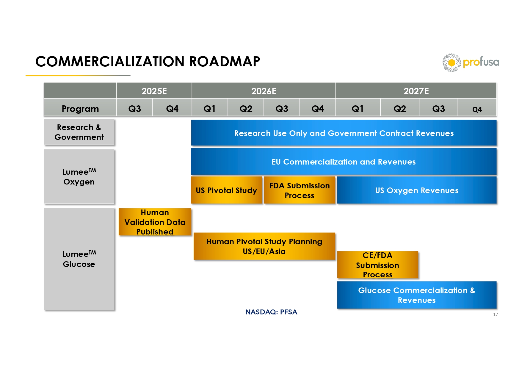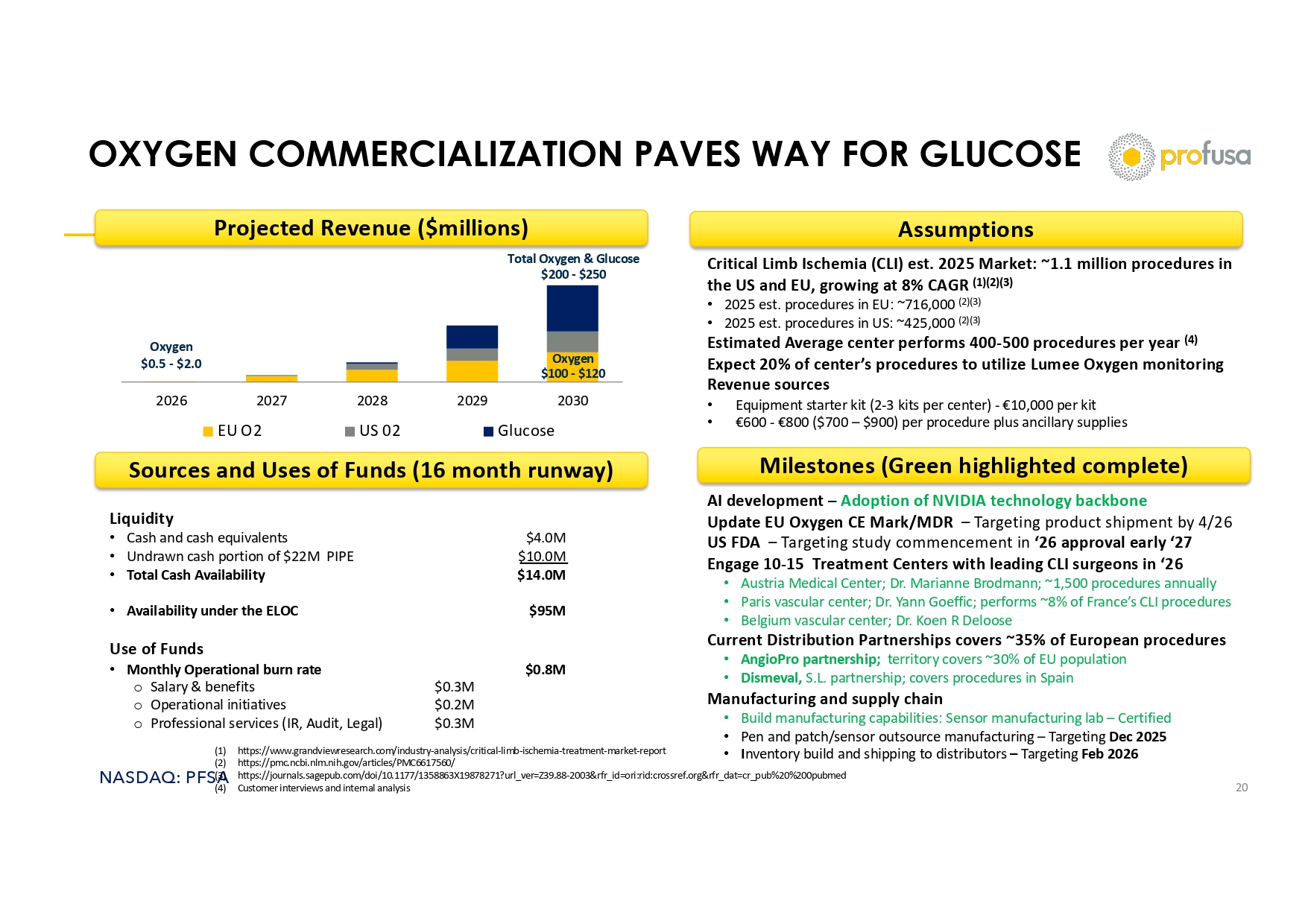 NASDAQ: PFSA OXYGEN COMMERCIALIZATION PAVES WAY FOR GLUCOSE 20 2026 2027 2028 2029 2030 EU O2 US 02 Glucose Projected Revenue ($millions) Assumptions Critical Limb Ischemia (CLI) est. 2025 Market: ~1.1 million procedures in the US and EU, growing at 8% CAGR (1)(2)(3) • 2025 est. procedures in EU: ~716,000 (2)(3) • 2025 est. procedures in US: ~425,000 (2)(3) Estimated Average center performs 400 - 500 procedures per year (4) Expect 20% of center’s procedures to utilize Lumee Oxygen monitoring Revenue sources • Equipment starter kit (2 - 3 kits per center) - €10,000 per kit • €600 - €800 ($700 – $900) per procedure plus ancillary supplies Milestones (Green highlighted complete) AI development – Adoption of NVIDIA technology backbone Update EU Oxygen CE Mark/MDR – Targeting product shipment by 4/26 US FDA – Targeting study commencement in ‘26 approval early ‘27 Engage 10 - 15 Treatment Centers with leading CLI surgeons in ‘26 • Austria Medical Center; Dr. Marianne Brodmann; ~1,500 procedures annually • Paris vascular center; Dr. Yann Goeffic ; performs ~8% of France’s CLI procedures • Belgium vascular center; Dr. Koen R Deloose Current Distribution Partnerships covers ~35% of European procedures • AngioPro partnership; territory covers ~30% of EU population • Dismeval , S.L. partnership; covers procedures in Spain Manufacturing and supply chain • Build manufacturing capabilities: Sensor manufacturing lab – Certified • Pen and patch/sensor outsource manufacturing – Targeting Dec 2025 • I nventory build and shipping to distributors – Targeting Feb 2026 Liquidity • Cash and cash equivalents $4.0M • Undrawn cash portion of $22M PIPE $10.0M • Total Cash Availability $14.0M • Availability under the ELOC $95M Use of Funds • Monthly Operational burn rate $0.8M o Salary & benefits $0.3M o Operational initiatives $0.2M o Professional services (IR, Audit, Legal) $0.3M Sources and Uses of Funds (16 month runway) Oxygen $100 - $120 Oxygen $0.5 - $2.0 Total Oxygen & Glucose $200 - $250 (1) https://www.grandviewresearch.com/industry - analysis/critical - limb - ischemia - treatment - market - report (2) https://pmc.ncbi.nlm.nih.gov/articles/PMC6617560/ (3) https://journals.sagepub.com/doi/10.1177/1358863X19878271?url_ver=Z39.88 - 2003&rfr_id=ori:rid:crossref.org&rfr_dat=cr_pub%20% 200pubmed (4) Customer interviews and internal analysis