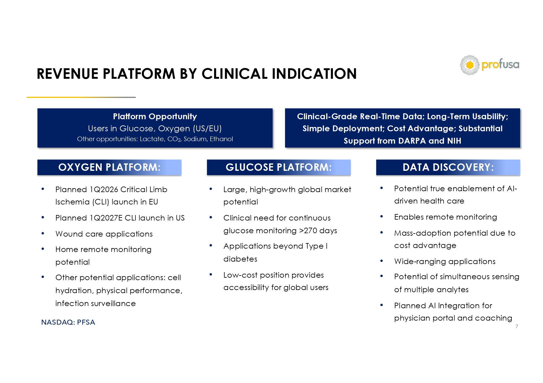 NASDAQ: PFSA Revenue/ Commercial AI and Data Science Finance/ Resources Regulatory/ Clinical Manufacture/ Operations OPERATIONAL FOCUS TO DRIVE REVENUE 6 Q1 ‘26 Revenue; Projected $200 - 250 million by 2030 • 3 collaborations with high volume centers in key EU markets with additions planned • Distribution network covering ~35% of EU market • NVIDIA Collaboration for AI backbone • AI - driven decision and insight portal • AI - driven data algorithm • $22M PIPE • $100M ELOC facility • Bitcoin treasury management strategy • Access to additional public equity • EU clinical studies for application expansion • US regulatory studies underway • Q1 ‘26 expected EU MDR certification • In - house Sensor manufacturing clean room certified • Excess manufacturing footprint to meet demand 85 global patents granted or pending Addressing large unmet global clinical needs Advanced proprietary technology More than $100 million invested, $30 million from DARPA