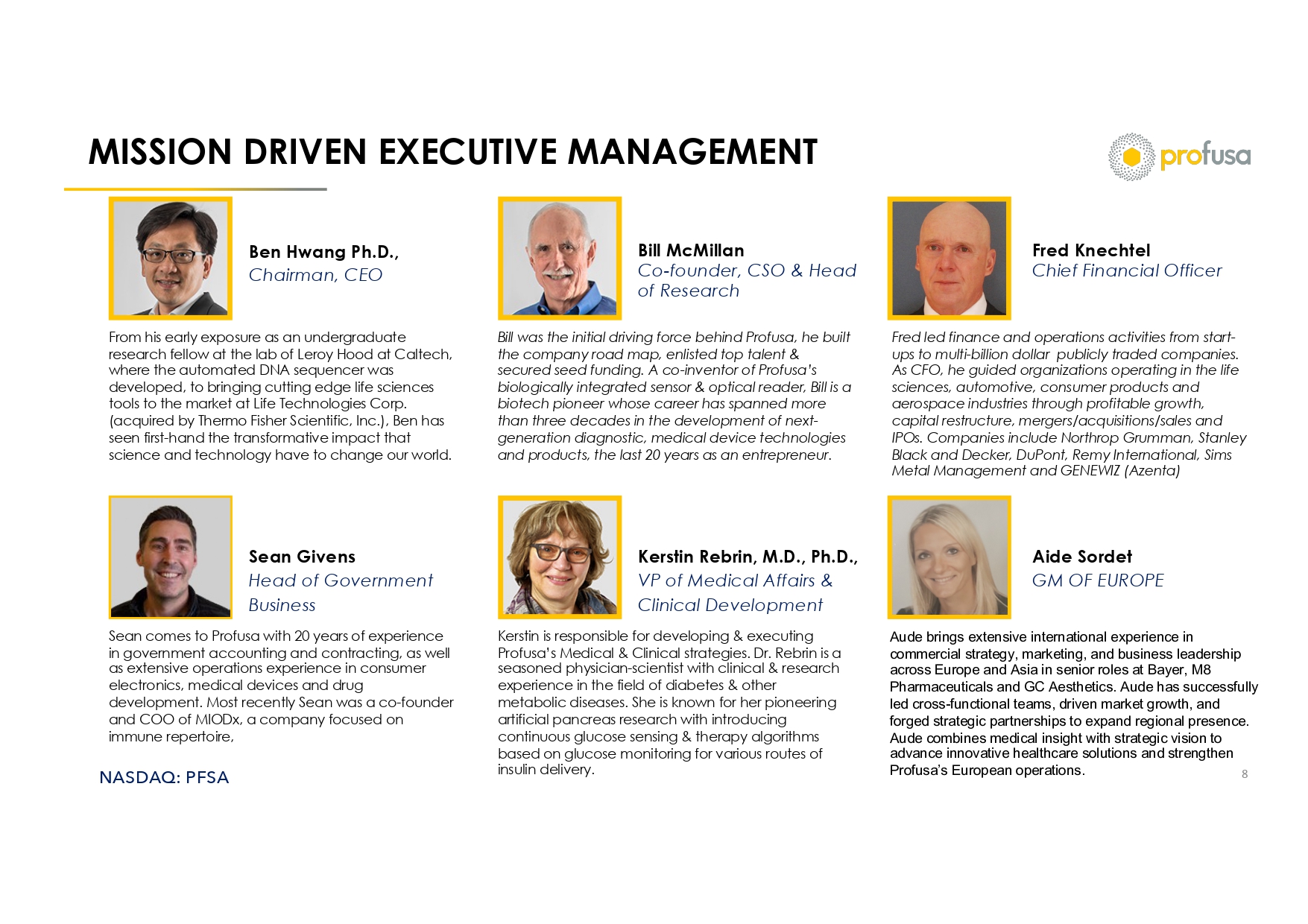NASDAQ: PFSA MISSION DRIVEN EXECUTIVE MANAGEMENT 8 Ben Hwang Ph.D., Chairman, CEO From his early exposure as an undergraduate research fellow at the lab of Leroy Hood at Caltech, where the automated DNA sequencer was developed, to bringing cutting edge life sciences tools to the market at Life Technologies Corp. (acquired by Thermo Fisher Scientific, Inc.), Ben has seen first - hand the transformative impact that science and technology have to change our world. Bill McMillan Co - founder, CSO & Head of Research Bill was the initial driving force behind Profusa , he built the company road map, enlisted top talent & secured seed funding. A co - inventor of Profusa’s biologically integrated sensor & optical reader, Bill is a biotech pioneer whose career has spanned more than three decades in the development of next - generation diagnostic, medical device technologies and products, the last 20 years as an entrepreneur. Fred Knechtel Chief Financial Officer Fred led finance and operations activities from start - ups to multi - billion dollar publicly traded companies. As CFO, he guided organizations operating in the life sciences, automotive, consumer products and aerospace industries through profitable growth, capital restructure, mergers/acquisitions/sales and IPOs. Companies include Northrop Grumman, Stanley Black and Decker, DuPont, Remy International, Sims Metal Management and GENEWIZ ( Azenta ) Sean Givens Head of Government Business Sean comes to Profusa with 20 years of experience in government accounting and contracting, as well as extensive operations experience in consumer electronics, medical devices and drug development. Most recently Sean was a co - founder and COO of MIODx , a company focused on immune repertoire, Kerstin Rebrin , M.D., Ph.D., VP of Medical Affairs & Clinical Development Kerstin is responsible for developing & executing Profusa’s Medical & Clinical strategies. Dr. Rebrin is a seasoned physician - scientist with clinical & research experience in the field of diabetes & other metabolic diseases. She is known for her pioneering artificial pancreas research with introducing continuous glucose sensing & therapy algorithms based on glucose monitoring for various routes of insulin delivery. Aide Sordet GM OF EUROPE Aude brings extensive international experience in commercial strategy, marketing, and business leadership across Europe and Asia in senior roles at Bayer, M8 Pharmaceuticals and GC Aesthetics. Aude has successfully led cross - functional teams, driven market growth, and forged strategic partnerships to expand regional presence. Aude combines medical insight with strategic vision to advance innovative healthcare solutions and strengthen Profusa’s European operations.