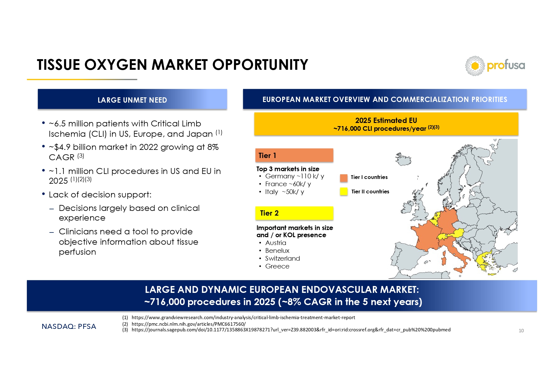 NASDAQ: PFSA TISSUE OXYGEN MARKET OPPORTUNITY 10 LARGE UNMET NEED • ~6.5 million patients with Critical Limb Ischemia (CLI) in US, Europe, and Japan (1) • ~$4.9 billion market in 2022 growing at 8% CAGR (3) • ~1.1 million CLI procedures in US and EU in 2025 (1)(2)(3) • Lack of decision support: ⎼ Decisions largely based on clinical experience ⎼ Clinicians need a tool to provide objective information about tissue perfusion EUROPEAN MARKET OVERVIEW AND COMMERCIALIZATION PRIORITIES 2025 Estimated EU ~716,000 CLI procedures/year (2)(3) Top 3 markets in size • Germany ~110 k/ y • France ~60k/ y • Italy ~50k/ y Important markets in size and / or KOL presence • Austria • Benelux • Switzerland • Greece Tier I countries Tier II countries LARGE AND DYNAMIC EUROPEAN ENDOVASCULAR MARKET: ~716,000 procedures in 2025 (~8% CAGR in the 5 next years) Tier 1 Tier 2 (1) https://www.grandviewresearch.com/industry - analysis/critical - limb - ischemia - treatment - market - report (2) https://pmc.ncbi.nlm.nih.gov/articles/PMC6617560/ (3) https://journals.sagepub.com/doi/10.1177/1358863X19878271?url_ver=Z39.882003&rfr_id=ori:rid:crossref.org&rfr_dat=cr_pub%20%2 00pubmed