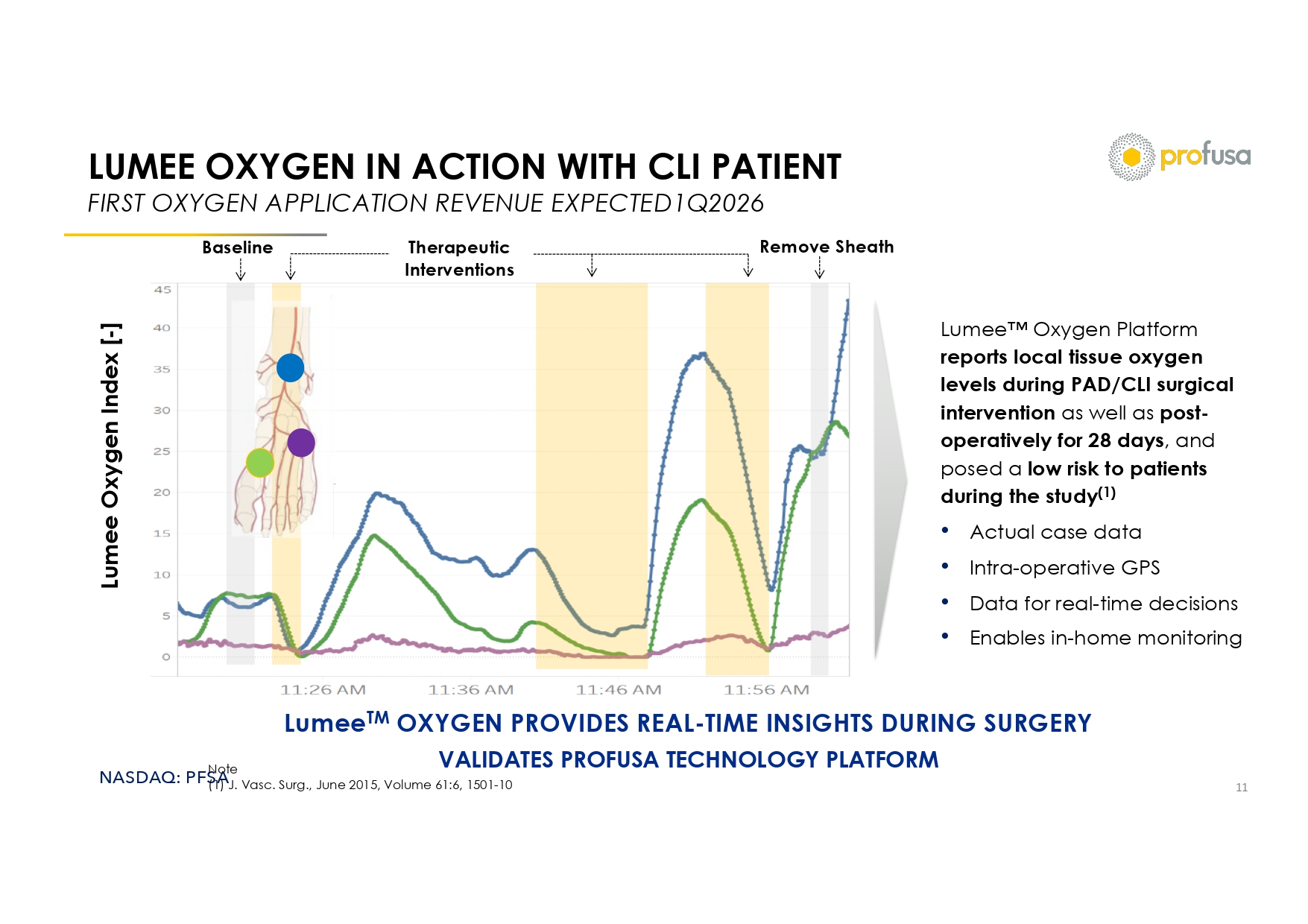 NASDAQ: PFSA LUMEE OXYGEN IN ACTION WITH CLI PATIENT FIRST OXYGEN APPLICATION REVENUE EXPECTED1Q2026 11 Therapeutic Interventions Lumee Oxygen Index [ - ] Remove Sheath Baseline Note (1) J. Vasc . Surg., June 2015, Volume 61:6, 1501 - 10 Lumee Oxygen Platform reports local tissue oxygen levels during PAD/CLI surgical intervention as well as post - operatively for 28 days , and posed a low risk to patients during the study (1) • Actual case data • Intra - operative GPS • Data for real - time decisions • Enables in - home monitoring Lumee TM OXYGEN PROVIDES REAL - TIME INSIGHTS DURING SURGERY VALIDATES PROFUSA TECHNOLOGY PLATFORM