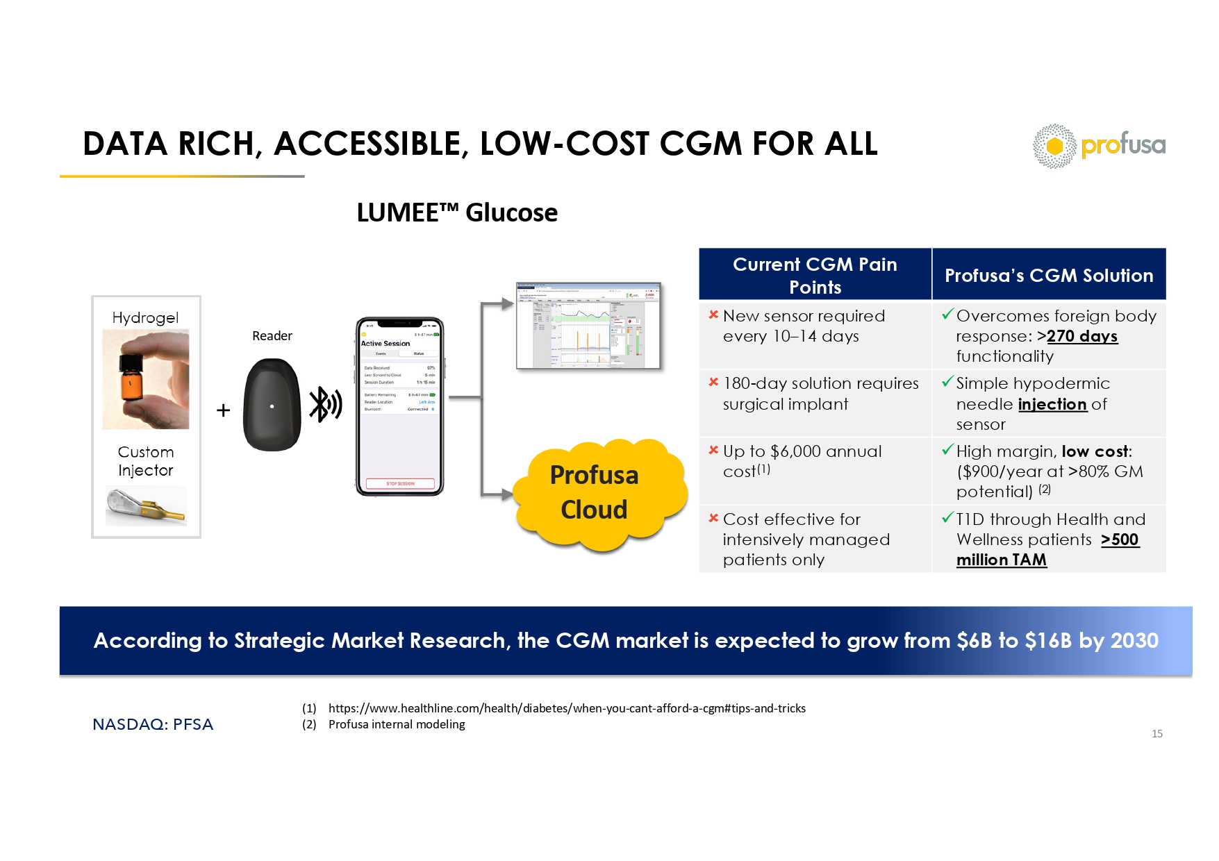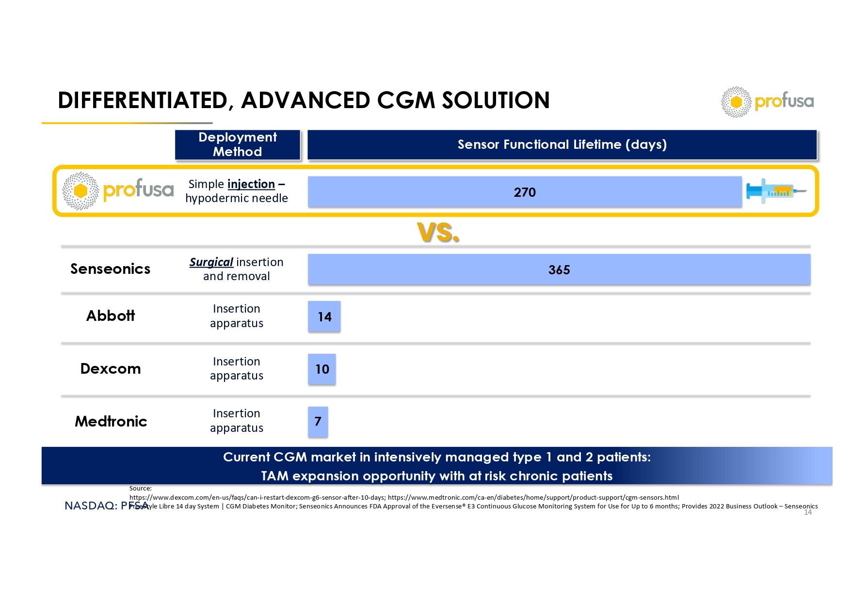 NASDAQ: PFSA >590M DIABETES PATIENTS GLOBALLY – CGM OPPORTUNITY FROM “CAN YOU AFFORD IT” TO “DO YOU NEED IT?” 13 Current CGM TAM Profusa TAM • Established benefit of CGM across diabetes spectrum • Woefully under - penetrated opportunity >2M CGM users ~300M Diagnosed ~30M Diagnosed (US/EU) prediabetes patients (4) Population T1D (1) T2D (1) >500M At - risk Prediabetes Population (3) >9M >500M Up to $7,000/year for CGM (2) >$600 (2) Glucometer/test strips per year ~$500 (5) Coaching Program/Year (1) https://diabetesatlas.org/resources/idf - diabetes - atlas - 2025/ (2) https://www.goodrx.com/classes/medical - supplies - and - devices/should - you - be - subscribing - to - have - your - test - strips - delivered (3) https://www.thelancet.com/journals/landia/article/PIIS2213 - 8587(25)00034 - 8/fulltext (4) https://pmc.ncbi.nlm.nih.gov/articles/PMC6507173/ (5) https://nationaldppcsc.cdc.gov/s/article/FAQ - Cost - of - the - Program - 1526419435855#:~:text=On%20average%2C%20the%20cost%20per,wh o%20are%20uninsured%20or%20underinsured.
