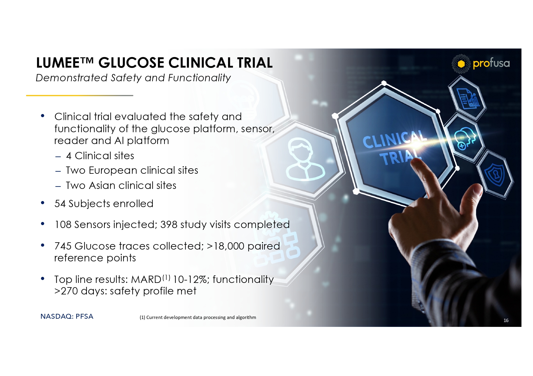 NASDAQ: PFSA DATA RICH, ACCESSIBLE, LOW - COST CGM FOR ALL 15 Profusa Cloud Reader Profusa’s CGM Solution Current CGM Pain Points x Overcomes foreign body response: > 270 days functionality  New sensor required every 10 – 14 days x Simple hypodermic needle injection of sensor  180 - day solution requires surgical implant x High margin, low cost : ($900/year at >80% GM potential) (2)  Up to $6,000 annual cost (1) x T1D through Health and Wellness patients >500 million TAM  Cost effective for intensively managed patients only According to Strategic Market Research, the CGM market is expected to grow from $6B to $16B by 2030 LUMEE Glucose (1) https://www.healthline.com/health/diabetes/when - you - cant - afford - a - cgm#tips - and - tricks (2) Profusa internal modeling