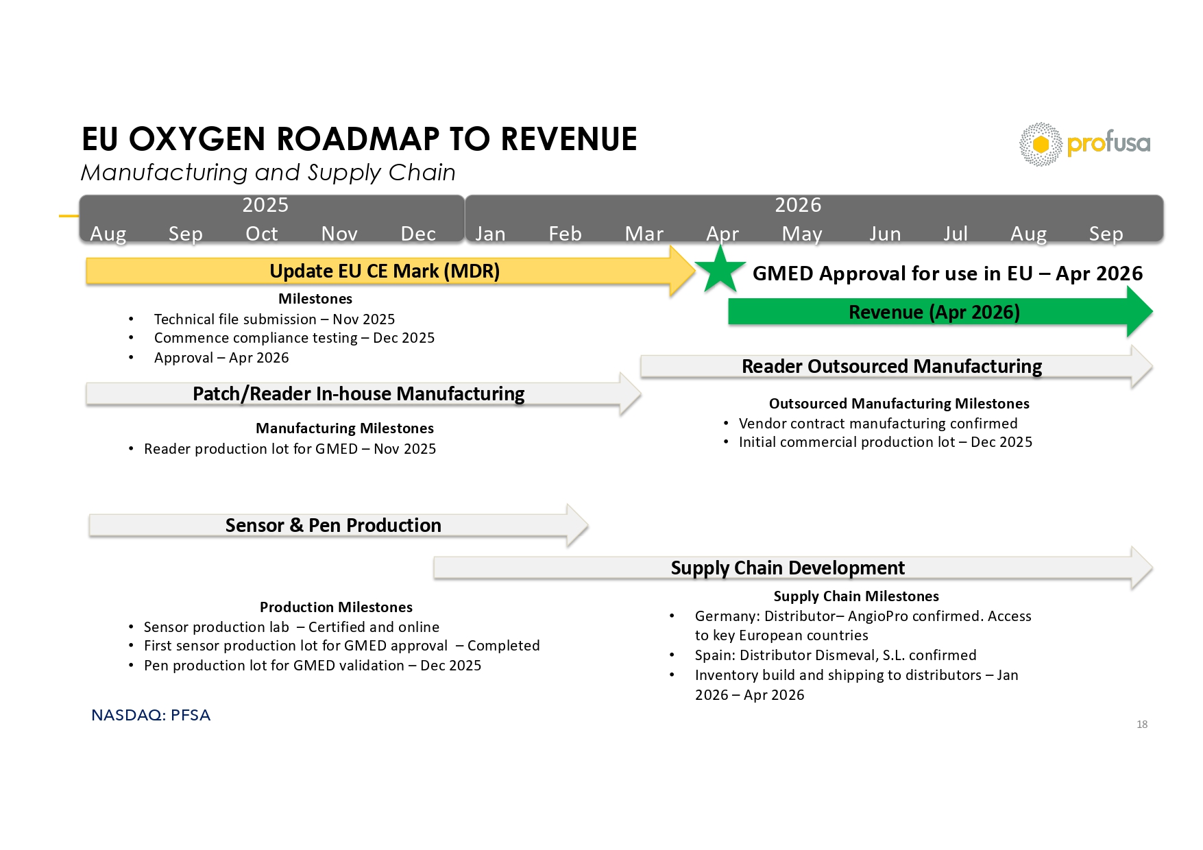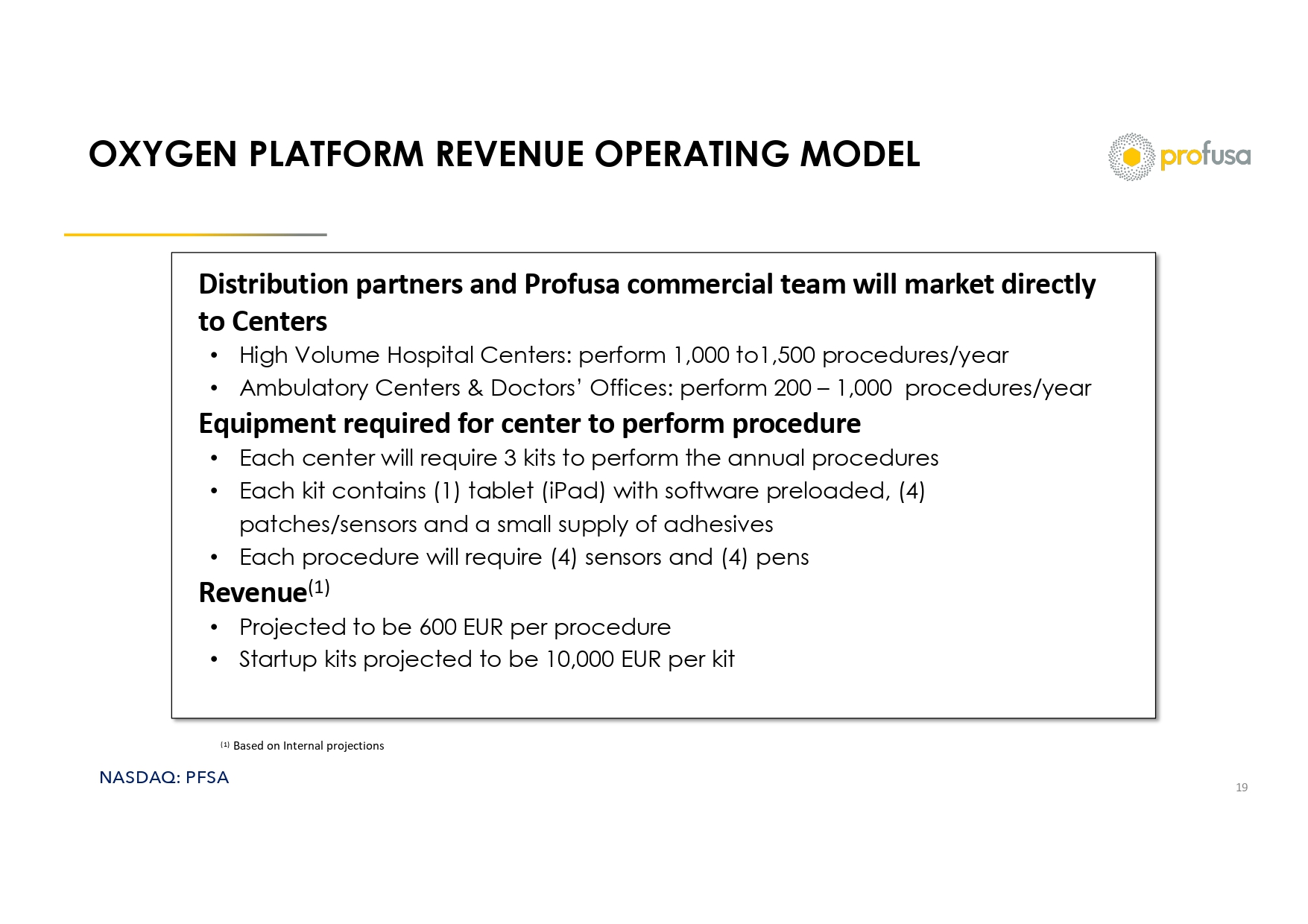 NASDAQ: PFSA EU OXYGEN ROADMAP TO REVENUE Manufacturing and Supply Chain 18 2025 Aug Sep Oct Nov Dec 2026 Jan Feb Mar Apr May Jun Jul Aug Sep Update EU CE Mark (MDR) Milestones • Technical file submission – Nov 2025 • Commence compliance testing – Dec 2025 • Approval – Apr 2026 Sensor & Pen Production Production Milestones • Sensor production lab – Certified and online • First sensor production lot for GMED approval – Completed • Pen production lot for GMED validation – Dec 2025 Patch/Reader In - house Manufacturing Reader Outsourced Manufacturing Manufacturing Milestones • Reader production lot for GMED – Nov 2025 Revenue (Apr 2026) GMED Approval for use in EU – Apr 2026 Supply Chain Development Supply Chain Milestones • Germany: Distributor – AngioPro confirmed. Access to key European countries • Spain: Distributor Dismeval , S.L. confirmed • Inventory build and shipping to distributors – Jan 2026 – Apr 2026 Outsourced Manufacturing Milestones • Vendor contract manufacturing confirmed • Initial commercial production lot – Dec 2025