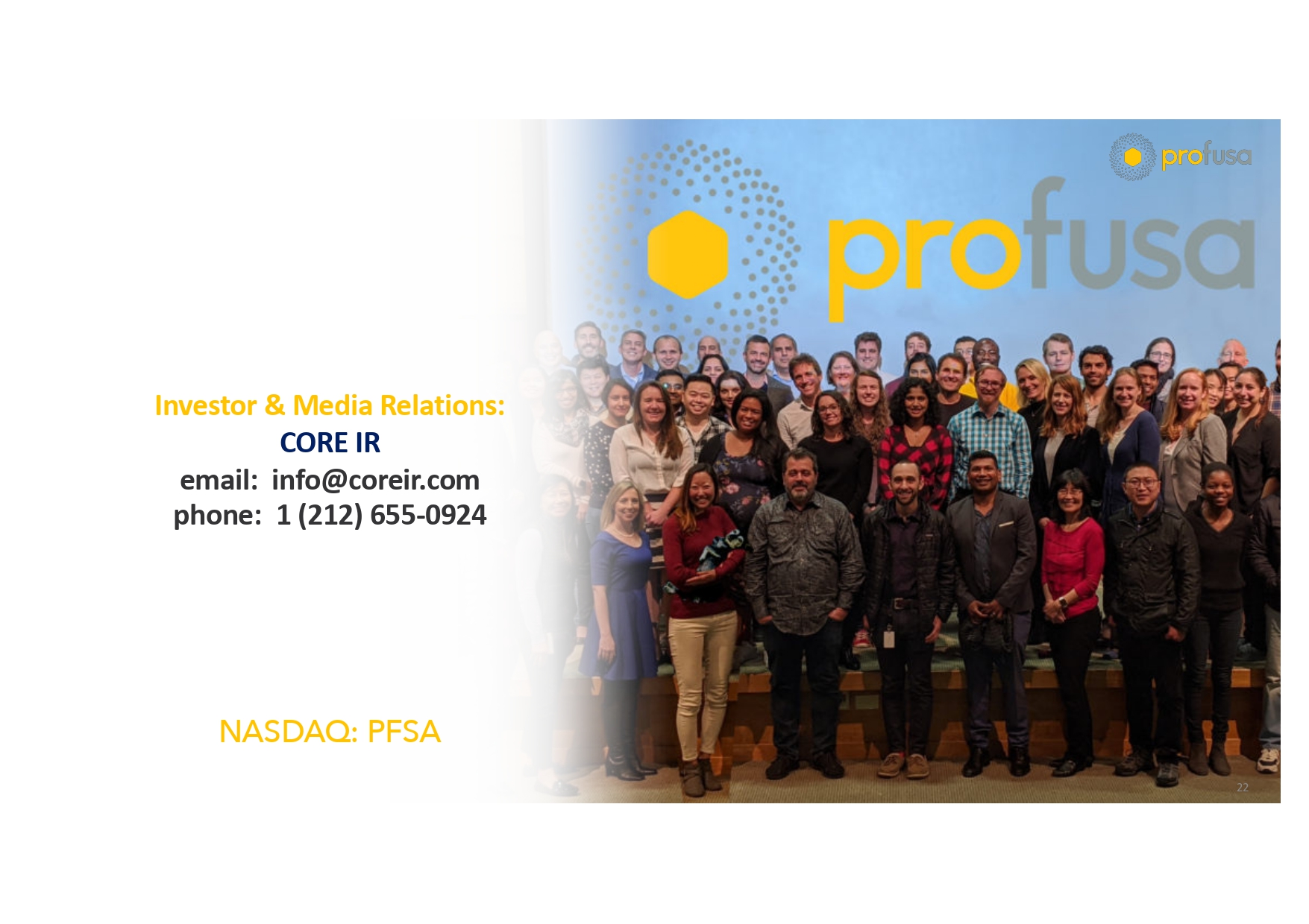22 Investor & Media Relations: CORE IR email: info@coreir.com phone: 1 (212) 655 - 0924 NASDAQ: PFSA