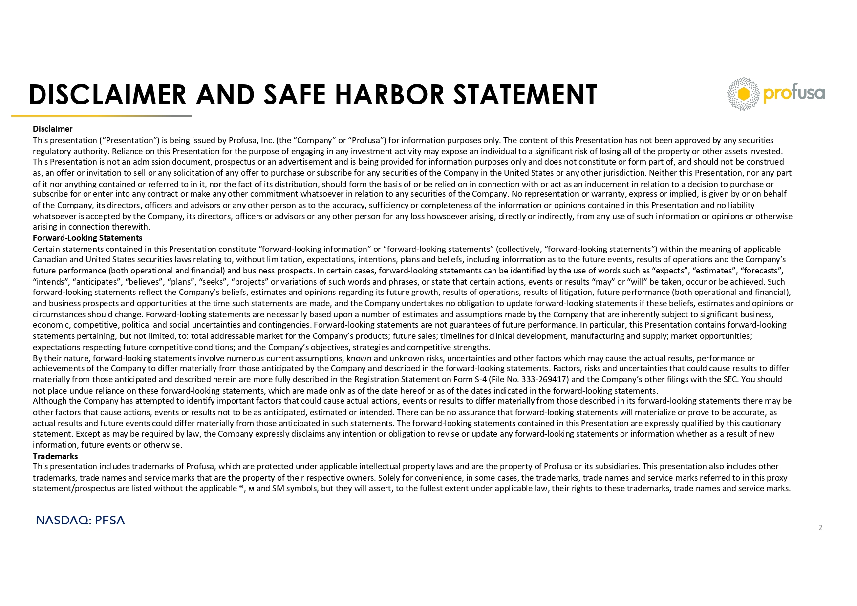 NASDAQ: PFSA DISCLAIMER AND SAFE HARBOR STATEMENT 2 Disclaimer This presentation (“Presentation”) is being issued by Profusa, Inc. (the “Company” or “Profusa”) for information purposes only. The content of this Presentation has not been approved by any securities regulatory authority. Reliance on this Presentation for the purpose of engaging in any investment activity may expose an individual to a significant risk of losing all of the property or other assets invested. This Presentation is not an admission document, prospectus or an advertisement and is being provided for information purposes only and does not constitute or form part of, and should not be construed as, an offer or invitation to sell or any solicitation of any offer to purchase or subscribe for any securities of the Company in the United States or any other jurisdiction. Neither this Presentation, nor any part of it nor anything contained or referred to in it, nor the fact of its distribution, should form the basis of or be relied on in connection with or act as an inducement in relation to a decision to purchase or subscribe for or enter into any contract or make any other commitment whatsoever in relation to any securities of the Company. No representation or warranty, express or implied, is given by or on behalf of the Company, its directors, officers and advisors or any other person as to the accuracy, sufficiency or completeness of the information or opinions contained in this Presentation and no liability whatsoever is accepted by the Company, its directors, officers or advisors or any other person for any loss howsoever arising, directly or indirectly, from any use of such information or opinions or otherwise arising in connection therewith. Forward - Looking Statements Certain statements contained in this Presentation constitute “forward - looking information” or “forward - looking statements” (collectively, “forward - looking statements”) within the meaning of applicable Canadian and United States securities laws relating to, without limitation, expectations, intentions, plans and beliefs, including information as to the future events, results of operations and the Company’s future performance (both operational and financial) and business prospects. In certain cases, forward - looking statements can be identified by the use of words such as “expects”, “estimates”, “forecasts”, “intends”, “anticipates”, “believes”, “plans”, “seeks”, “projects” or variations of such words and phrases, or state that certain actions, events or results “may” or “will” be taken, occur or be achieved. Such forward - looking statements reflect the Company’s beliefs, estimates and opinions regarding its future growth, results of operations, results of litigation, future performance (both operational and financial), and business prospects and opportunities at the time such statements are made, and the Company undertakes no obligation to update forward - looking statements if these beliefs, estimates and opinions or circumstances should change. Forward - looking statements are necessarily based upon a number of estimates and assumptions made by the Company that are inherently subject to significant business, economic, competitive, political and social uncertainties and contingencies. Forward - looking statements are not guarantees of future performance. In particular, this Presentation contains forward - looking statements pertaining, but not limited, to: total addressable market for the Company’s products; future sales; timelines for clinical development, manufacturing and supply; market opportunities; expectations respecting future competitive conditions; and the Company’s objectives, strategies and competitive strengths. By their nature, forward - looking statements involve numerous current assumptions, known and unknown risks, uncertainties and other factors which may cause the actual results, performance or achievements of the Company to differ materially from those anticipated by the Company and described in the forward - looking statements. Factors, risks and uncertainties that could cause results to differ materially from those anticipated and described herein are more fully described in the Registration Statement on Form S - 4 (File No. 333 - 269417) and the Company’s other filings with the SEC. You should not place undue reliance on these forward - looking statements, which are made only as of the date hereof or as of the dates indicated in the forward - looking statements. Although the Company has attempted to identify important factors that could cause actual actions, events or results to differ materially from those described in its forward - looking statements there may be other factors that cause actions, events or results not to be as anticipated, estimated or intended. There can be no assurance that forward - looking statements will materialize or prove to be accurate, as actual results and future events could differ materially from those anticipated in such statements. The forward - looking statements contained in this Presentation are expressly qualified by this cautionary statement. Except as may be required by law, the Company expressly disclaims any intention or obligation to revise or update any forward - looking statements or information whether as a result of new information, future events or otherwise. Trademarks This presentation includes trademarks of Profusa, which are protected under applicable intellectual property laws and are the property of Profusa or its subsidiaries. This presentation also includes other trademarks, trade names and service marks that are the property of their respective owners. Solely for convenience, in some cases, the trademarks, trade names and service marks referred to in this proxy statement/prospectus are listed without the applicable ®, м and SM symbols, but they will assert, to the fullest extent under