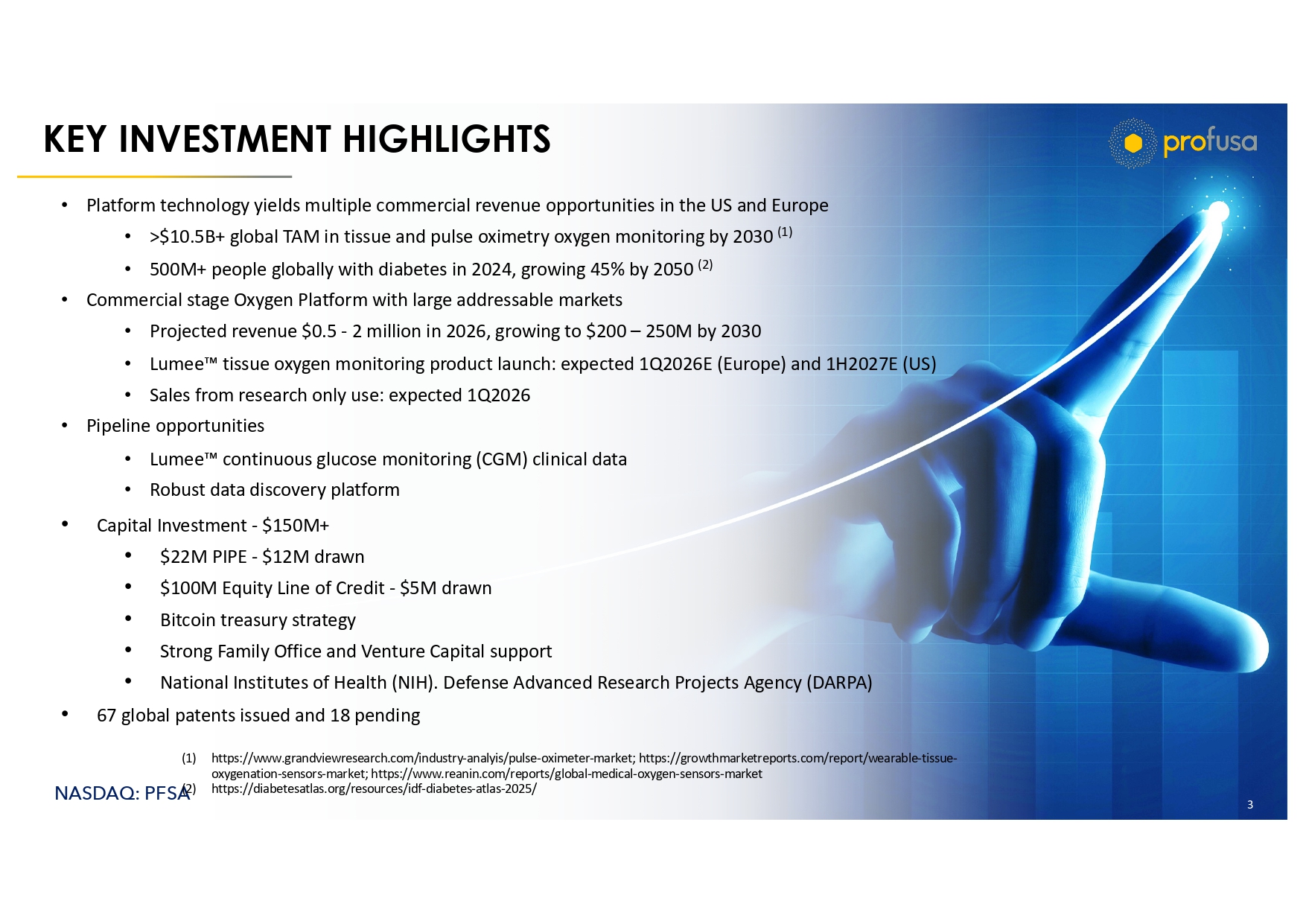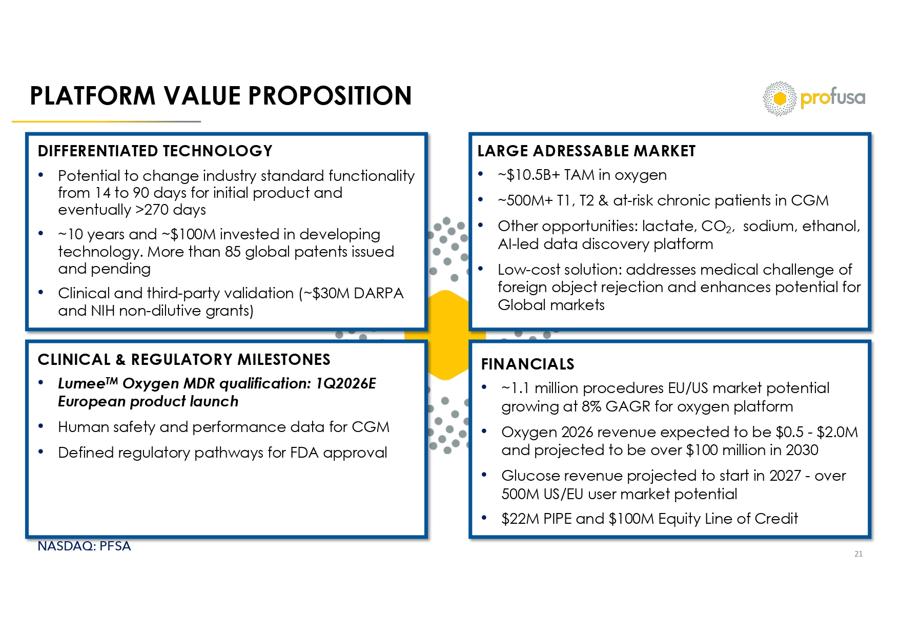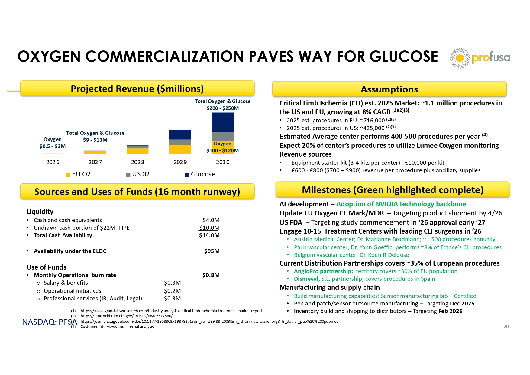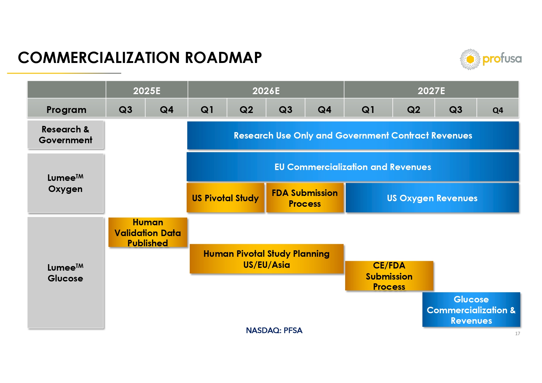 OXYGEN COMMERCIALIZATION PAVES WAY FOR GLUCOSE 20 202 6 202 7 EU O2 203 0 202 8 202 9 US 02 Glucose Projected Revenue ($millions) Assumptions Critical Limb Ischemia (CLI) est. 2025 Market: ~1.1 million procedures in the US and EU, growing at 8% CAGR (1)(2)(3) • 2025 est. procedures in EU: ~716,000 (2)(3) • 2025 est. procedures in US: ~425,000 (2)(3) Estimated Average center performs 400 - 500 procedures per year (4) Expect 20% of center’s procedures to utilize Lumee Oxygen monitoring Revenue sources • Equipment starter kit (3 - 4 kits per center) - €10,000 per kit • €600 - €800 ($700 – $900) revenue per procedure plus ancillary supplies Milestones (Green highlighted complete) AI development – Adoption of NVIDIA technology backbone Update EU Oxygen CE Mark/MDR – Targeting product shipment by 4/26 US FDA – Targeting study commencement in ‘26 approval early ‘27 Engage 10 - 15 Treatment Centers with leading CLI surgeons in ‘26 • Austria Medical Center; Dr. Marianne Brodmann; ~1,500 procedures annually • Paris vascular center; Dr. Yann Goeffic; performs ~8% of France’s CLI procedures • Belgium vascular center; Dr. Koen R Deloose Current Distribution Partnerships covers ~35% of European procedures • AngioPro partnership; territory covers ~30% of EU population • Dismeval, S.L. partnership; covers procedures in Spain Manufacturing and supply chain • Build manufacturing capabilities: Sensor manufacturing lab – Certified • Pen and patch/sensor outsource manufacturing – Targeting Dec 2025 • I nventory build and shipping to distributors – Targeting Feb 2026 $4.0M $10.0M • Cash and cash equivalents • Undrawn cash portion of $22M PIPE $14.0M • Total Cash Availability $95M • Availability under the ELOC $0.8M $0.3M Use of Funds • Monthly Operational burn rate o Salary & benefits $0.2M $0.3M o Operational initiatives o Professional services (IR, Audit, Legal) Sources and Uses of Funds (16 month runway) Liquidity Oxygen $100 - $120M $0.5 - $2M Total Oxygen & Glucose Oxygen $9 - $13M Total Oxygen & Glucose $200 - $250M (1) https:// www.grandviewresearch.com/industry - analysis/critical - limb - ischemia - treatment - market - report (2) https://pmc.ncbi.nlm.nih.gov/articles/PMC6617560/ NASDAQ: PF S ( A 3 ) https://journals.sagepub.com/doi/10.1177/1358863X19878271?url_ver=Z39.88 - 2003&rfr_id=ori:rid:crossref.org&rfr_dat=cr_pub%20%200pubmed (4) Customer interviews and internal analysis