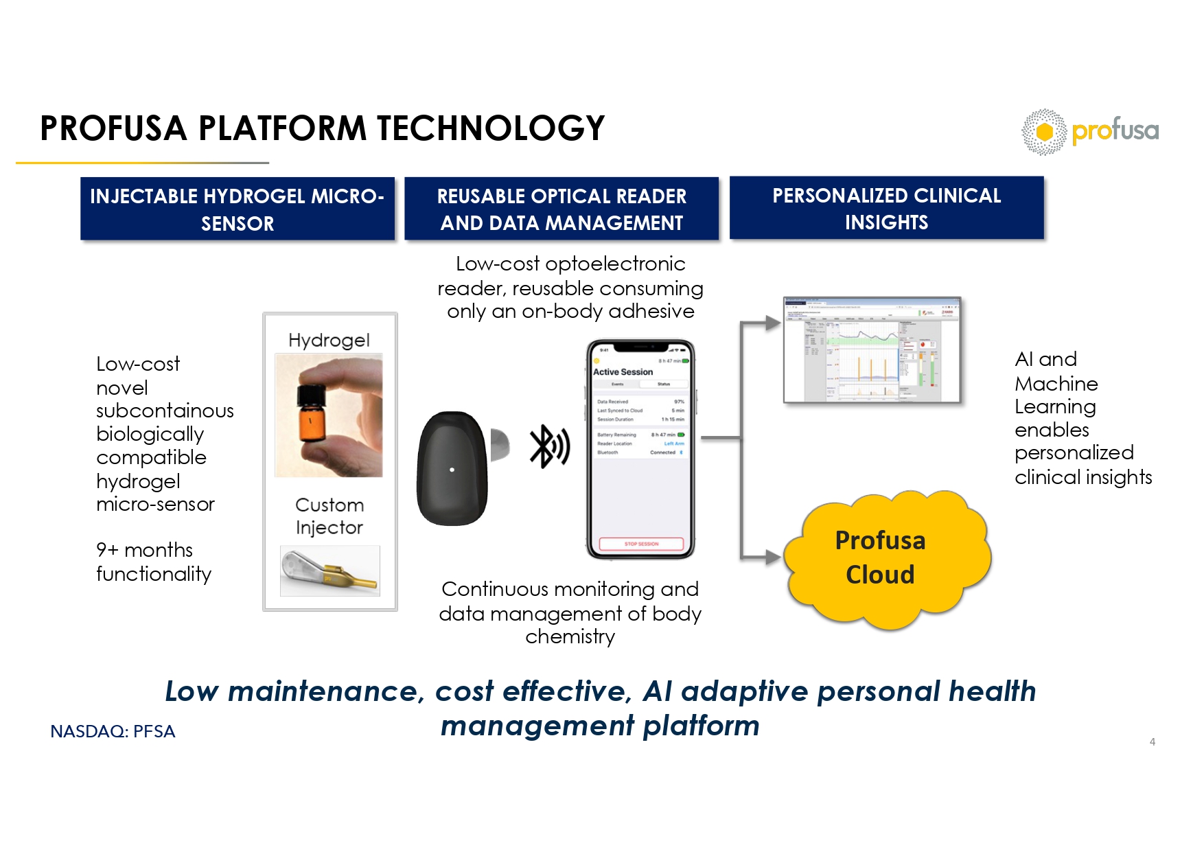 3 KEY INVESTMENT HIGHLIGHTS • Platform technology yields multiple commercial revenue opportunities in the US and Europe • >$10.5B+ global TAM in tissue and pulse oximetry oxygen monitoring by 2030 (1) • 500M+ people globally with diabetes in 2024, growing 45% by 2050 (2) • Commercial stage Oxygen Platform with large addressable markets • Projected revenue $0.5 - 2 million in 2026, growing to $200 – 250M by 2030 • Lumee tissue oxygen monitoring product launch: expected 1Q2026E (Europe) and 1H2027E (US) • Sales from research only use: expected 1Q2026 • Pipeline opportunities • Lumee continuous glucose monitoring (CGM) clinical data • Robust data discovery platform • Capital Investment - $150M+ • $22M PIPE - $12M drawn • $100M Equity Line of Credit - $5M drawn • Bitcoin treasury strategy • Strong Family Office and Venture Capital support • National Institutes of Health (NIH). Defense Advanced Research Projects Agency (DARPA) • 67 global patents issued and 18 pending (1) https:// www.grandviewresearch.com/industry - analyis/pulse - oximeter - market; https://growthmarketreports.com/report/wearable - tissue - oxygenation - sensors - market; https:// www.reanin.com/reports/global - medical - oxygen - sensors - market NASDAQ: PF S A ( 2 ) https://diabetesatlas.org/resources/idf - diabetes - atlas - 2025/