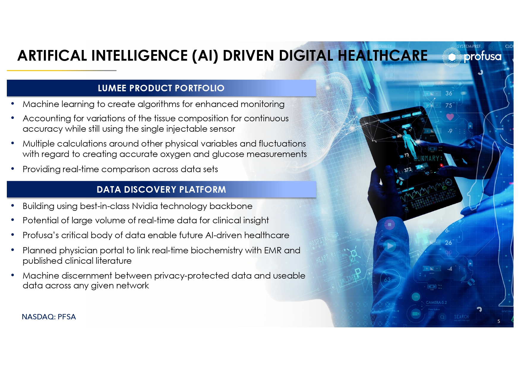 NASDAQ: PFSA PROFUSA PLATFORM TECHNOLOGY 4 Profusa Cloud Low maintenance, cost effective, AI adaptive personal health management platform Low - cost novel subcontainous biologically compatible hydrogel micro - sensor 9+ months functionality INJECTABLE HYDROGEL MICRO - SENSOR REUSABLE OPTICAL READER AND DATA MANAGEMENT Continuous monitoring and data management of body chemistry PERSONALIZED CLINICAL INSIGHTS Low - cost optoelectronic reader, reusable consuming only an on - body adhesive AI and Machine Learning enables personalized clinical insights