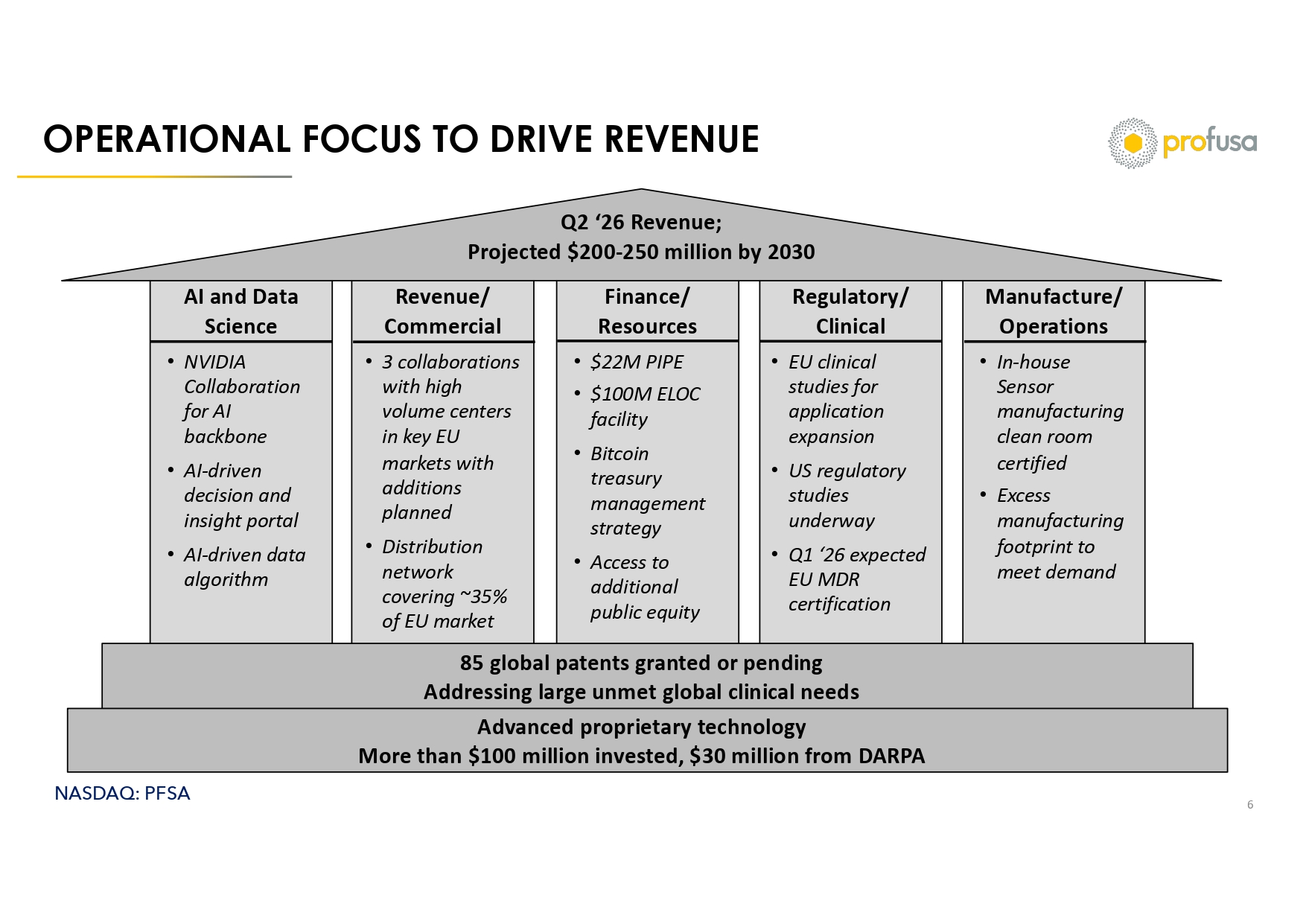 NASDAQ: PFSA 5 ARTIFICAL INTELLIGENCE (AI) DRIVEN DIGITAL HEALTHCARE LUMEE PRODUCT PORTFOLIO • Machine learning to create algorithms for enhanced monitoring • Accounting for variations of the tissue composition for continuous accuracy while still using the single injectable sensor • Multiple calculations around other physical variables and fluctuations with regard to creating accurate oxygen and glucose measurements • Providing real - time comparison across data sets DATA DISCOVERY PLATFORM • Building using best - in - class Nvidia technology backbone • Potential of large volume of real - time data for clinical insight • Profusa’s critical body of data enable future AI - driven healthcare • Planned physician portal to link real - time biochemistry with EMR and published clinical literature • Machine discernment between privacy - protected data and useable data across any given network