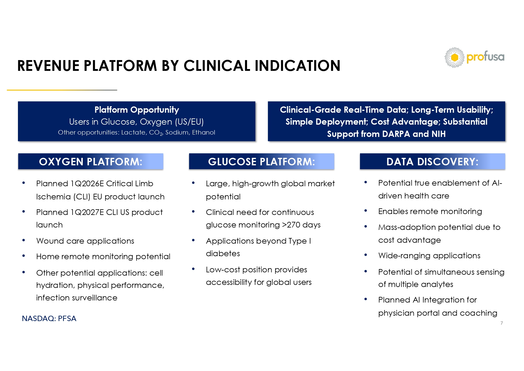 NASDAQ: PFSA OPERATIONAL FOCUS TO DRIVE REVENUE 6 Q2 ‘26 Revenue; Projected $200 - 250 million by 2030 Manufacture/ Operations Regulatory/ Clinical Finance/ Resources Revenue/ Commercial AI and Data Science • In - house Sensor manufacturing clean room certified • Excess manufacturing footprint to meet demand • EU clinical studies for application expansion • US regulatory studies underway • Q1 ‘26 expected EU MDR certification • $22M PIPE • $100M ELOC facility • Bitcoin treasury management strategy • Access to additional public equity • 3 collaborations with high volume centers in key EU markets with additions planned • Distribution network covering ~35% of EU market • NVIDIA Collaboration for AI backbone • AI - driven decision and insight portal • AI - driven data algorithm 85 global patents granted or pending Addressing large unmet global clinical needs Advanced proprietary technology More than $100 million invested, $30 million from DARPA