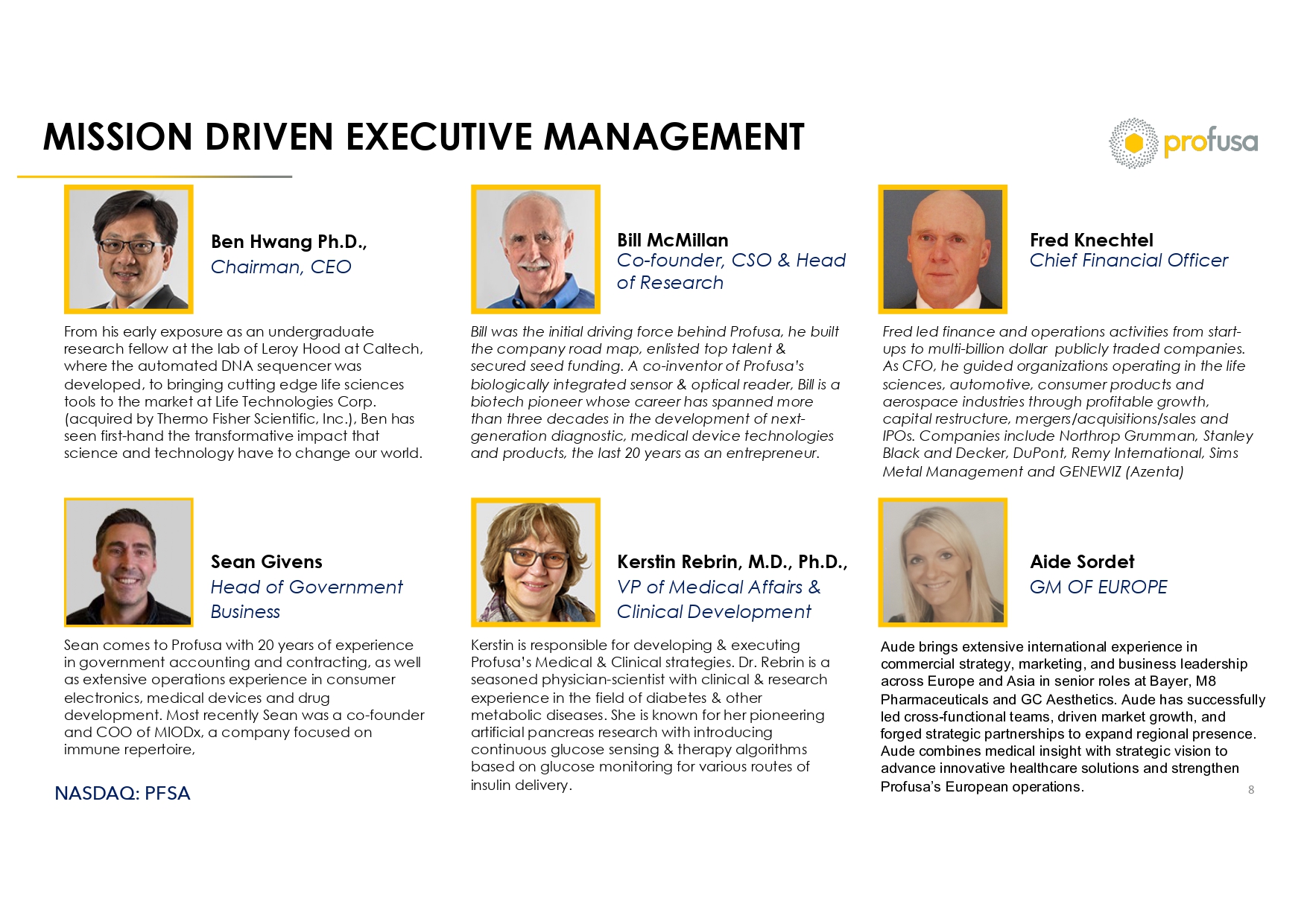 NASDAQ: PFSA MISSION DRIVEN EXECUTIVE MANAGEMENT 8 Ben Hwang Ph.D., Chairman, CEO From his early exposure as an undergraduate research fellow at the lab of Leroy Hood at Caltech, where the automated DNA sequencer was developed, to bringing cutting edge life sciences tools to the market at Life Technologies Corp. (acquired by Thermo Fisher Scientific, Inc.), Ben has seen first - hand the transformative impact that science and technology have to change our world. Bill McMillan Co - founder, CSO & Head of Research Bill was the initial driving force behind Profusa, he built the company road map, enlisted top talent & secured seed funding. A co - inventor of Profusa’s biologically integrated sensor & optical reader, Bill is a biotech pioneer whose career has spanned more than three decades in the development of next - generation diagnostic, medical device technologies and products, the last 20 years as an entrepreneur. Fred Knechtel Chief Financial Officer Fred led finance and operations activities from start - ups to multi - billion dollar publicly traded companies. As CFO, he guided organizations operating in the life sciences, automotive, consumer products and aerospace industries through profitable growth, capital restructure, mergers/acquisitions/sales and IPOs. Companies include Northrop Grumman, Stanley Black and Decker, DuPont, Remy International, Sims Metal Management and GENEWIZ (Azenta) Sean Givens Head of Government Business Sean comes to Profusa with 20 years of experience in government accounting and contracting, as well as extensive operations experience in consumer electronics, medical devices and drug development. Most recently Sean was a co - founder and COO of MIODx, a company focused on immune repertoire, Kerstin Rebrin, M.D., Ph.D., VP of Medical Affairs & Clinical Development Kerstin is responsible for developing & executing Profusa’s Medical & Clinical strategies. Dr. Rebrin is a seasoned physician - scientist with clinical & research experience in the field of diabetes & other metabolic diseases. She is known for her pioneering artificial pancreas research with introducing continuous glucose sensing & therapy algorithms based on glucose monitoring for various routes of insulin delivery. Aide Sordet GM OF EUROPE Aude brings extensive international experience in commercial strategy, marketing, and business leadership across Europe and Asia in senior roles at Bayer, M8 Pharmaceuticals and GC Aesthetics. Aude has successfully led cross - functional teams, driven market growth, and forged strategic partnerships to expand regional presence. Aude combines medical insight with strategic vision to advance innovative healthcare solutions and strengthen Profusa’s European operations.