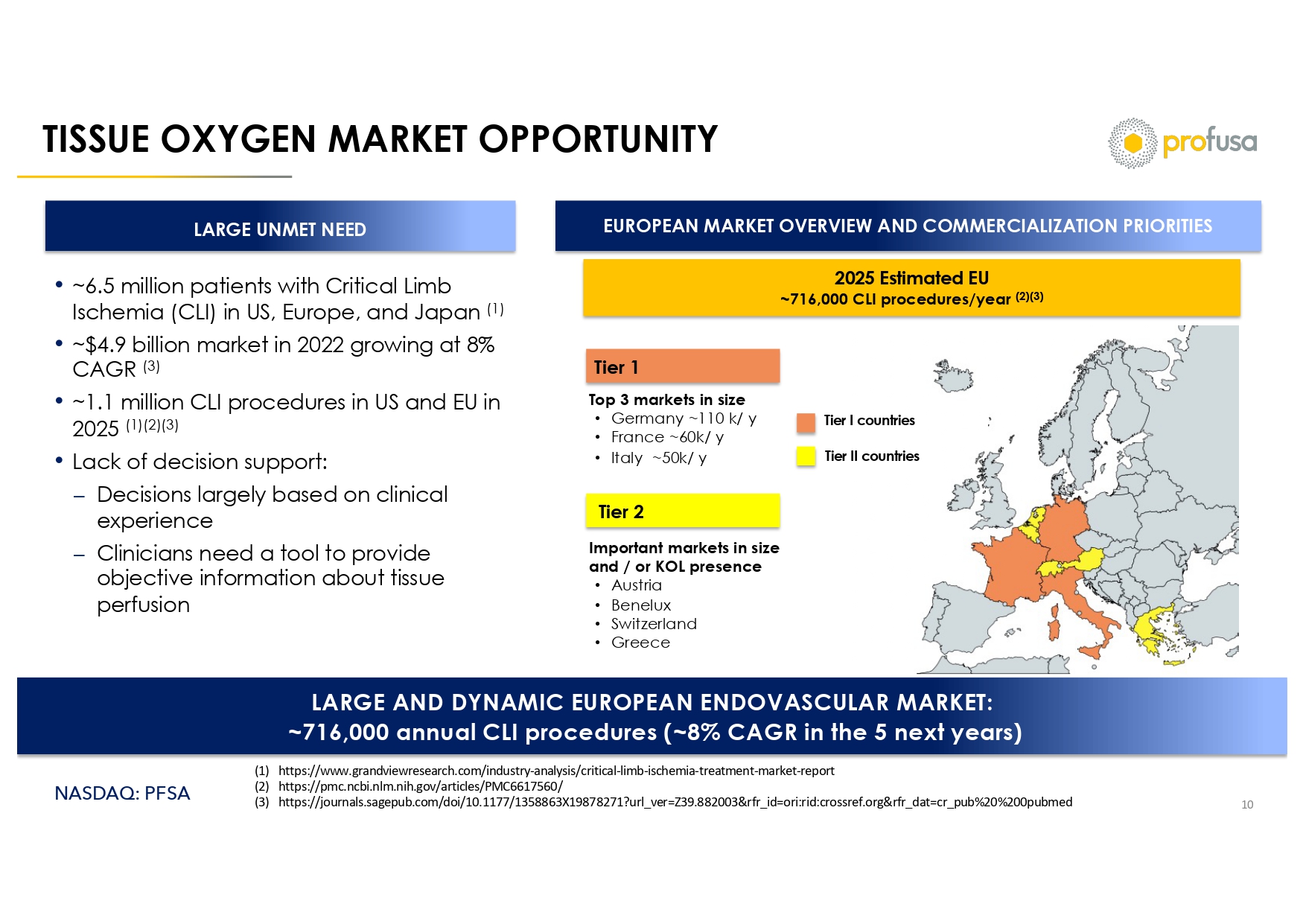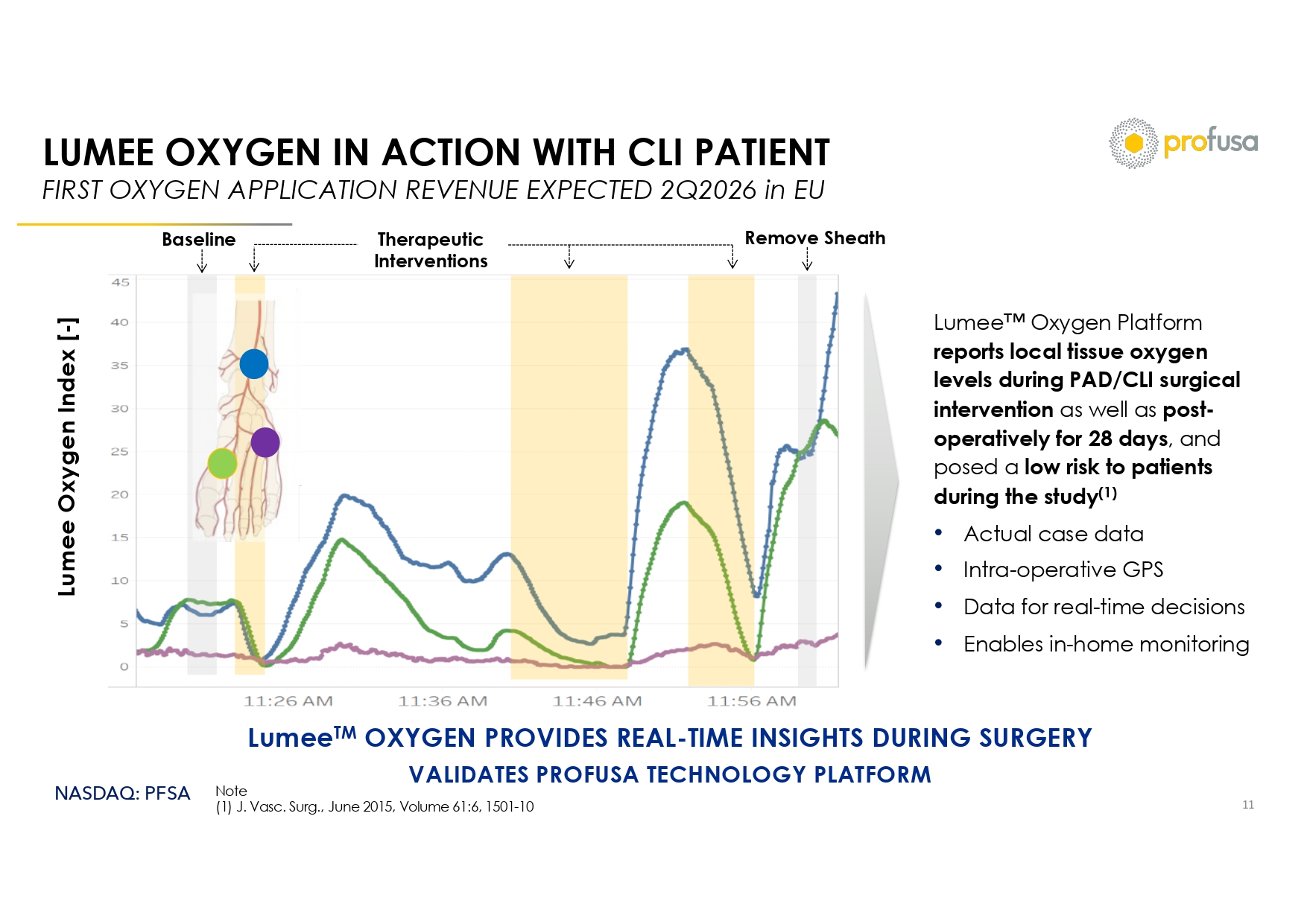 NASDAQ: PFSA TISSUE OXYGEN MARKET OPPORTUNITY 10 LARGE UNMET NEED • ~6.5 million patients with Critical Limb Ischemia (CLI) in US, Europe, and Japan (1) • ~$4.9 billion market in 2022 growing at 8% CAGR (3) • ~1.1 million CLI procedures in US and EU in 2025 (1)(2)(3) • Lack of decision support: – Decisions largely based on clinical experience – Clinicians need a tool to provide objective information about tissue perfusion EUROPEAN MARKET OVERVIEW AND COMMERCIALIZATION PRIORITIES 2025 Estimated EU ~716,000 CLI procedures/year (2)(3) Top 3 markets in size • Germany ~110 k/ y • France ~60k/ y • Italy ~50k/ y Important markets in size and / or KOL presence • Austria • Benelux • Switzerland • Greece Tier I countries Tier II countries Tier 1 Tier 2 LARGE AND DYNAMIC EUROPEAN ENDOVASCULAR MARKET: ~716,000 annual CLI procedures (~8% CAGR in the 5 next years) (1) https:// www.grandviewresearch.com/industry - analysis/critical - limb - ischemia - treatment - market - report (2) https://pmc.ncbi.nlm.nih.gov/articles/PMC6617560/ (3) https://journals.sagepub.com/doi/10.1177/1358863X19878271?url_ver=Z39.882003&rfr_id=ori:rid:crossref.org&rfr_dat=cr_pub%20%20 0pu bmed