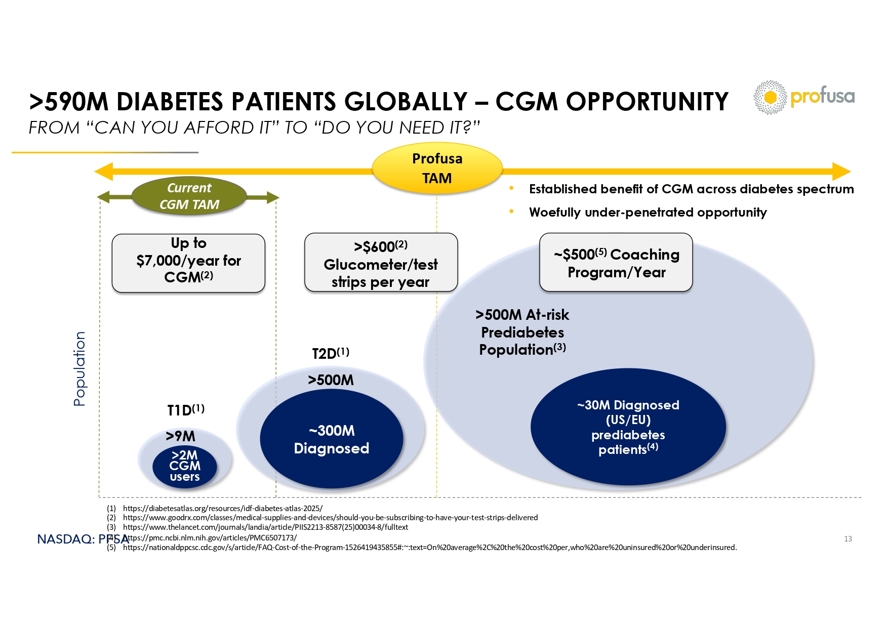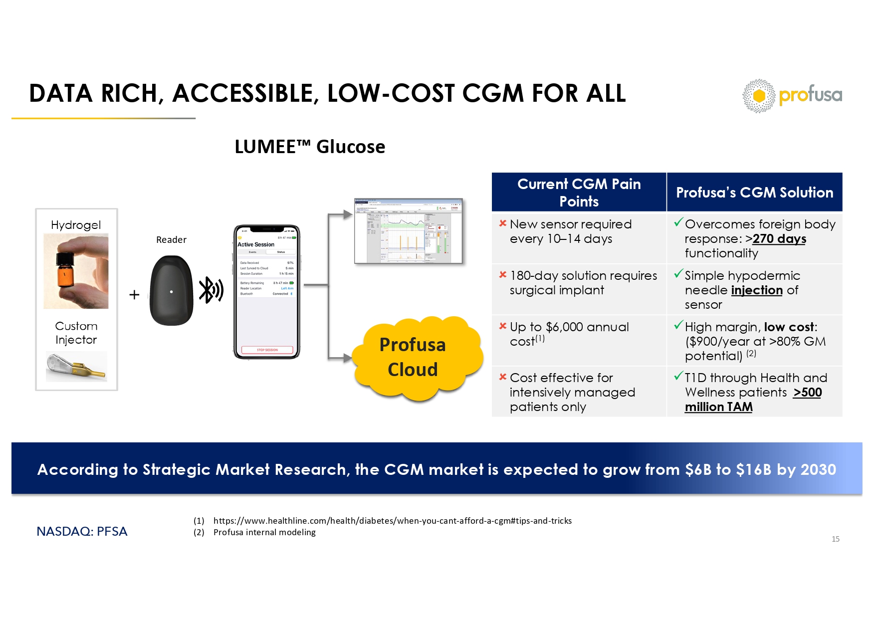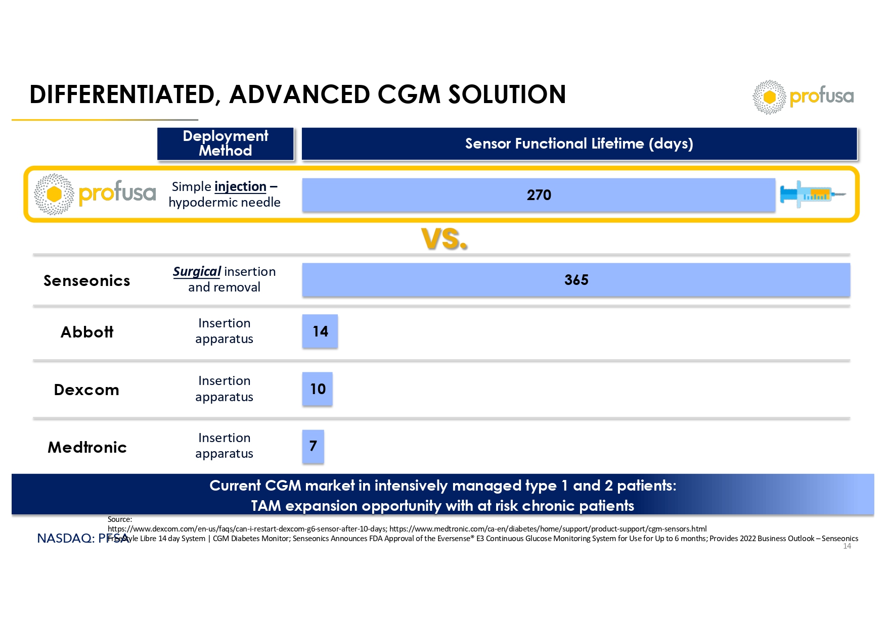 >590M DIABETES PATIENTS GLOBALLY – CGM OPPORTUNITY 13 Current CGM TAM FROM “CAN YOU AFFORD IT” TO “DO YOU NEED IT?” Profusa TAM • Established benefit of CGM across diabetes spectrum • Woefully under - penetrated opportunity >2M CGM users ~300M Diagnosed ~30M Diagnosed (US/EU) prediabetes patients (4) Population >500M At - risk Prediabetes Population (3) T1D (1) >9M T2D (1) >500M Up to $7,000/year for CGM (2) >$600 (2) Glucometer/test strips per year ~$500 (5) Coaching Program/Year (1) https://diabetesatlas.org/resources/idf - diabetes - atlas - 2025/ (2) https:// www.goodrx.com/classes/medical - supplies - and - devices/should - you - be - subscribing - to - have - your - test - strips - delivered (3) https:// www.thelancet.com/journals/landia/article/PIIS2213 - 8587(25)00034 - 8/fulltext NASDAQ: P F ( 4 ) S A h tt ps : //p m c . n cb i . n l m . n i h . g o v / a rt i c l es/P M C6507173 / (5) https://nationaldppcsc.cdc.gov/s/article/FAQ - Cost - of - the - Program - 1526419435855#:~:text=On%20average%2C%20the%20cost%20per,who%20are%20uninsured%20or%20underinsured.