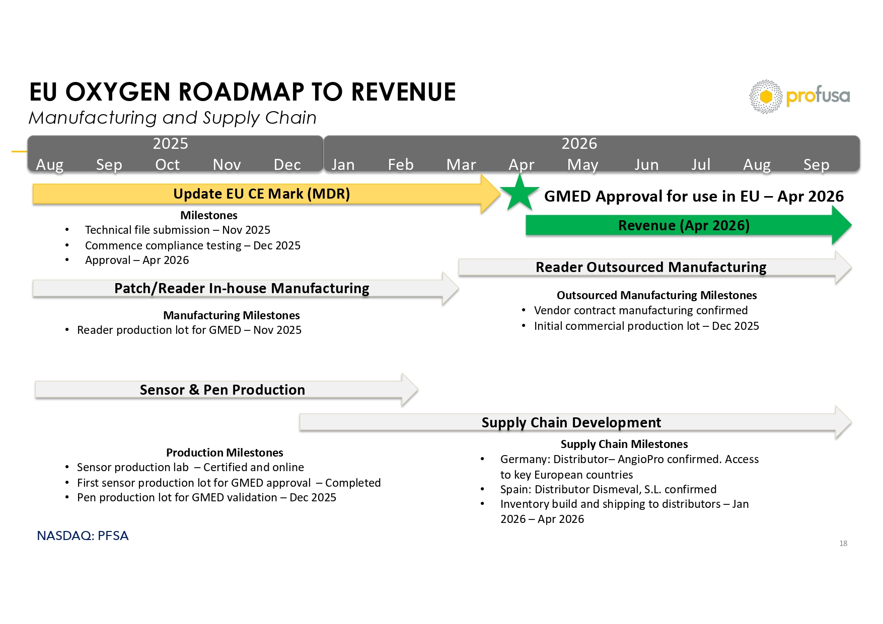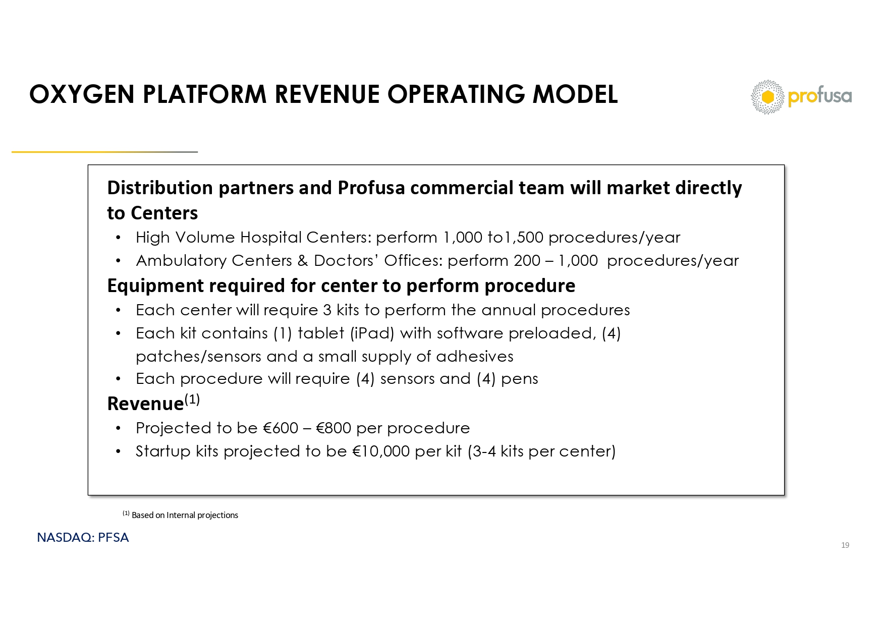 NASDAQ: PFSA EU OXYGEN ROADMAP TO REVENUE Manufacturing and Supply Chain 2025 Aug Sep Oct Nov Dec Jan Feb Mar 18 Update EU CE Mark (MDR) Milestones • Technical file submission – Nov 2025 • Commence compliance testing – Dec 2025 • Approval – Apr 2026 Sensor & Pen Production Production Milestones • Sensor production lab – Certified and online • First sensor production lot for GMED approval – Completed • Pen production lot for GMED validation – Dec 2025 Patch/Reader In - house Manufacturing Manufacturing Milestones • Reader production lot for GMED – Nov 2025 2026 Apr May Jun Jul Aug Sep GMED Approval for use in EU – Apr 2026 Revenue (Apr 2026) Reader Outsourced Manufacturing Outsourced Manufacturing Milestones • Vendor contract manufacturing confirmed • Initial commercial production lot – Dec 2025 Supply Chain Development Supply Chain Milestones • Germany: Distributor – AngioPro confirmed. Access to key European countries • Spain: Distributor Dismeval, S.L. confirmed • Inventory build and shipping to distributors – Jan 2026 – Apr 2026