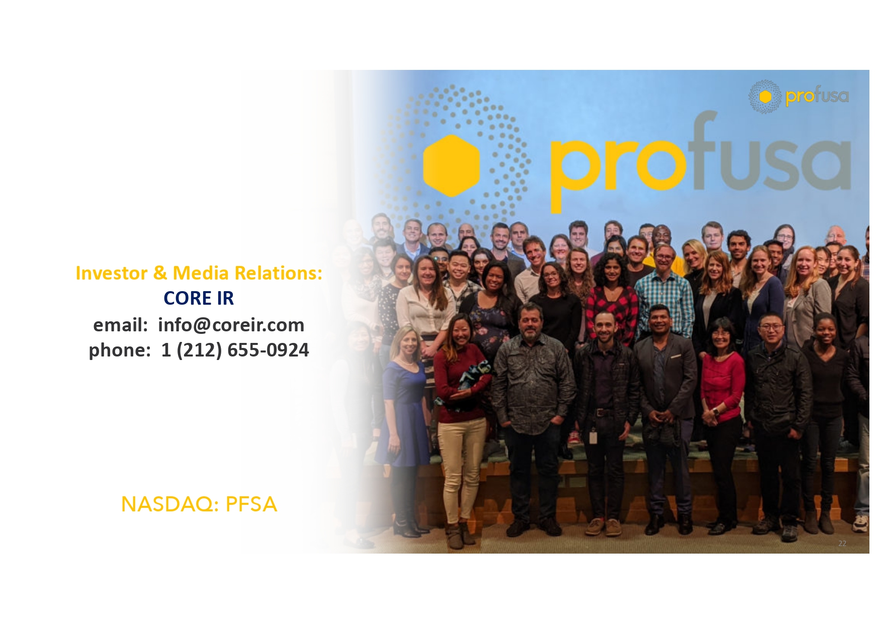 NASDAQ: PFSA PLATFORM VALUE PROPOSITION 21 DIFFERENTIATED TECHNOLOGY • Potential to change industry standard functionality from 14 to 90 days for initial product and eventually >270 days • ~10 years and ~$100M invested in developing technology. More than 85 global patents issued and pending • Clinical and third - party validation (~$30M DARPA and NIH non - dilutive grants) CLINICAL & REGULATORY MILESTONES • Lumee TM Oxygen MDR qualification: 1Q2026E European product launch • Human safety and performance data for CGM • Defined regulatory pathways for FDA approval LARGE ADRESSABLE MARKET • ~$10.5B+ TAM in oxygen • ~500M+ T1, T2 & at - risk chronic patients in CGM • Other opportunities: lactate, CO 2 , sodium, ethanol, AI - led data discovery platform • Low - cost solution: addresses medical challenge of foreign object rejection and enhances potential for Global markets FINANCIALS • ~1.1 million procedures EU/US market potential growing at 8% GAGR for oxygen platform • Oxygen 2026 revenue expected to be $0.5 - $2.0M and projected to be over $100 million in 2030 • Glucose revenue projected to start in 2027 - over 500M US/EU user market potential • $22M PIPE and $100M Equity Line of Credit