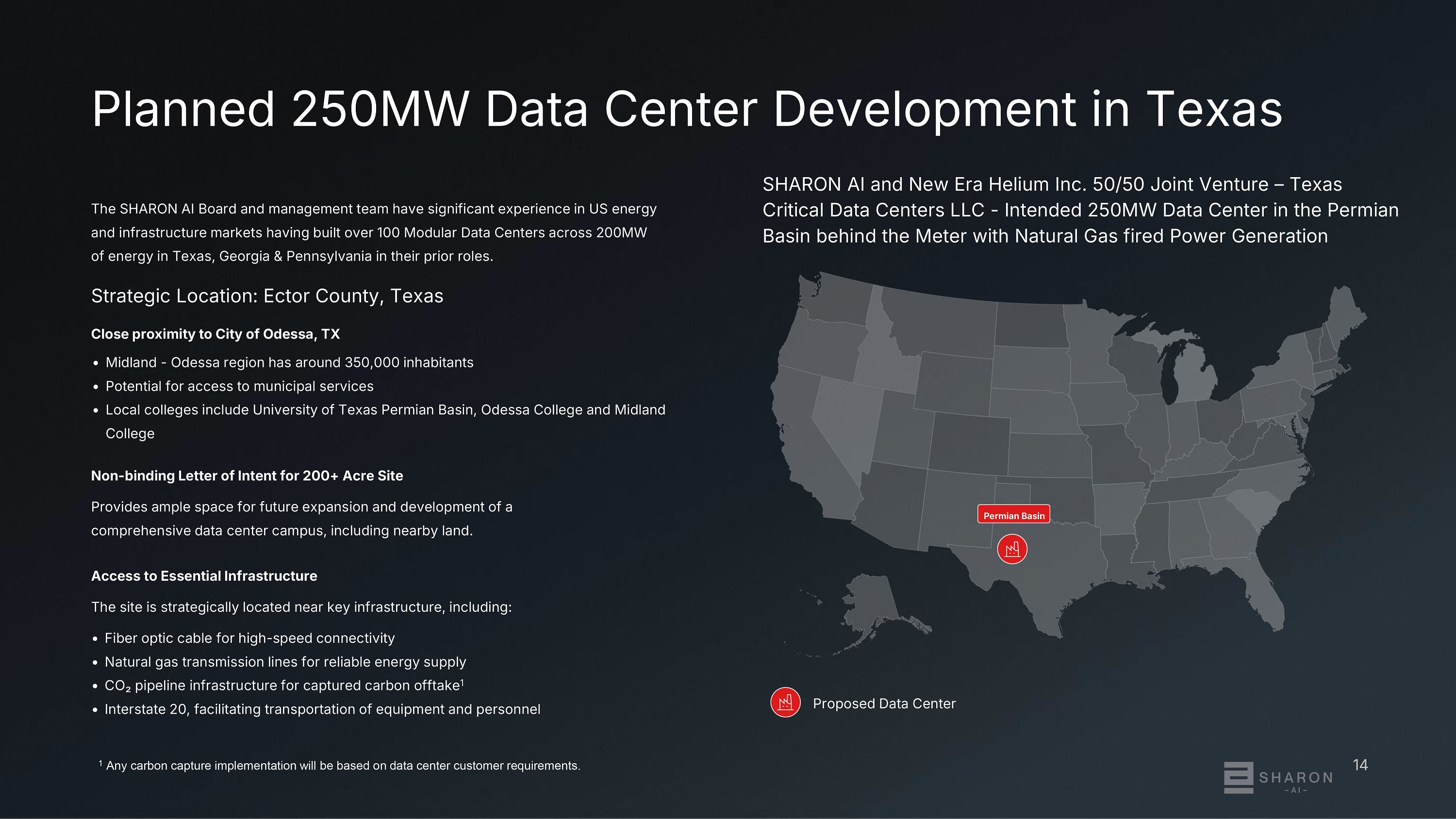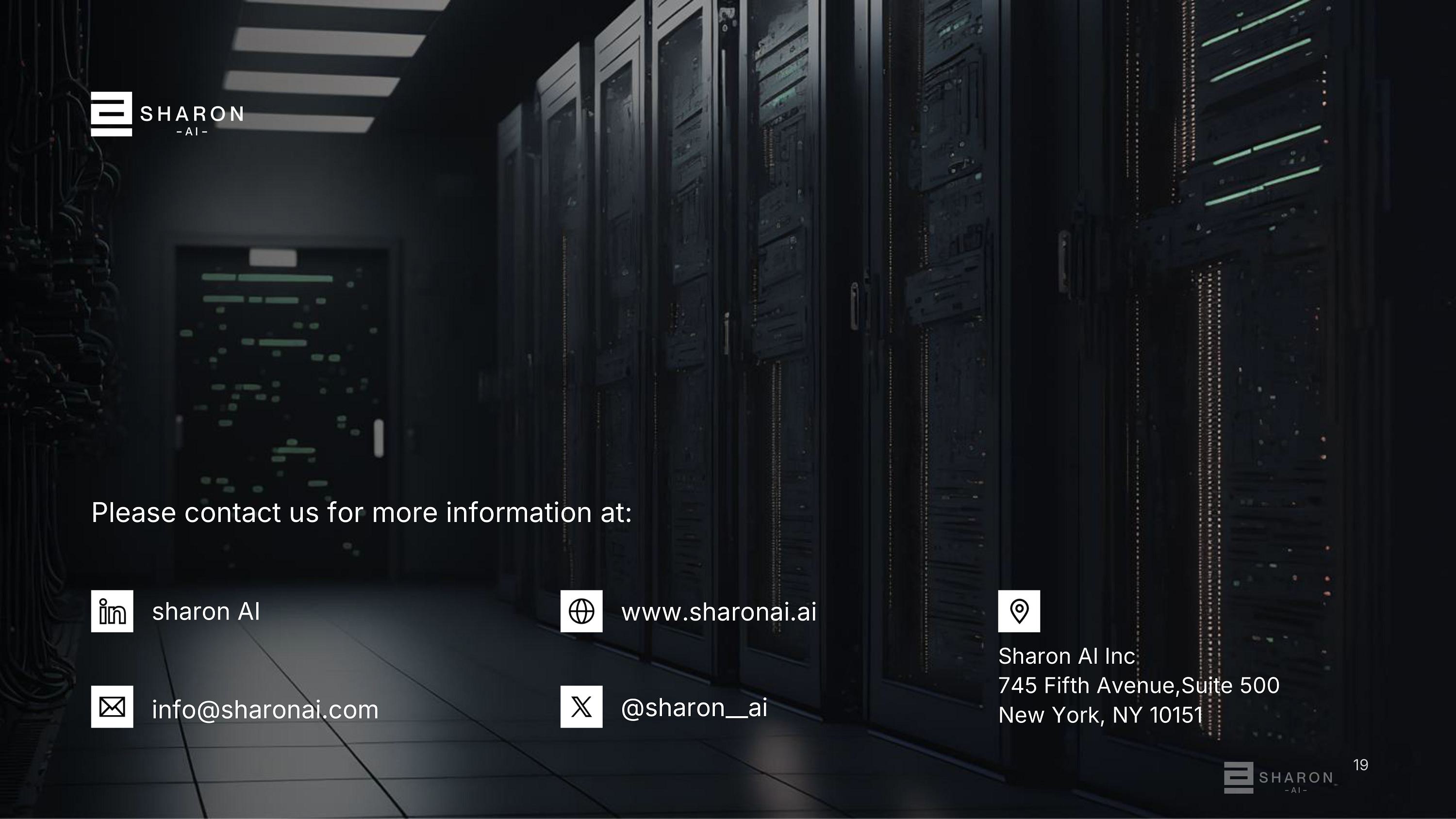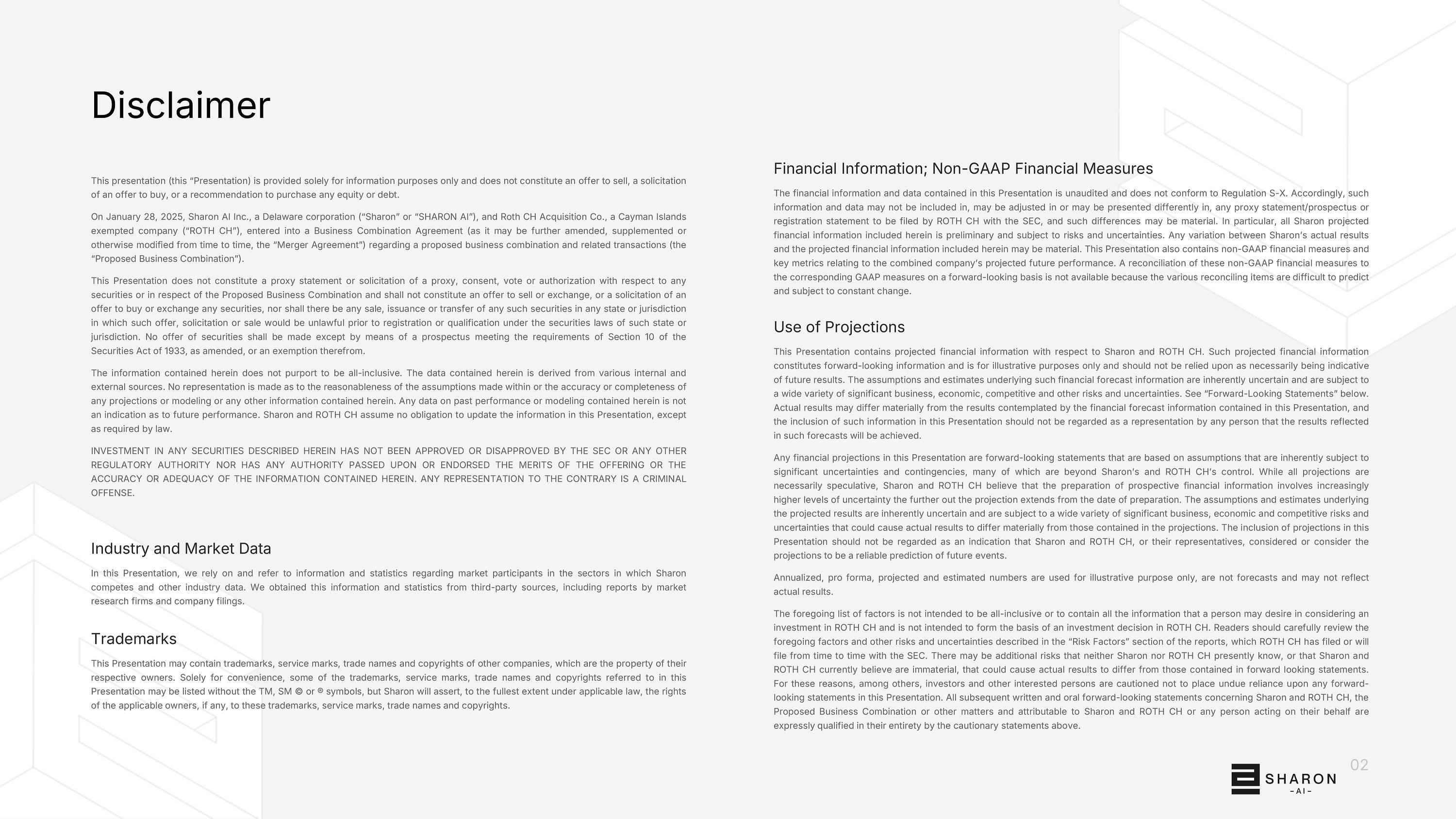 business strategies, events or results of operations, are forward - looking statements . These statements may be preceded by, followed by or include the words “believes,” “estimates,” “expects,” “projects,” “forecasts,” “may,” “will,” “should,” “seeks,” “plans,” “scheduled,” “anticipates,” “intends,” or similar expressions . Such forward - looking statements involve risks and uncertainties that may cause actual events, results or performance to differ materially from those indicated by such statements . Certain of these risks are identified and discussed in ROTH CH’s most recent 10 - K, dated March 28 , 2025 , under the heading “Risk Factors . ” These risk factors will be important to consider in determining future results and should be reviewed in their entirety . These forward - looking statements are expressed in good faith, and ROTH CH and Sharon believe there is a reasonable basis for them . However, there can be no assurance that the events, results or trends identified in these forward - looking statements will occur or be achieved . Forward - looking statements speak only as of the date they are made, and neither ROTH CH nor Sharon is under any obligation, and expressly disclaim any obligation, to update, alter or otherwise revise any forward - looking statement, whether as a result of new information, future events or otherwise, except as required by law . ​​ In addition to factors previously disclosed in ROTH CH’s reports filed with the SEC and those identified elsewhere in this Presentation, the following factors, among others, could cause actual results to differ materially from forward - looking statements or historical performance : (i) expectations regarding Sharon’s strategies and future financial performance, including its future business plans or objectives, prospective performance and opportunities and competitors, revenues, products and services, pricing, operating expenses, market trends, liquidity, cash flows and uses of cash, capital expenditures, and Sharon’s ability to invest in growth initiatives and pursue acquisition opportunities ; (ii) the occurrence of any event, change or other circumstances that could give rise to the termination of the Merger Agreement ; (iii) the outcome of any legal proceedings that may be instituted against Sharon or ROTH CH following announcement of the Proposed Business Combination and the transactions contemplated thereby ; (iv) the inability to complete the Proposed Business Combination due to, among other things, the failure to obtain ROTH CH stockholder approval on the expected terms and schedule, as well as the risk that regulatory approvals required for the Proposed Business Combination are not obtained or are obtained subject to conditions that are not anticipated ; (v) the failure to complete the planned PIPE financing ; (vi) the risk that the announcement and consummation of the Proposed Business Combination disrupts Sharon’s current operations and future plans ; (vii) the ability to recognize the anticipated benefits of the Proposed Business Combination ; (viii) unexpected costs related to the Proposed Business Combination ; (ix) limited liquidity and trading of ROTH CH’s securities ; (x) geopolitical risk and changes in applicable laws or regulations ; (xiv) the possibility that ROTH CH and/or Sharon may be adversely affected by other economic, business, and/or competitive factors ; (xi) operational risk ; (xii) risk that the COVID - 19 pandemic, and local, state, and federal responses to addressing the pandemic may have an adverse effect on our business operations, as well as our financial condition and results of operations ; (xiii) the risks that the consummation of the Proposed Business Combination is substantially delayed or does not occur ; (xiv) the risk that Sharon will be unable to complete the Supercluster ; and (xv) the risk that Sharon will be unable to complete the Texas Critical Data Center development project . Important Information About the Proposed Business Combination and Where to Find It​ In connection with the Proposed Business Combination, Roth CH Holdings, Inc . , a Delaware corporation and a wholly - owned subsidiary of ROTH CH (“Holdings”) has filed with the SEC a preliminary registration statement on Form S - 4 on May 14 , 2025 , which includes a definitive proxy statement of ROTH CH and a prospectus of Holdings for the registration of Holdings securities (as amended from time to time, the “Registration Statement”) . A full description of the terms of the Proposed Business Combination is provided in the Registration Statement . ROTH CH urges investors, stockholders and other interested persons to read the Registration Statement and the definitive proxy statement/prospectus, as well as other documents filed with the SEC because these documents will contain important information about Sharon, ROTH CH, Holdings and the Proposed Business Combination . After the Registration Statement has been declared effective by the SEC, the definitive proxy statement/prospectus and other relevant documents will be mailed to stockholders of ROTH CH as of a record date established for voting on the Proposed Business Combination . Stockholders and other interested persons will also be able to obtain a copy of the proxy statement, without charge, by directing a request to : Roth CH Acquisition Co . , 888 San Clemente Drive, Suite 400 , Newport Beach, CA 92660 . The definitive proxy statement/prospectus, can also be obtained, without charge, at the SEC's website ( www . sec . gov ) . The information contained on, or that may be accessed through, the websites referenced in this Presentation is not incorporated by reference into, and is not a part of, this Presentation . ​ Participants in the Solicitation​​ Sharon, ROTH CH and their respective directors and executive officers may be considered participants in the solicitation of proxi