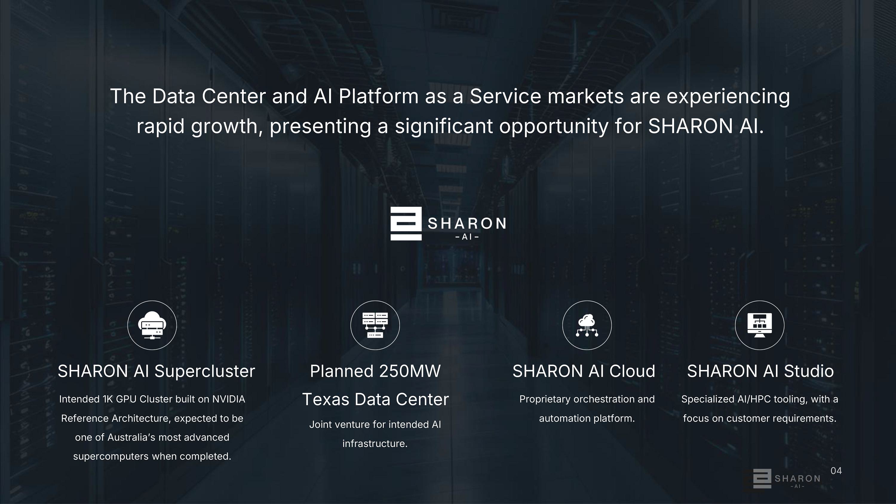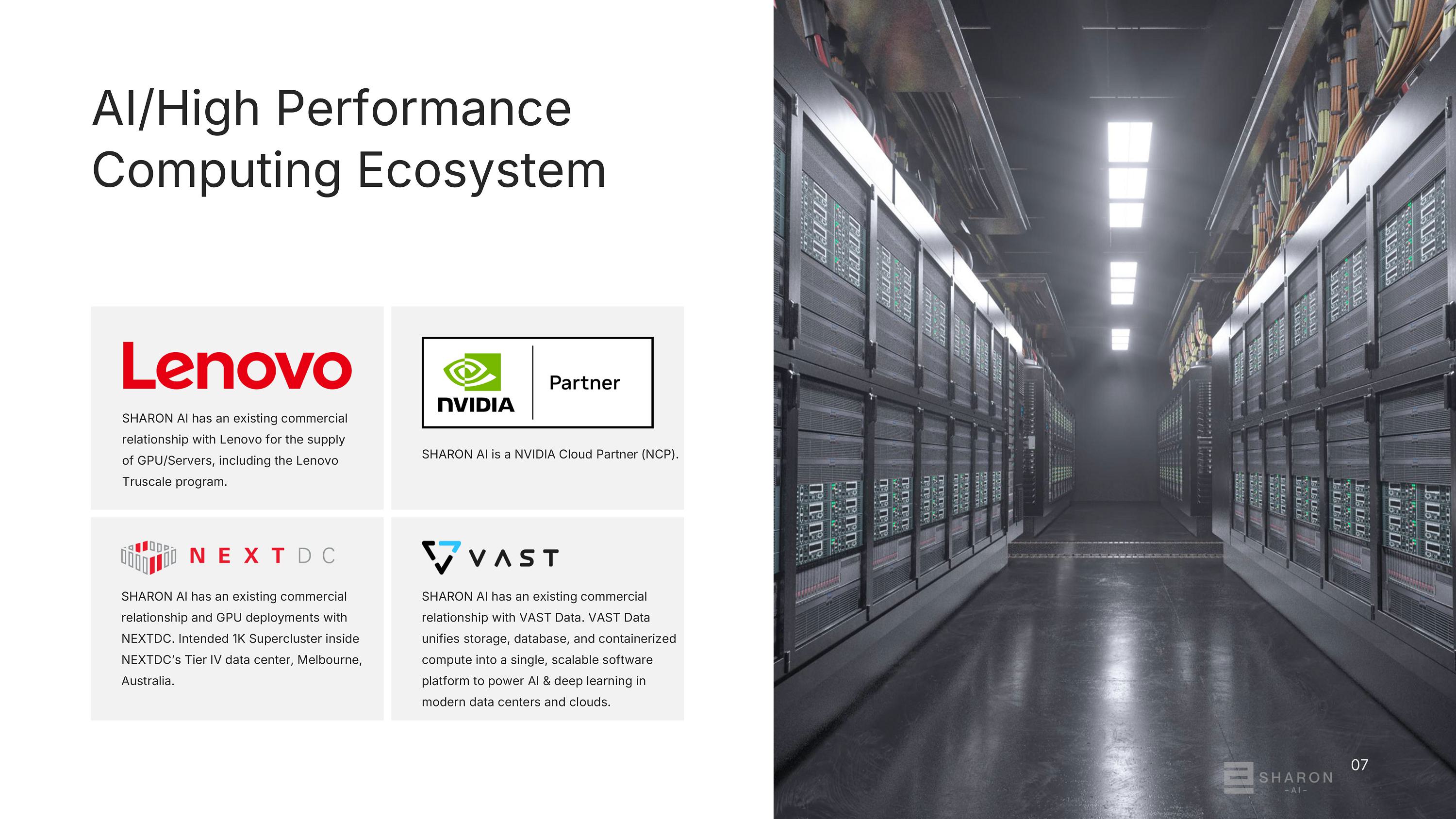 AI/High Performance Computing Ecosystem SHARON AI is a NVIDIA Cloud Partner (NCP). SHARON AI has an existing commercial relationship with Lenovo for the supply of GPU/Servers, including the Lenovo Truscale program. SHARON AI has an existing commercial relationship and GPU deployments with NEXTDC. Intended 1K Supercluster inside NEXTDC’s Tier IV data center, Melbourne, Australia. SHARON AI has an existing commercial relationship with VAST Data. VAST Data unifies storage, database, and containerized compute into a single, scalable software platform to power AI & deep learning in modern data centers and clouds. 07