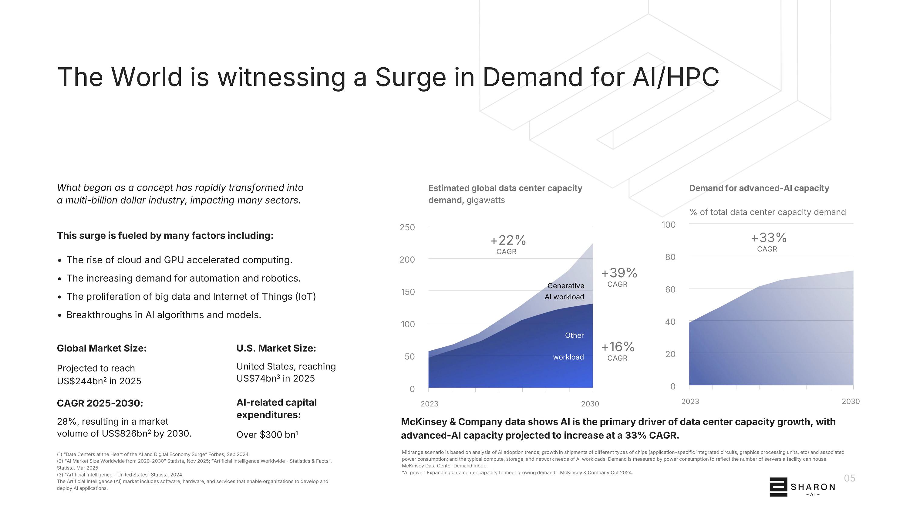 The World is witnessing a Surge in Demand for AI/HPC What began as a concept has rapidly transformed into a multi - billion dollar industry, impacting many sectors. This surge is fueled by many factors including: • The rise of cloud and GPU accelerated computing. • The increasing demand for automation and robotics. • The proliferation of big data and Internet of Things (IoT) • Breakthroughs in AI algorithms and models. 250 200 150 100 50 0 2023 2030 Generative Al workload +22% CAGR +39% CAGR +16% CAGR Estimated global data center capacity demand, gigawatts 100 80 60 40 20 0 2023 2030 +33% CAGR Demand for advanced - AI capacity % of total data center capacity demand Global Market Size: Projected to reach US$244bn 2 in 2025 CAGR 2025 - 2030: 28%, resulting in a market volume of US$826bn 2 by 2030. U.S. Market Size: United States, reaching US$74bn 3 in 2025 AI - related capital expenditures: Over $300 bn 1 Midrange scenario is based on analysis of Al adoption trends; growth in shipments of different types of chips (application - speci fic integrated circuits, graphics processing units, etc) and associated power consumption; and the typical compute, storage, and network needs of Al workloads. Demand is measured by power consumpti on to reflect the number of servers a facility can house. McKinsey Data Center Demand model “AI power: Expanding data center capacity to meet growing demand” McKinsey & Company Oct 2024. 05 McKinsey & Company data shows AI is the primary driver of data center capacity growth, with advanced - AI capacity projected to increase at a 33% CAGR. (1) “Data Centers at the Heart of the AI and Digital Economy Surge” Forbes, Sep 2024 (2) “AI Market Size Worldwide from 2020 - 2030” Statista, Nov 2025; “Artificial Intelligence Worldwide - Statistics & Facts”, Statista, Mar 2025 (3) “Artificial Intelligence - United States” Statista, 2024. The Artificial Intelligence (AI) market includes software, hardware, and services that enable organizations to develop and deploy AI applications.