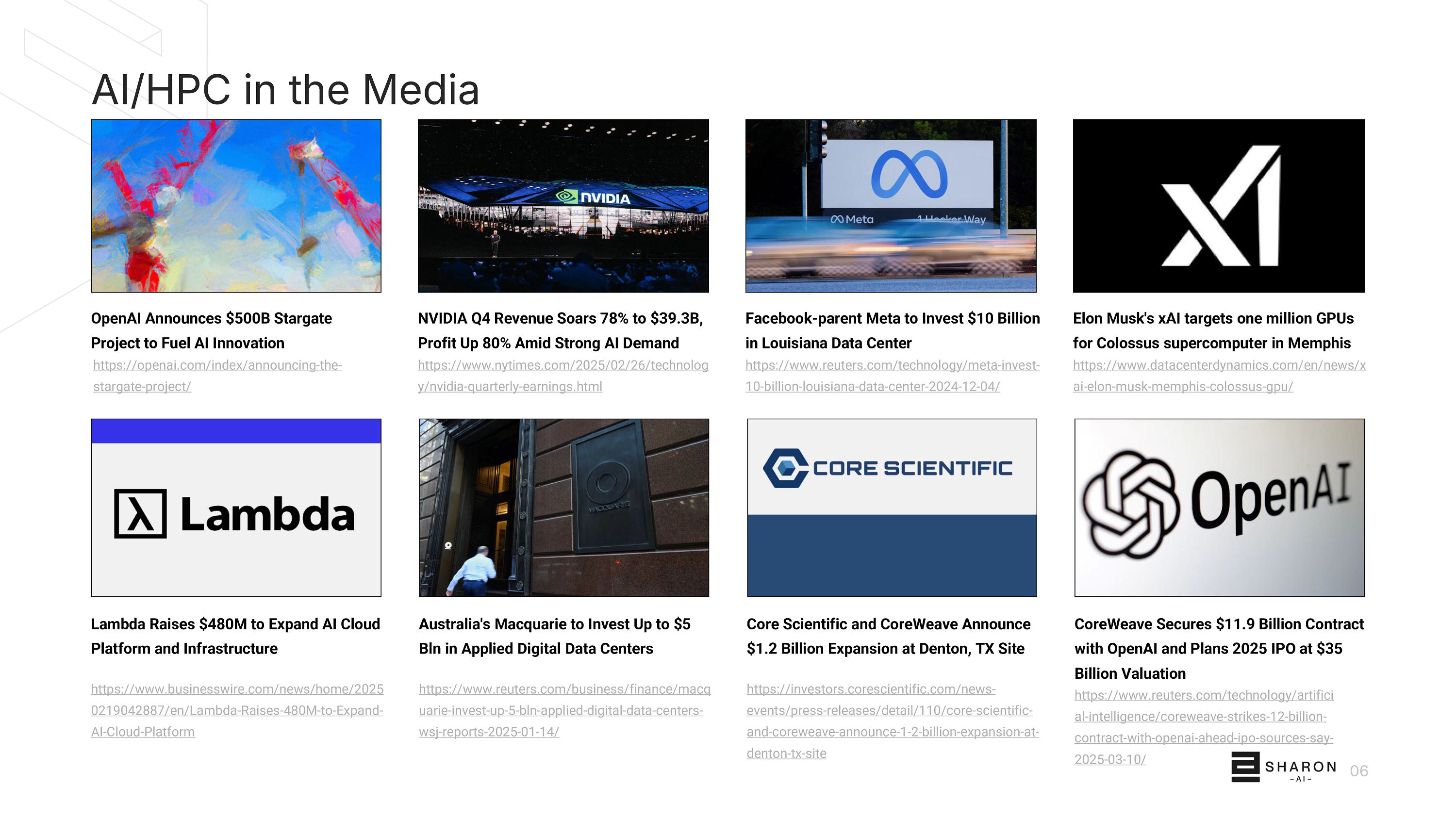 AI/HPC in the Media OpenAI Announces $500B Stargate Project to Fuel AI Innovation NVIDIA Q4 Revenue Soars 78% to $39.3B, Profit Up 80% Amid Strong AI Demand Facebook - parent Meta to Invest $10 Billion in Louisiana Data Center Elon Musk's xAI targets one million GPUs for Colossus supercomputer in Memphis Lambda Raises $480M to Expand AI Cloud Platform and Infrastructure Australia's Macquarie to Invest Up to $5 Bln in Applied Digital Data Centers Core Scientific and CoreWeave Announce $1.2 Billion Expansion at Denton, TX Site CoreWeave Secures $11.9 Billion Contract with OpenAI and Plans 2025 IPO at $35 Billion Valuation 06 https://openai.com/index/announcing - the - stargate - project/ https://www.nytimes.com/2025/02/26/technolog y/nvidia - quarterly - earnings.html https://www.reuters.com/technology/meta - invest - 10 - billion - louisiana - data - center - 2024 - 12 - 04/ https://www.datacenterdynamics.com/en/news/x ai - elon - musk - memphis - colossus - gpu/ https://www.businesswire.com/news/home/2025 0219042887/en/Lambda - Raises - 480M - to - Expand - AI - Cloud - Platform https://www.reuters.com/business/finance/macq uarie - invest - up - 5 - bln - applied - digital - data - centers - wsj - reports - 2025 - 01 - 14/ https://investors.corescientific.com/news - events/press - releases/detail/110/core - scientific - and - coreweave - announce - 1 - 2 - billion - expansion - at - denton - tx - site https://www.reuters.com/technology/artifici al - intelligence/coreweave - strikes - 12 - billion - contract - with - openai - ahead - ipo - sources - say - 2025 - 03 - 10/