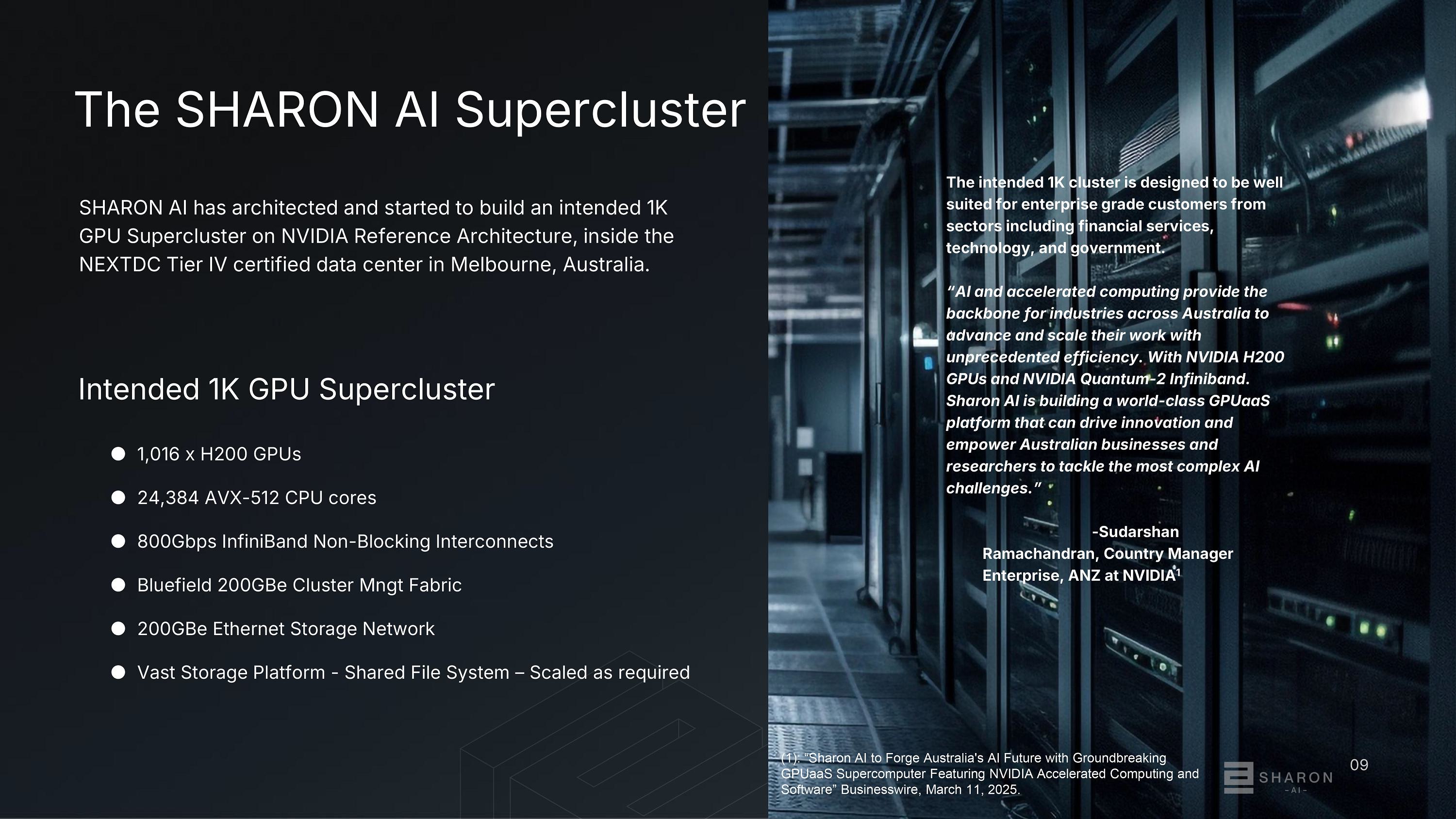 The SHARON AI Supercluster SHARON AI has architected and started to build an intended 1K GPU Supercluster on NVIDIA Reference Architecture, inside the NEXTDC Tier IV certified data center in Melbourne, Australia. Intended 1K GPU Supercluster ● 1,016 x H200 GPUs ● 24,384 AVX - 512 CPU cores ● 800Gbps InfiniBand Non - Blocking Interconnects ● Bluefield 200GBe Cluster Mngt Fabric ● 200GBe Ethernet Storage Network ● Vast Storage Platform - Shared File System – Scaled as required 09 The intended 1K cluster is designed to be well suited for enterprise grade customers from sectors including financial services, technology, and government. “AI and accelerated computing provide the backbone for industries across Australia to advance and scale their work with unprecedented efficiency. With NVIDIA H200 GPUs and NVIDIA Quantum - 2 Infiniband. Sharon AI is building a world - class GPUaaS platform that can drive innovation and empower Australian businesses and researchers to tackle the most complex AI challenges.” - Sudarshan Ramachandran, Country Manager Enterprise, ANZ at NVIDIA 1 (1): “Sharon AI to Forge Australia's AI Future with Groundbreaking GPUaaS Supercomputer Featuring NVIDIA Accelerated Computing and Software” Businesswire, March 11, 2025.
