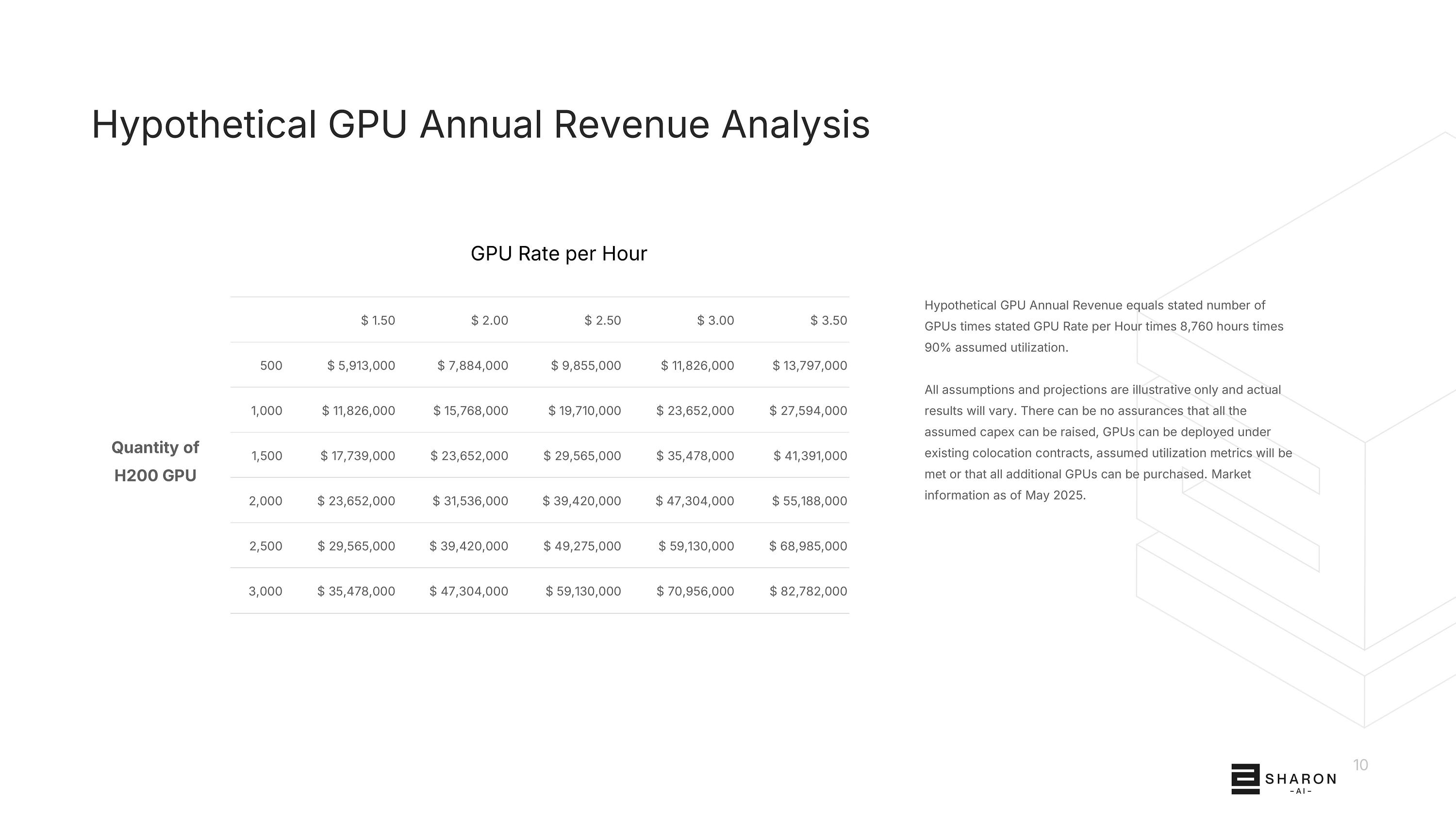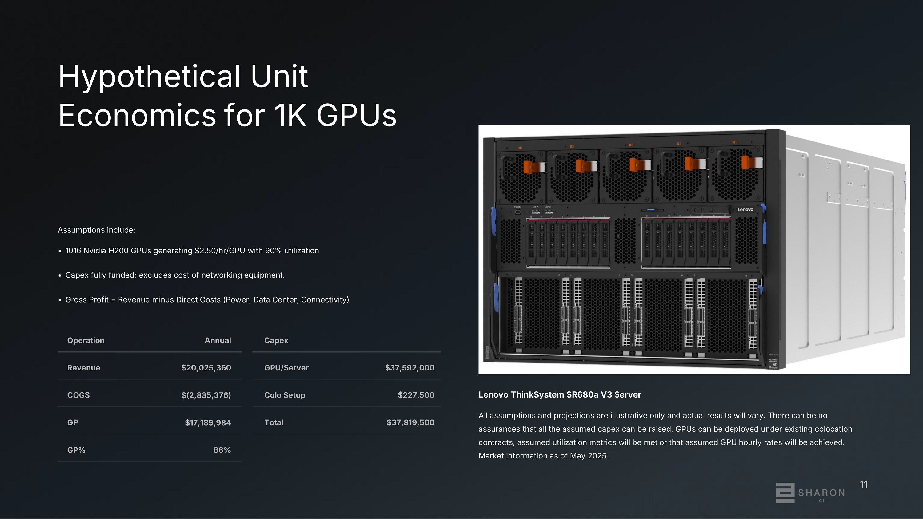 Hypothetical GPU Annual Revenue Analysis GPU Rate per Hour $ 1.50 $ 2.00 $ 2.50 $ 3.00 $ 3.50 Quantity of H200 GPU 500 $ 5,913,000 $ 7,884,000 $ 9,855,000 $ 11,826,000 $ 13,797,000 1,000 $ 11,826,000 $ 15,768,000 $ 19,710,000 $ 23,652,000 $ 27,594,000 1,500 $ 17,739,000 $ 23,652,000 $ 29,565,000 $ 35,478,000 $ 41,391,000 2,000 $ 23,652,000 $ 31,536,000 $ 39,420,000 $ 47,304,000 $ 55,188,000 2,500 $ 29,565,000 $ 39,420,000 $ 49,275,000 $ 59,130,000 $ 68,985,000 3,000 $ 35,478,000 $ 47,304,000 $ 59,130,000 $ 70,956,000 $ 82,782,000 Hypothetical GPU Annual Revenue equals stated number of GPUs times stated GPU Rate per Hour times 8,760 hours times 90% assumed utilization. All assumptions and projections are illustrative only and actual results will vary. There can be no assurances that all the assumed capex can be raised, GPUs can be deployed under existing colocation contracts, assumed utilization metrics will be met or that all additional GPUs can be purchased. Market information as of May 2025. 10