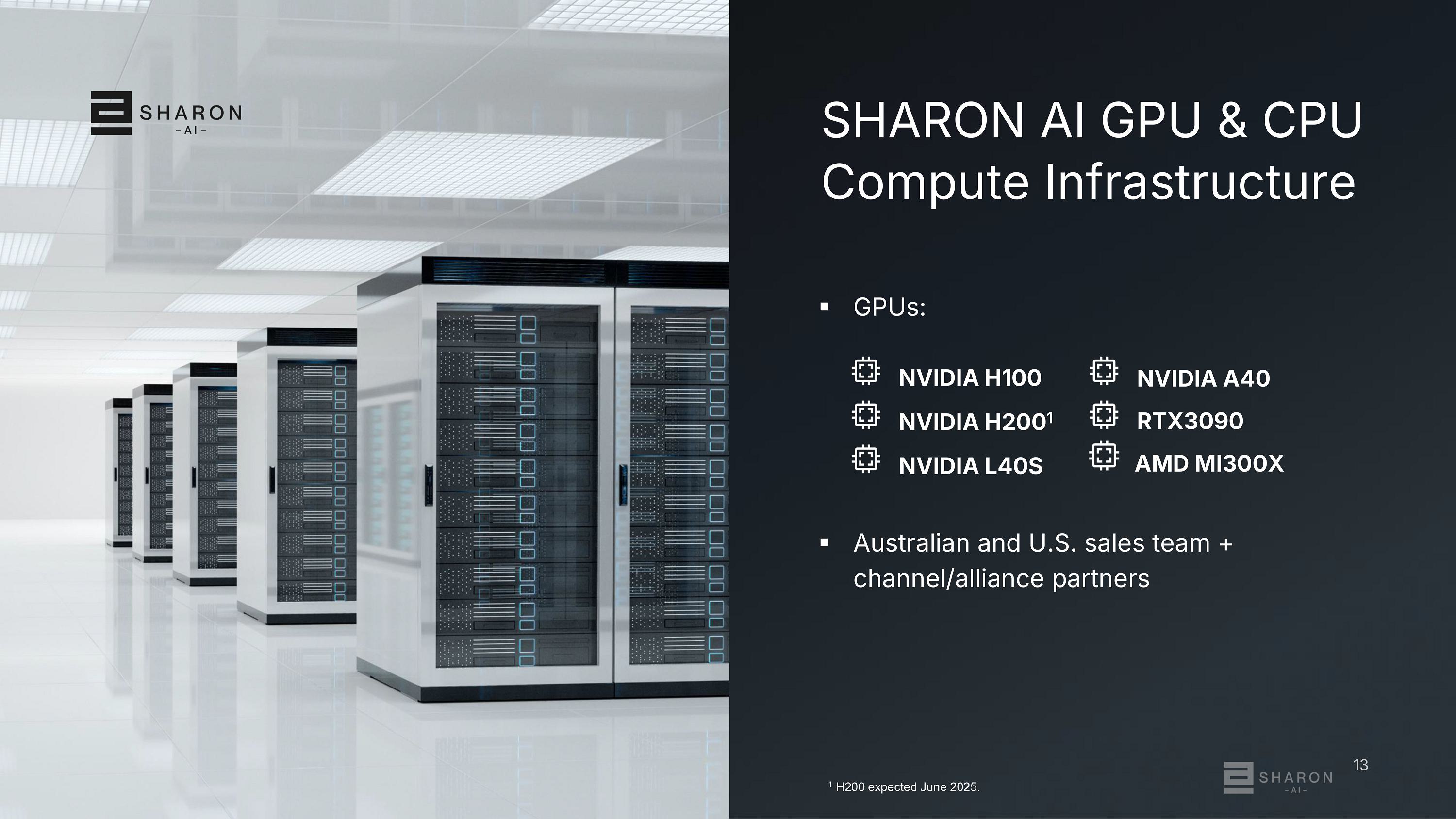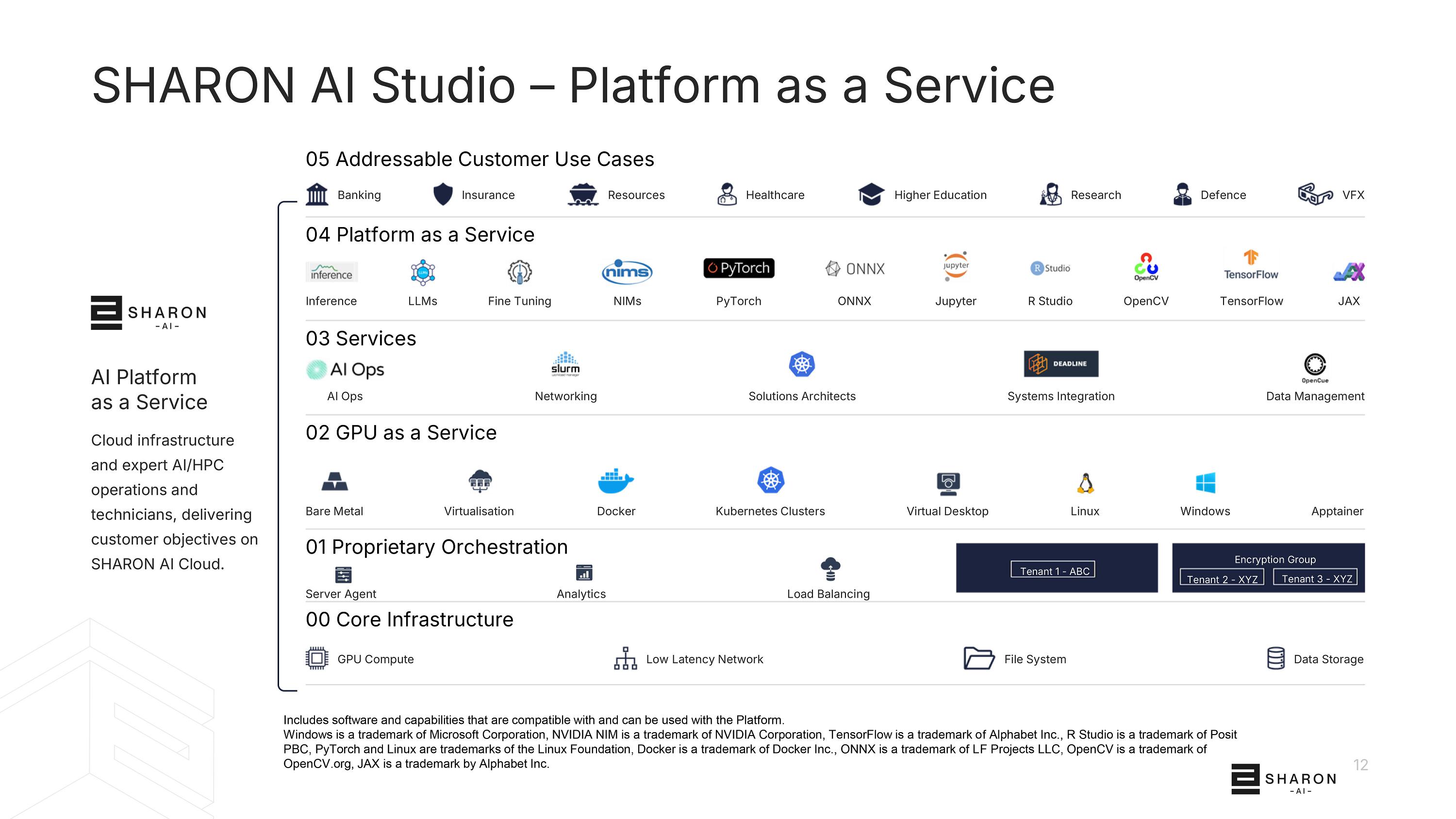 SHARON AI Studio – Platform as a Service 05 Addressable Customer Use Cases Banking Insurance Resources Healthcare Higher Education Research Defence VFX 04 Platform as a Service Inference LLMs Fine Tuning NIMs PyTorch ONNX Jupyter R Studio OpenCV TensorFlow JAX 03 Services AI Ops Networking Solutions Architects Systems Integration Data Management 02 GPU as a Service Bare Metal Virtualisation Docker Kubernetes Clusters Virtual Desktop Linux Windows Apptainer 01 Proprietary Orchestration Server Agent Analytics Load Balancing Tenant 1 - ABC Encryption Group Tenant 3 - XYZ Tenant 2 - XYZ 00 Core Infrastructure GPU Compute Low Latency Network File System Data Storage AI Platform as a Service Cloud infrastructure and expert AI/HPC operations and technicians, delivering customer objectives on SHARON AI Cloud. Includes software and capabilities that are compatible with and can be used with the Platform. Windows is a trademark of Microsoft Corporation, NVIDIA NIM is a trademark of NVIDIA Corporation, TensorFlow is a trademark o f A lphabet Inc., R Studio is a trademark of Posit PBC, PyTorch and Linux are trademarks of the Linux Foundation, Docker is a trademark of Docker Inc., ONNX is a trademark of L F P rojects LLC, OpenCV is a trademark of OpenCV.org, JAX is a trademark by Alphabet Inc. 12
