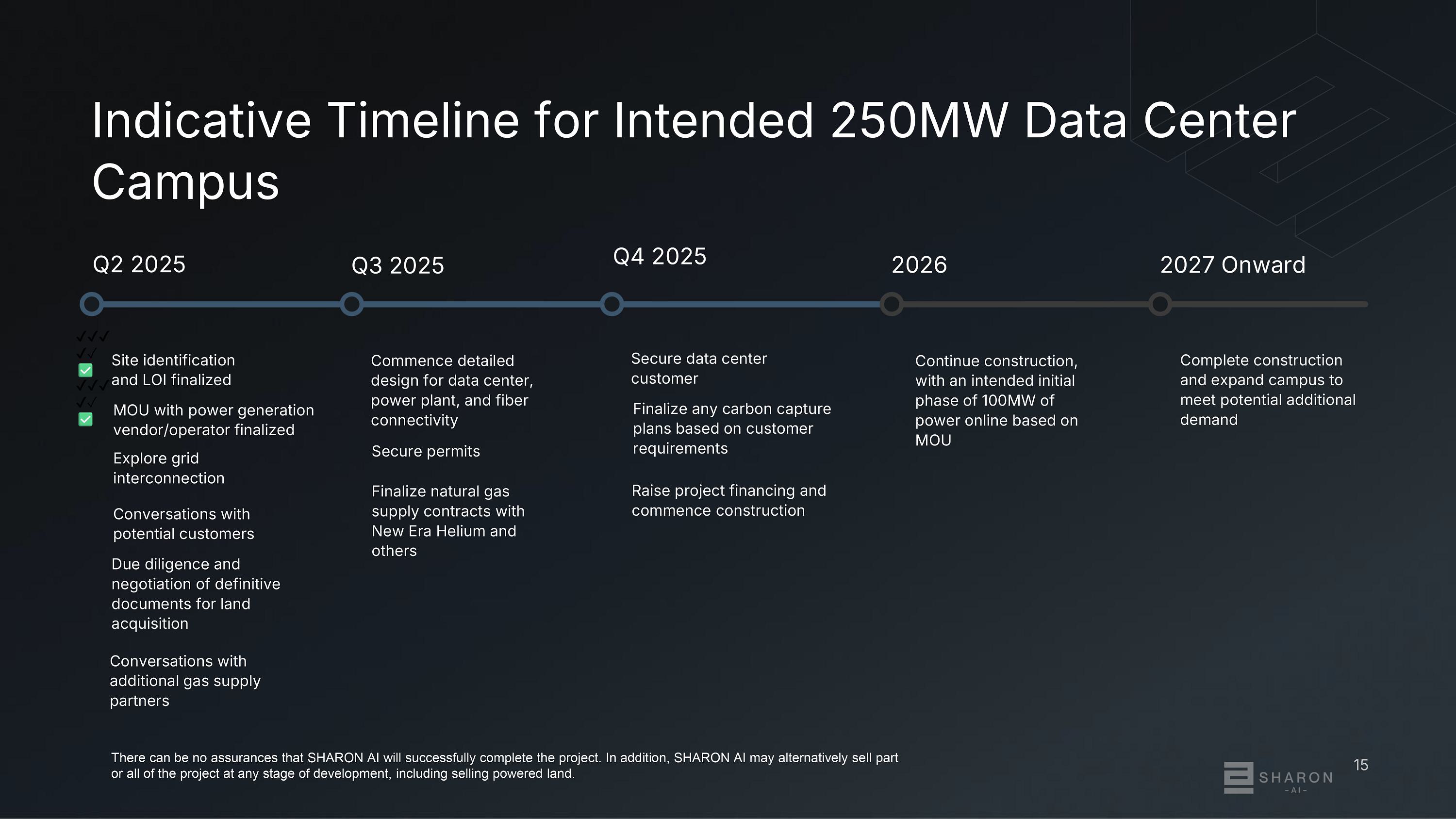 Indicative Timeline for Intended 250MW Data Center Campus Q2 2025 Site identification and LOI finalized Due diligence and negotiation of definitive documents for land acquisition Commence detailed design for data center, power plant, and fiber connectivity Q3 2025 Q4 2025 2026 2027 Onward Secure permits Secure data center customer Finalize natural gas supply contracts with New Era Helium and others Conversations with potential customers Continue construction, with an intended initial phase of 100MW of power online based on MOU Complete construction and expand campus to meet potential additional demand MOU with power generation vendor/operator finalized Raise project financing and commence construction Finalize any carbon capture plans based on customer requirements 15 There can be no assurances that SHARON AI will successfully complete the project. In addition, SHARON AI may alternatively se ll part or all of the project at any stage of development, including selling powered land. Conversations with additional gas supply partners ✓ Explore grid interconnection ✓
