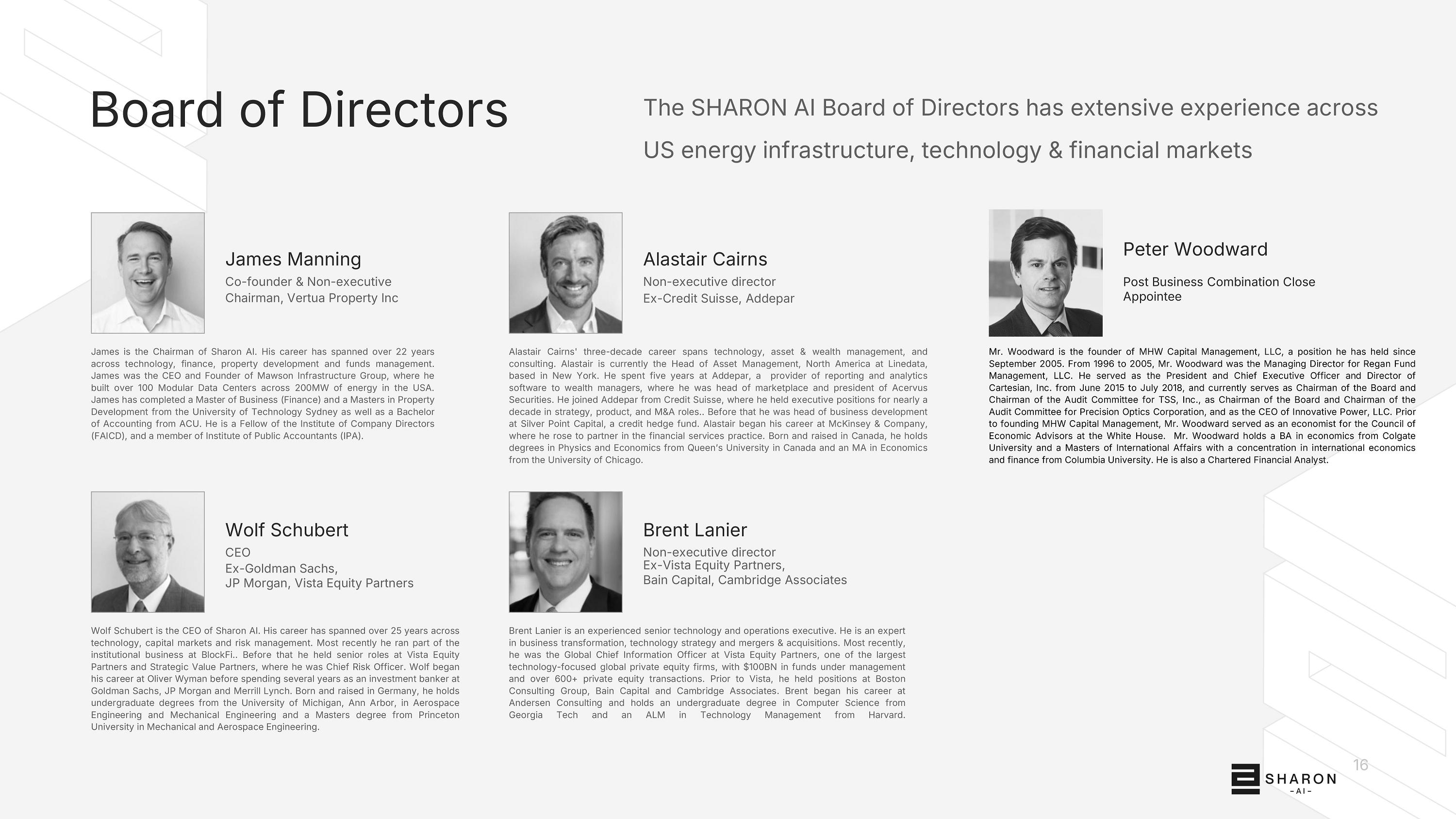 James is the Chairman of Sharon AI . His career has spanned over 22 years across technology, finance, property development and funds management . James was the CEO and Founder of Mawson Infrastructure Group, where he built over 100 Modular Data Centers across 200 MW of energy in the USA . James has completed a Master of Business (Finance) and a Masters in Property Development from the University of Technology Sydney as well as a Bachelor of Accounting from ACU . He is a Fellow of the Institute of Company Directors (FAICD), and a member of Institute of Public Accountants (IPA) . James Manning Co - founder & Non - executive Chairman, Vertua Property Inc Mr . Woodward is the founder of MHW Capital Management, LLC, a position he has held since September 2005 . From 1996 to 2005 , Mr . Woodward was the Managing Director for Regan Fund Management, LLC . He served as the President and Chief Executive Officer and Director of Cartesian, Inc . from June 2015 to July 2018 , and currently serves as Chairman of the Board and Chairman of the Audit Committee for TSS, Inc . , as Chairman of the Board and Chairman of the Audit Committee for Precision Optics Corporation, and as the CEO of Innovative Power, LLC . Prior to founding MHW Capital Management, Mr . Woodward served as an economist for the Council of Economic Advisors at the White House . Mr . Woodward holds a BA in economics from Colgate University and a Masters of International Affairs with a concentration in international economics and finance from Columbia University . He is also a Chartered Financial Analyst . Peter Woodward Post Business Combination Close Appointee Wolf Schubert is the CEO of Sharon AI . His career has spanned over 25 years across technology, capital markets and risk management . Most recently he ran part of the institutional business at BlockFi .. Before that he held senior roles at Vista Equity Partners and Strategic Value Partners, where he was Chief Risk Officer . Wolf began his career at Oliver Wyman before spending several years as an investment banker at Goldman Sachs, JP Morgan and Merrill Lynch . Born and raised in Germany, he holds undergraduate degrees from the University of Michigan, Ann Arbor, in Aerospace Engineering and Mechanical Engineering and a Masters degree from Princeton University in Mechanical and Aerospace Engineering . Wolf Schubert CEO Ex - Goldman Sachs, JP Morgan, Vista Equity Partners Alastair Cairns' three - decade career spans technology, asset & wealth management, and consulting . Alastair is currently the Head of Asset Management, North America at Linedata, based in New York . He spent five years at Addepar, a provider of reporting and analytics software to wealth managers, where he was head of marketplace and president of Acervus Securities . He joined Addepar from Credit Suisse, where he held executive positions for nearly a decade in strategy, product, and M&A roles .. Before that he was head of business development at Silver Point Capital, a credit hedge fund . Alastair began his career at McKinsey & Company, where he rose to partner in the financial services practice . Born and raised in Canada, he holds degrees in Physics and Economics from Queen’s University in Canada and an MA in Economics from the University of Chicago . Alastair Cairns Non - executive director Ex - Credit Suisse, Addepar Brent Lanier is an experienced senior technology and operations executive . He is an expert in business transformation, technology strategy and mergers & acquisitions . Most recently, he was the Global Chief Information Officer at Vista Equity Partners, one of the largest technology - focused global private equity firms, with $ 100 BN in funds under management and over 600 + private equity transactions . Prior to Vista, he held positions at Boston Consulting Group, Bain Capital and Cambridge Associates . Brent began his career at Andersen Consulting and holds an undergraduate degree in Computer Science from Georgia Tech and an ALM in Technology Management from Harvard . Brent Lanier Non - executive director Ex - Vista Equity Partners, Bain Capital, Cambridge Associates The SHARON AI Board of Directors has extensive experience across US energy infrastructure, technology & financial markets Board of Directors 16