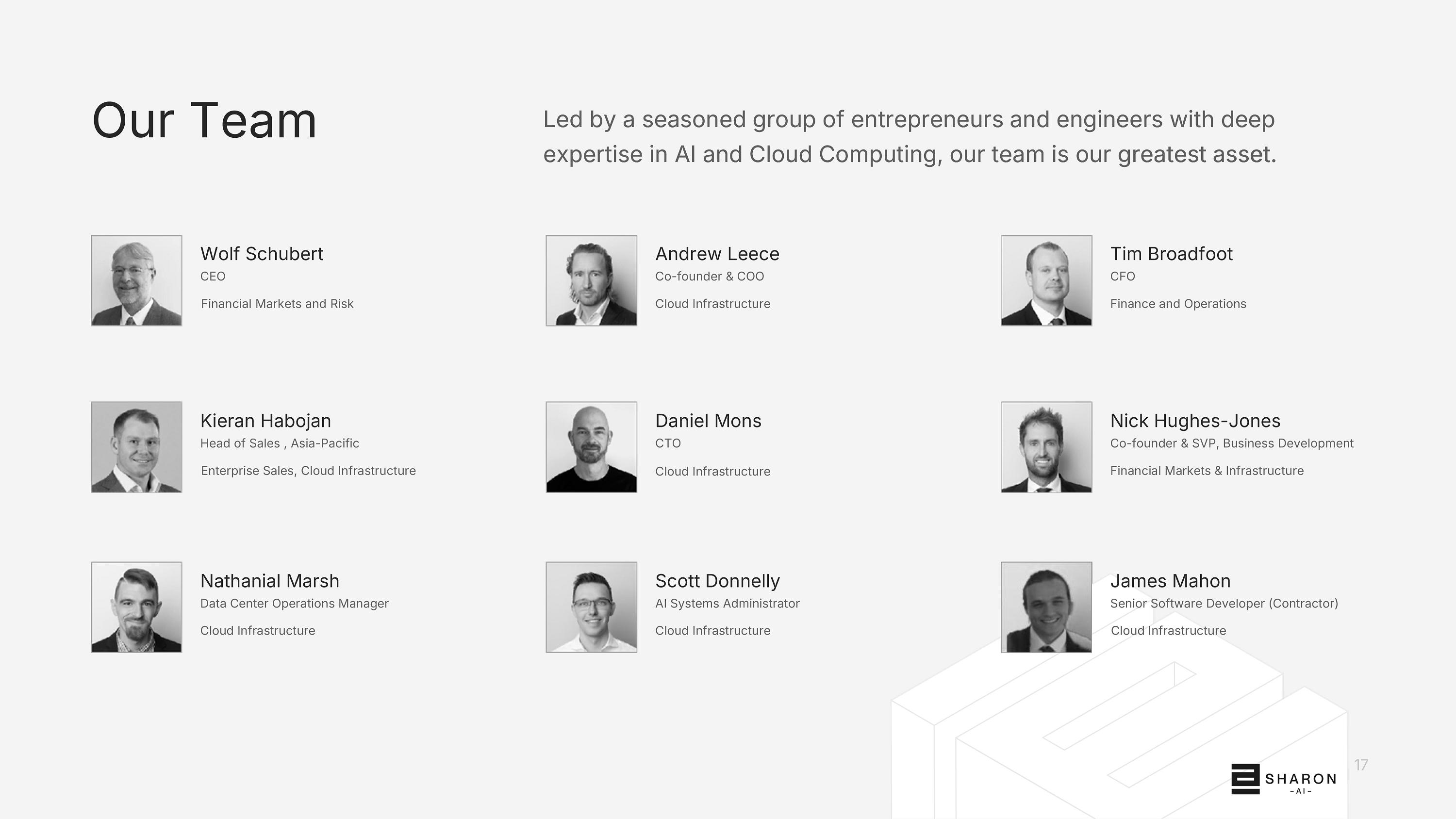 Led by a seasoned group of entrepreneurs and engineers with deep expertise in AI and Cloud Computing, our team is our greatest asset. Daniel Mons Led by a seasoned group of entrepreneurs and engineers with deep expertise in AI and Cloud Computing, our team is our greatest asset. Wolf Schubert CEO Financial Markets and Risk Andrew Leece Co - founder & COO Cloud Infrastructure Tim Broadfoot CFO Finance and Operations Kieran Habojan Head of Sales , Asia - Pacific Enterprise Sales, Cloud Infrastructure Daniel Mons CTO Cloud Infrastructure Nick Hughes - Jones Co - founder & SVP, Business Development Financial Markets & Infrastructure Nathanial Marsh Data Center Operations Manager Cloud Infrastructure Scott Donnelly AI Systems Administrator Cloud Infrastructure James Mahon Senior Software Developer (Contractor) Cloud Infrastructure Our Team 17