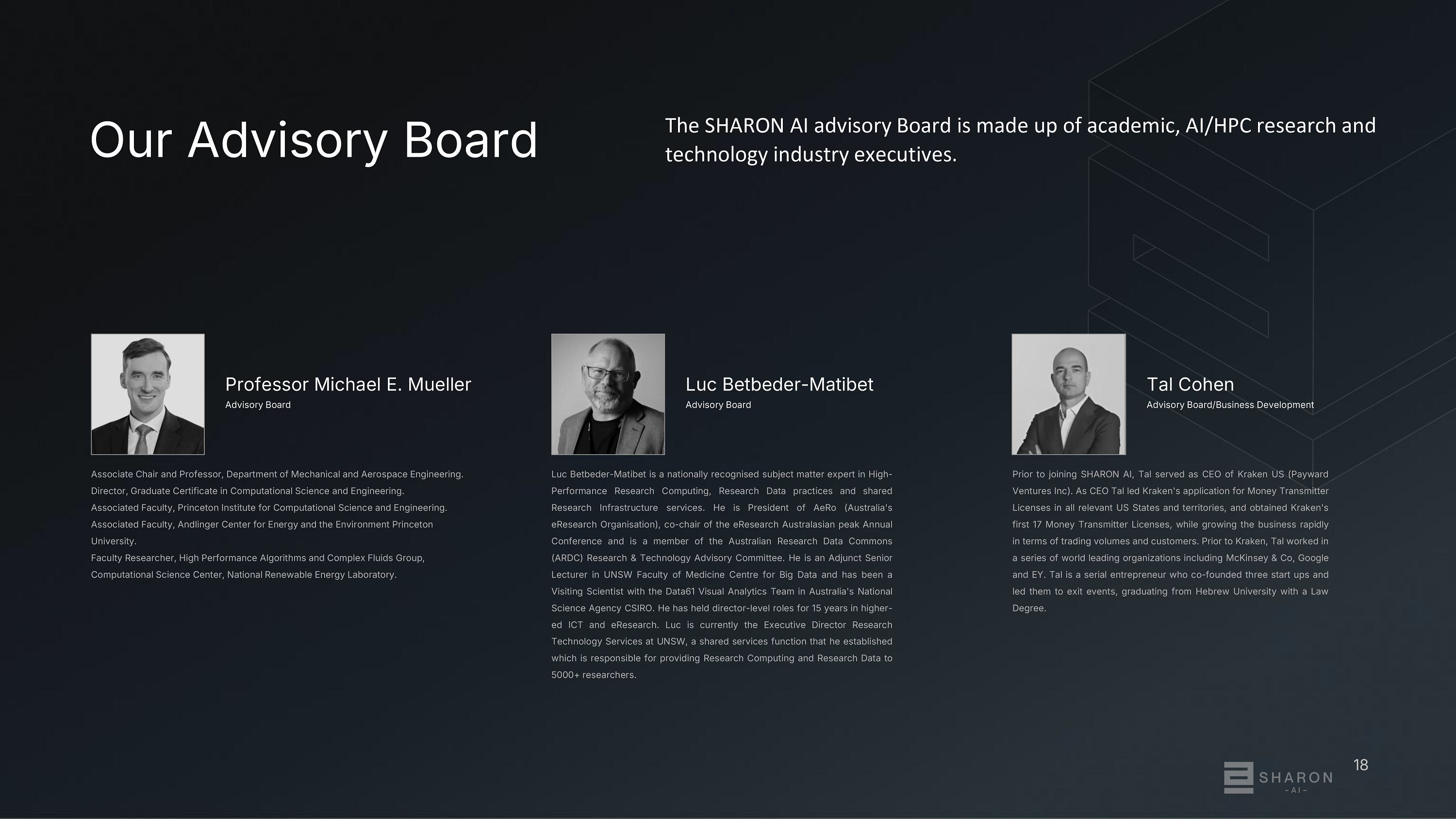 Our Advisory Board Associate Chair and Professor, Department of Mechanical and Aerospace Engineering. Director, Graduate Certificate in Computational Science and Engineering. Associated Faculty, Princeton Institute for Computational Science and Engineering. Associated Faculty, Andlinger Center for Energy and the Environment Princeton University. Faculty Researcher, High Performance Algorithms and Complex Fluids Group, Computational Science Center, National Renewable Energy Laboratory. Luc Betbeder - Matibet is a nationally recognised subject matter expert in High - Performance Research Computing, Research Data practices and shared Research Infrastructure services . He is President of AeRo (Australia's eResearch Organisation), co - chair of the eResearch Australasian peak Annual Conference and is a member of the Australian Research Data Commons (ARDC) Research & Technology Advisory Committee . He is an Adjunct Senior Lecturer in UNSW Faculty of Medicine Centre for Big Data and has been a Visiting Scientist with the Data 61 Visual Analytics Team in Australia's National Science Agency CSIRO . He has held director - level roles for 15 years in higher - ed ICT and eResearch . Luc is currently the Executive Director Research Technology Services at UNSW, a shared services function that he established which is responsible for providing Research Computing and Research Data to 5000 + researchers . Prior to joining SHARON AI, Tal served as CEO of Kraken US (Payward Ventures Inc) . As CEO Tal led Kraken's application for Money Transmitter Licenses in all relevant US States and territories, and obtained Kraken's first 17 Money Transmitter Licenses, while growing the business rapidly in terms of trading volumes and customers . Prior to Kraken, Tal worked in a series of world leading organizations including McKinsey & Co, Google and EY . Tal is a serial entrepreneur who co - founded three start ups and led them to exit events, graduating from Hebrew University with a Law Degree . Professor Michael E. Mueller Advisory Board Luc Betbeder - Matibet Advisory Board Tal Cohen Advisory Board/Business Development The SHARON AI advisory Board is made up of academic, AI/HPC research and technology industry executives. 18