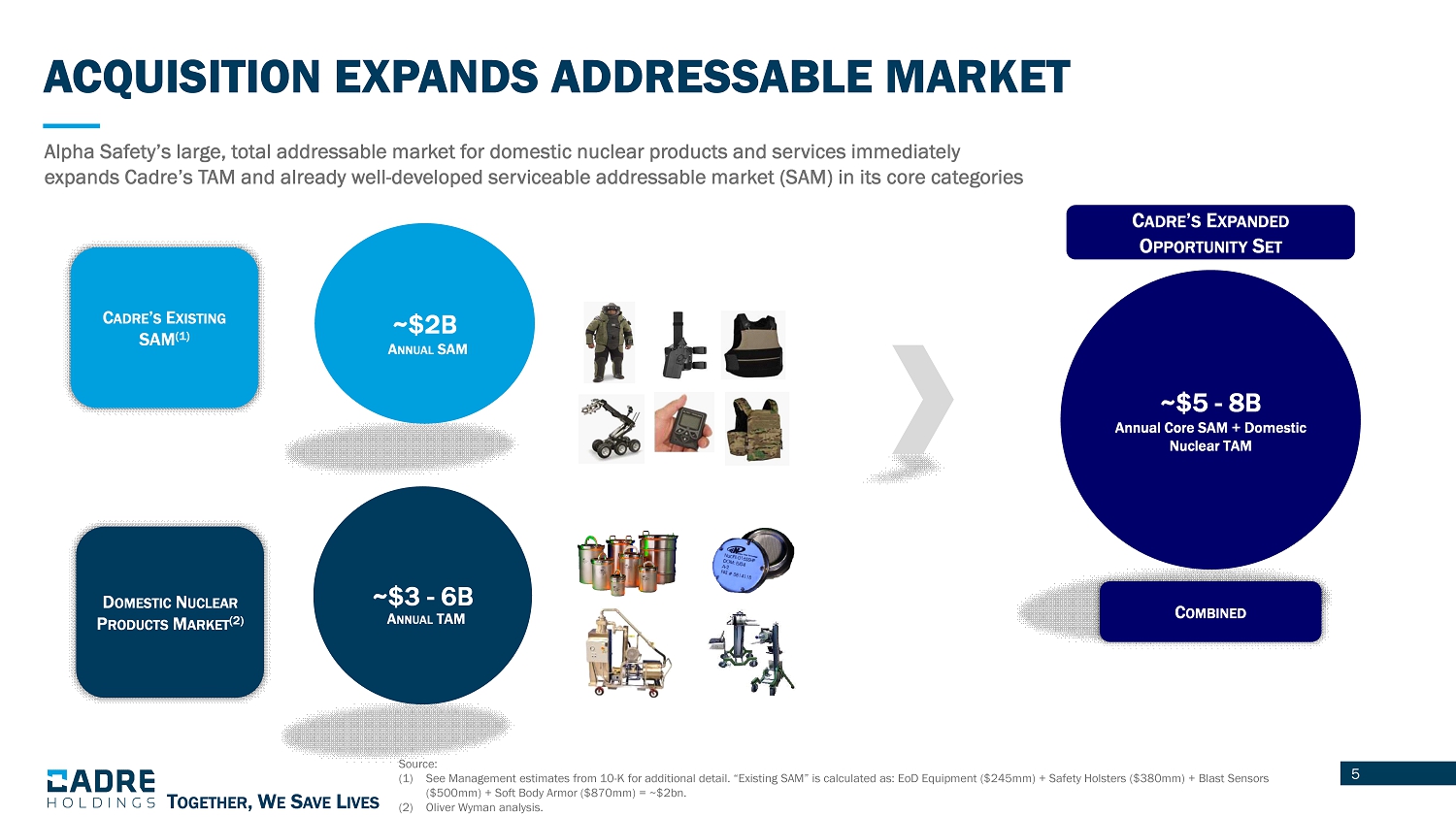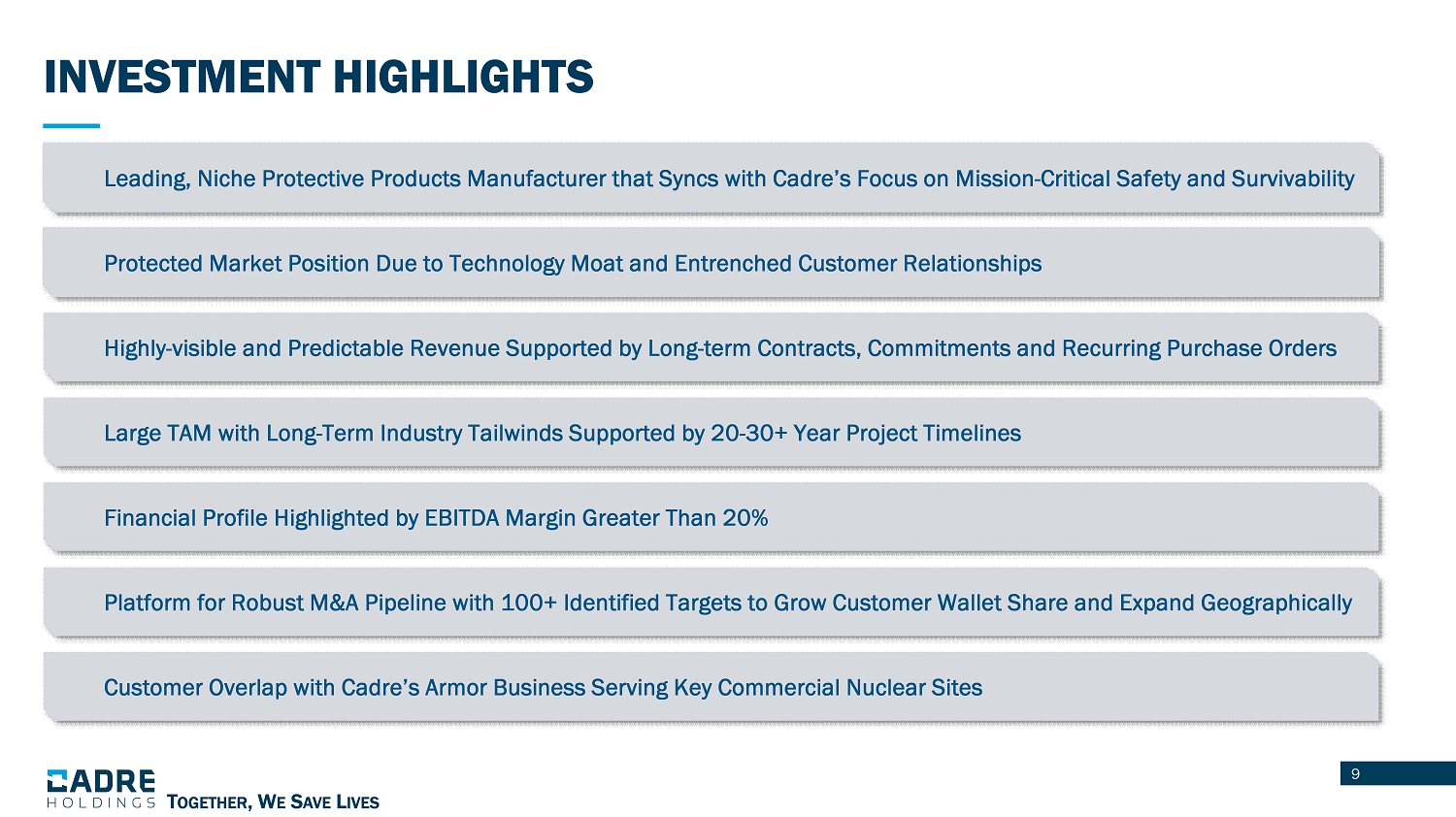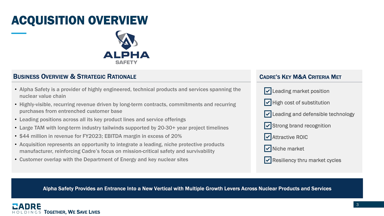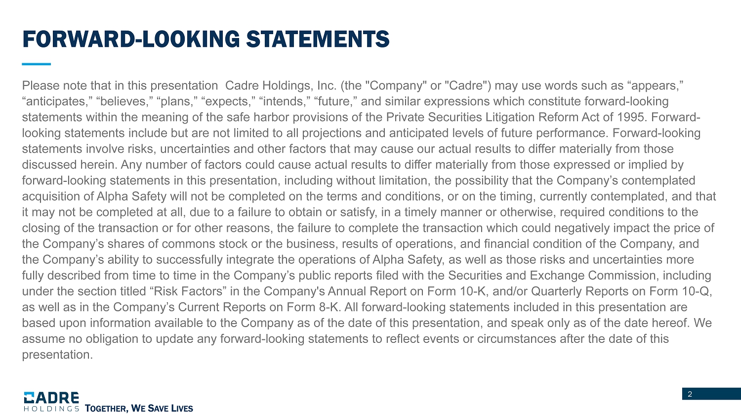 2 FORWARD - LOOKING STATEMENTS Please note that in this presentation Cadre Holdings, Inc. (the "Company" or "Cadre") may use words such as “appears,” “anticipates,” “believes,” “plans,” “expects,” “intends,” “future,” and similar expressions which constitute forward - looking statements within the meaning of the safe harbor provisions of the Private Securities Litigation Reform Act of 1995. Forward - looking statements include but are not limited to all projections and anticipated levels of future performance. Forward - looking statements involve risks, uncertainties and other factors that may cause our actual results to differ materially from those discussed herein. Any number of factors could cause actual results to differ materially from those expressed or implied by forward - looking statements in this presentation, including without limitation, the possibility that the Company’s contemplated acquisition of Alpha Safety will not be completed on the terms and conditions, or on the timing, currently contemplated, and tha t it may not be completed at all, due to a failure to obtain or satisfy, in a timely manner or otherwise, required conditions t o t he closing of the transaction or for other reasons, the failure to complete the transaction which could negatively impact the pr ice of the Company’s shares of commons stock or the business, results of operations, and financial condition of the Company, and the Company’s ability to successfully integrate the operations of Alpha Safety, as well as those risks and uncertainties more fully described from time to time in the Company’s public reports filed with the Securities and Exchange Commission, includin g under the section titled “Risk Factors” in the Company's Annual Report on Form 10 - K, and/or Quarterly Reports on Form 10 - Q, as well as in the Company’s Current Reports on Form 8 - K. All forward - looking statements included in this presentation are based upon information available to the Company as of the date of this presentation, and speak only as of the date hereof. We assume no obligation to update any forward - looking statements to reflect events or circumstances after the date of this presentation. T OGETHER , W E S AVE L IVES