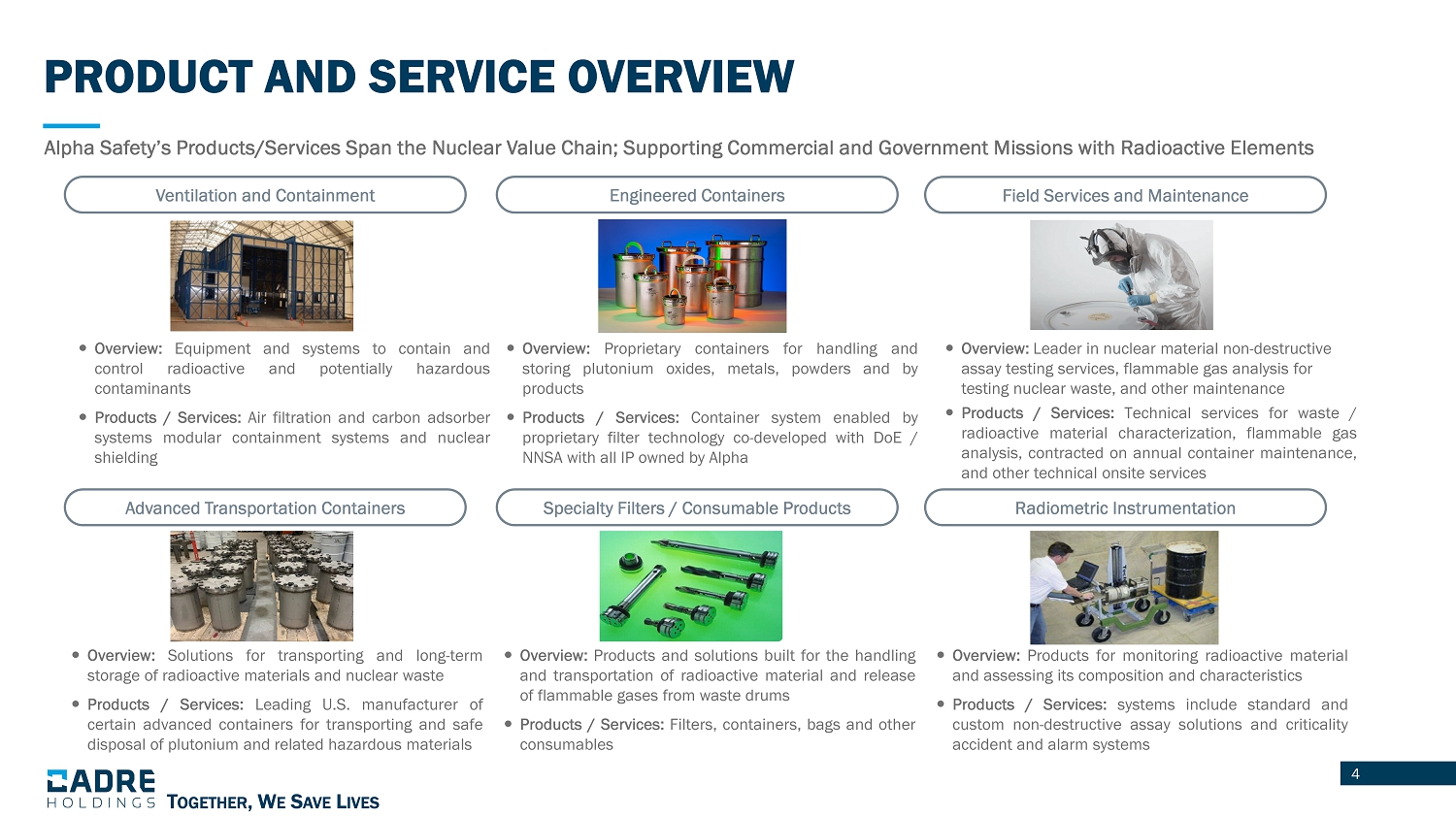 3 3 Source: Internal Company forecasts ACQUISITION OVERVIEW T OGETHER , W E S AVE L IVES Alpha Safety Provides an Entrance Into a New Vertical with Multiple Growth Levers Across Nuclear Products and Services B USINESS O VERVIEW & S TRATEGIC R ATIONALE • Leading market position • High cost of substitution • Leading and defensible technology • Strong brand recognition • Attractive ROIC • Niche market • Resiliency thru market cycles C ADRE ’ S K EY M&A C RITERIA M ET • Alpha Safety is a provider of highly engineered, technical products and services spanning the nuclear value chain • Highly - visible, recurring revenue driven by long - term contracts, commitments and recurring purchases from entrenched customer base • Leading positions across all its key product lines and service offerings • Large TAM with long - term industry tailwinds supported by 20 - 30+ year project timelines • $44 million in revenue for FY2023; EBITDA margin in excess of 20% • Acquisition represents an opportunity to integrate a leading, niche protective products manufacturer, reinforcing Cadre’s focus on mission - critical safety and survivability • Customer overlap with the Department of Energy and key nuclear sites