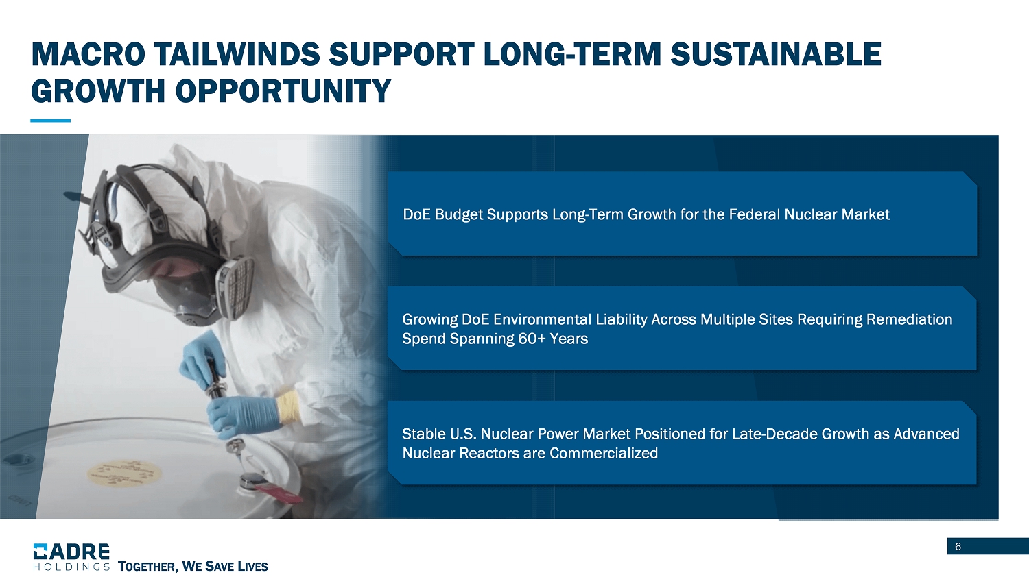 5 5 Source: Internal Company forecasts T OGETHER , W E S AVE L IVES ACQUISITION EXPANDS ADDRESSABLE MARKET Source: (1) See Management estimates from 10 - K for additional detail. “Existing SAM” is calculated as: EoD Equipment ($245mm) + Safety Holsters ($380mm) + Blast Sensors ($500mm) + Soft Body Armor ($870mm) = ~$2bn. (2) Oliver Wyman analysis. ~$2B A NNUAL SAM C ADRE ’ S E XISTING SAM (1) C ADRE ’ S E XPANDED O PPORTUNITY S ET ~$5 - 8B Annual Core SAM + Domestic Nuclear TAM C OMBINED ~$3 - 6B A NNUAL TAM D OMESTIC N UCLEAR P RODUCTS M ARKET (2) Alpha Safety’s large, total addressable market for domestic nuclear products and services immediately expands Cadre’s TAM and already well - developed serviceable addressable market (SAM) in its core categories