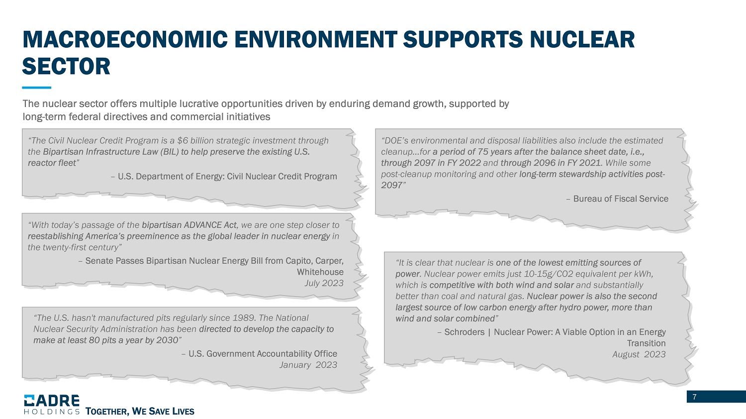 6 MACRO TAILWINDS SUPPORT LONG - TERM SUSTAINABLE GROWTH OPPORTUNITY T OGETHER , W E S AVE L IVES DoE Budget Supports Long - Term Growth for the Federal Nuclear Market Growing DoE Environmental Liability Across Multiple Sites Requiring Remediation Spend Spanning 60+ Years Stable U.S. Nuclear Power Market Positioned for Late - Decade Growth as Advanced Nuclear Reactors are Commercialized